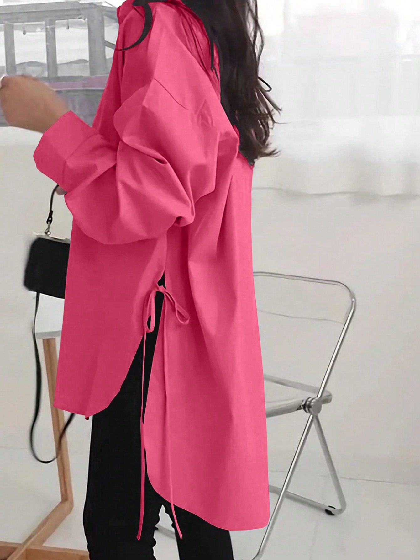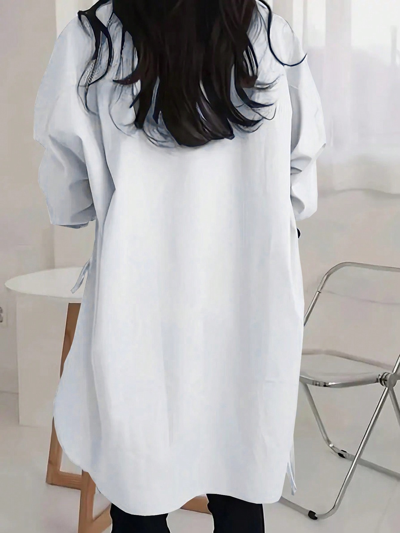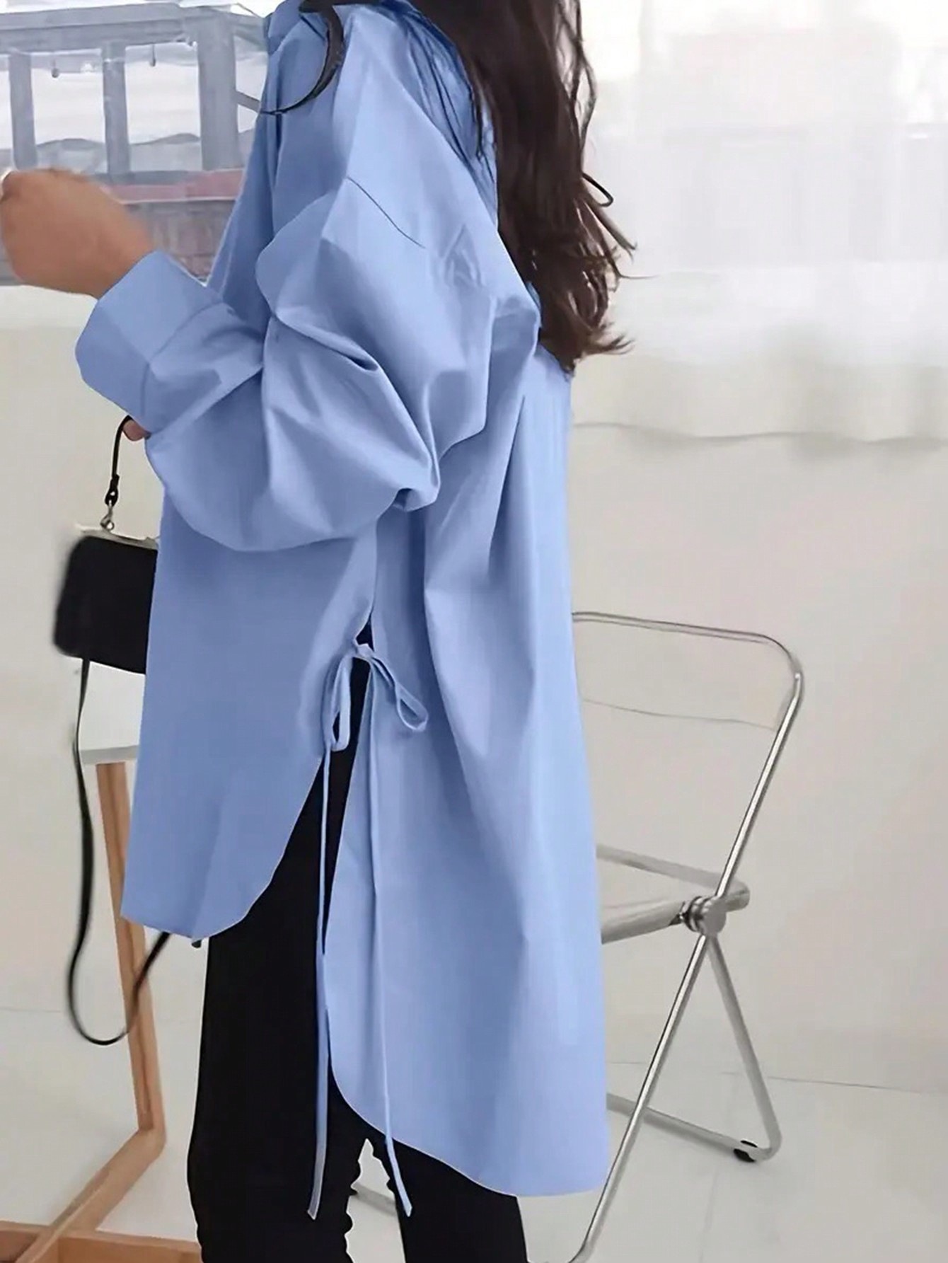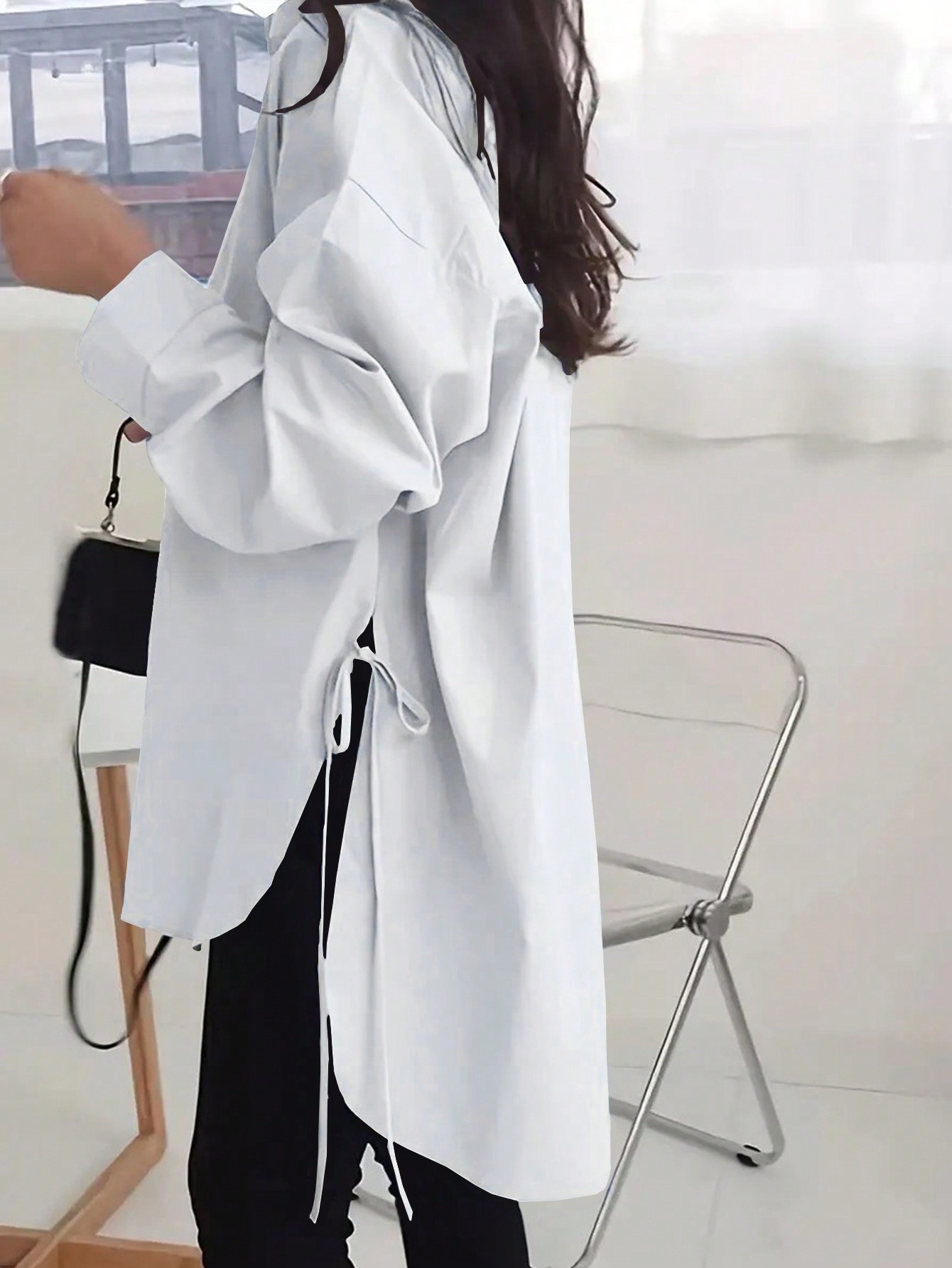 유럽과 미국의 대외 무역 여성 의류 아마존 AliExpress 새로운 여성의 이른 가을 느슨한 앞 짧은 뒤로 긴 레이스 업 슬림 셔츠스토어 가기