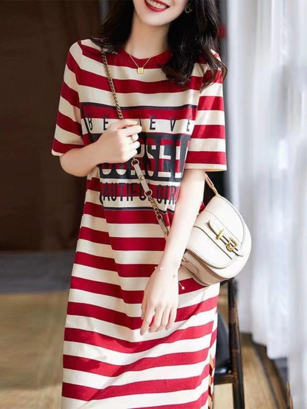 한국식 심플 라운드 넥 스트라이프 느슨한 반팔 어깨 티셔츠 여자 여름 게으른 캐주얼 올 매치 원피스 미드 길이 티셔츠스토어 가기