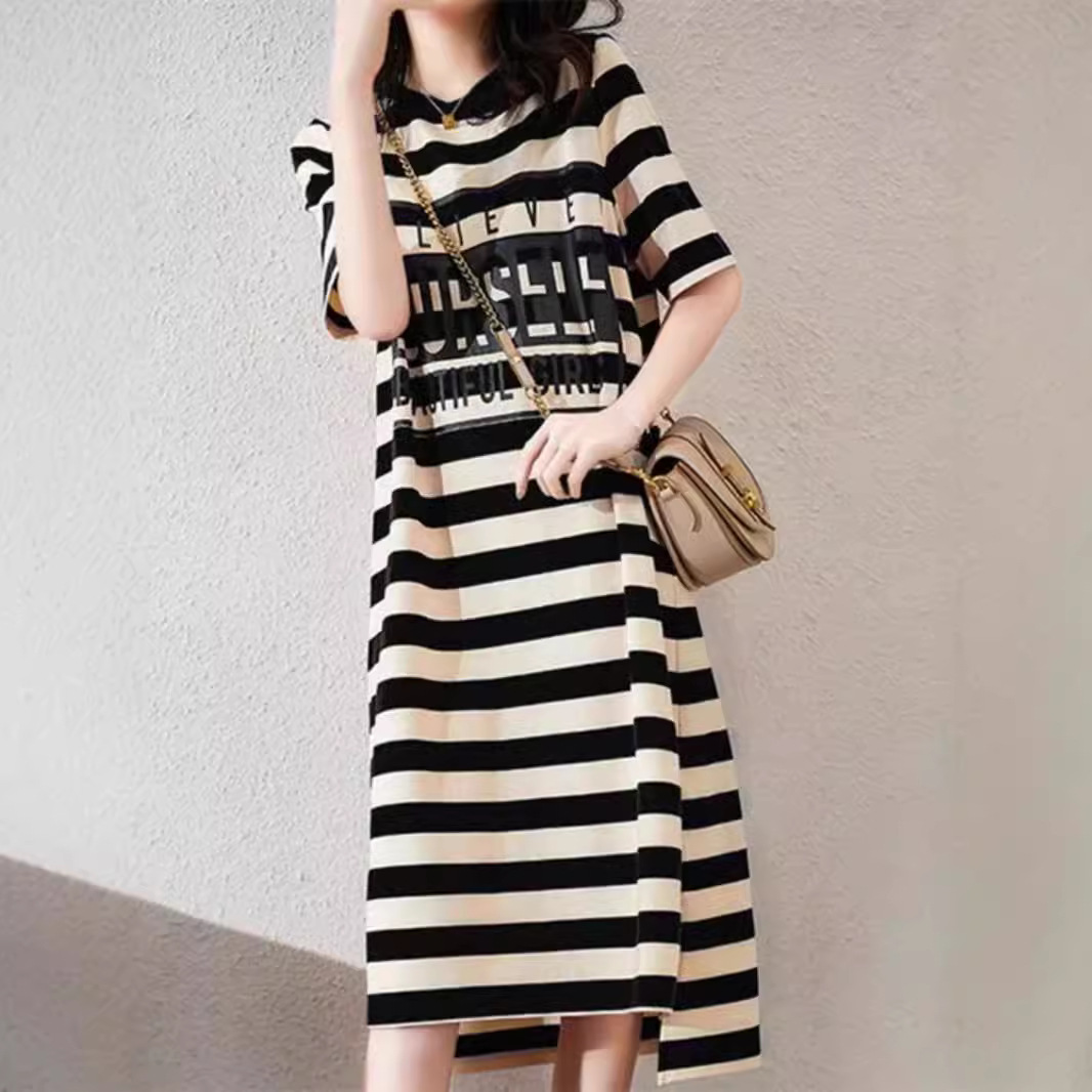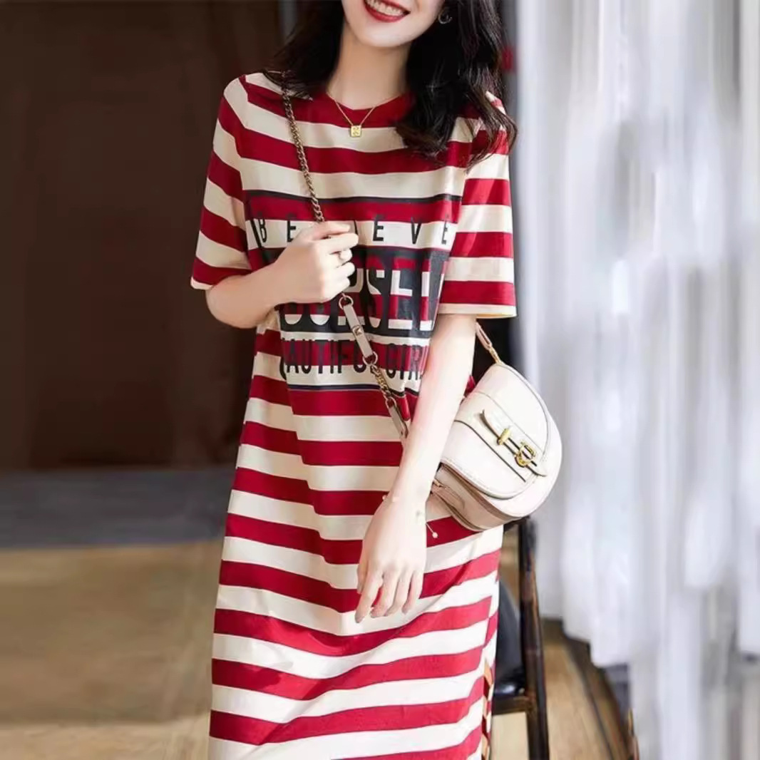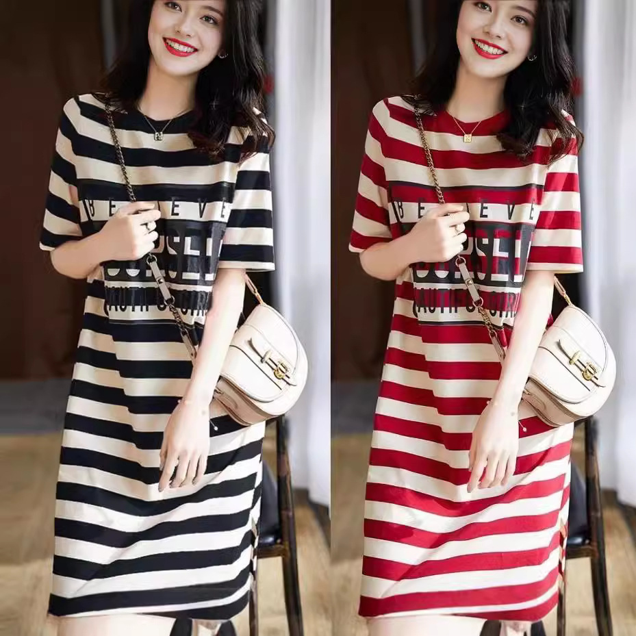 한국식 심플 라운드 넥 스트라이프 느슨한 반팔 어깨 티셔츠 여자 여름 게으른 캐주얼 올 매치 원피스 미드 길이 티셔츠