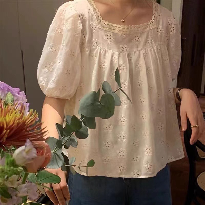 韩国东大门年夏季新款时尚方领重工蕾丝边镂空刺绣衬衫上衣女_杏
