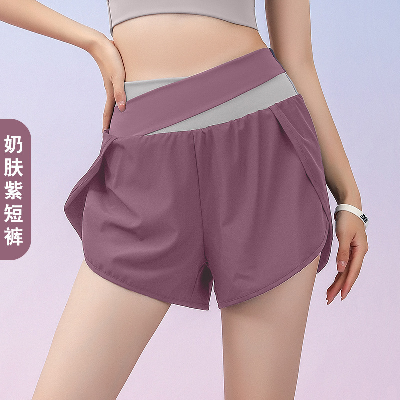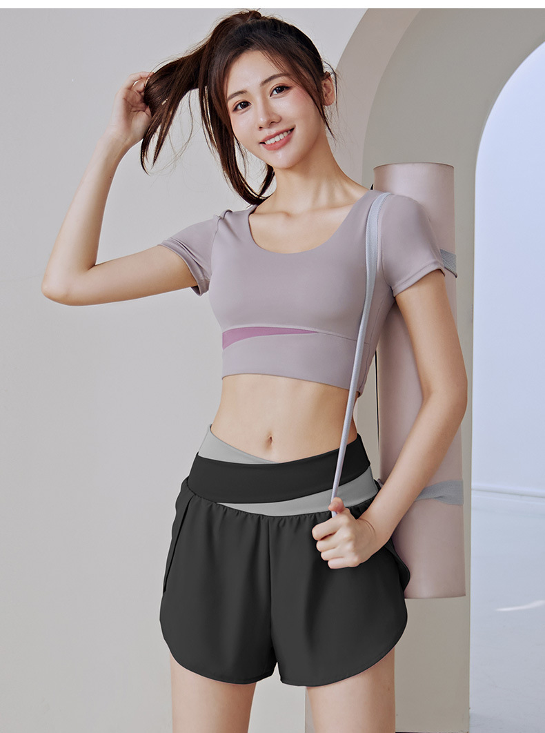 컬러 매칭 요가 의류 세트 하이 엔드 여름 알몸 스포츠 반팔 가짜 투피스 반바지 피트니스 의류 세트 여성스토어 가기