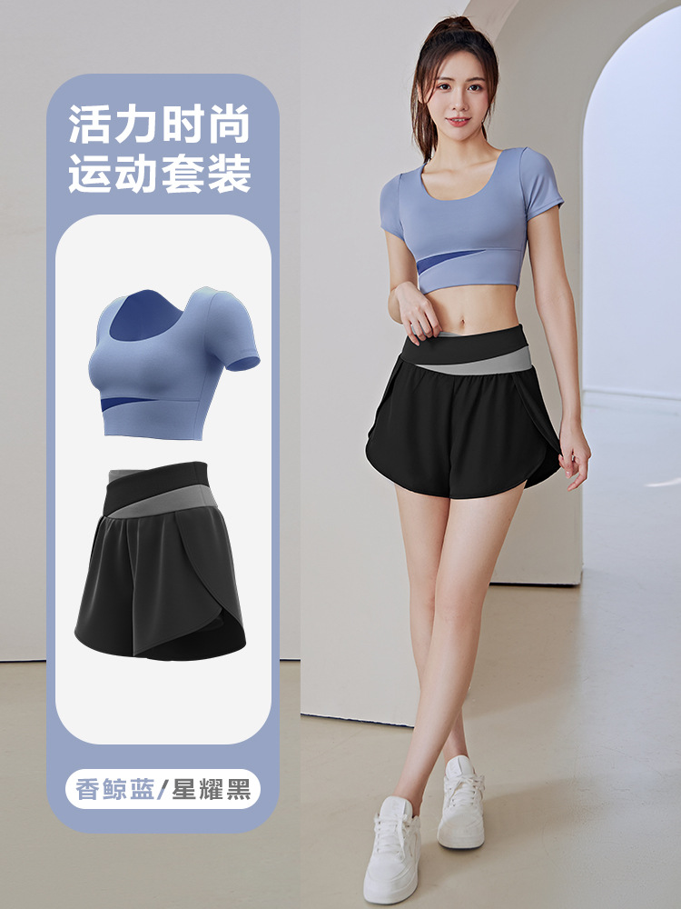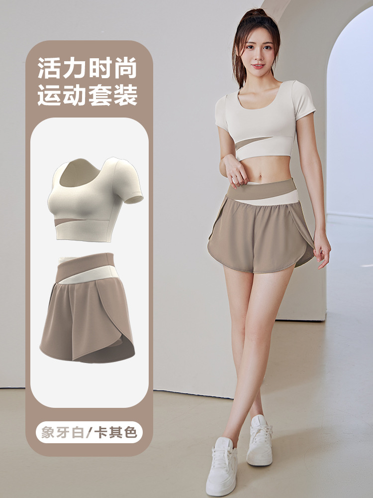 컬러 매칭 요가 의류 세트 하이 엔드 여름 알몸 스포츠 반팔 가짜 투피스 반바지 피트니스 의류 세트 여성