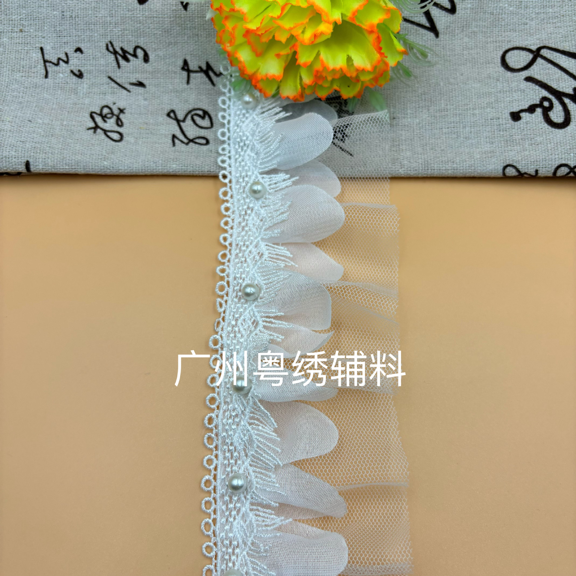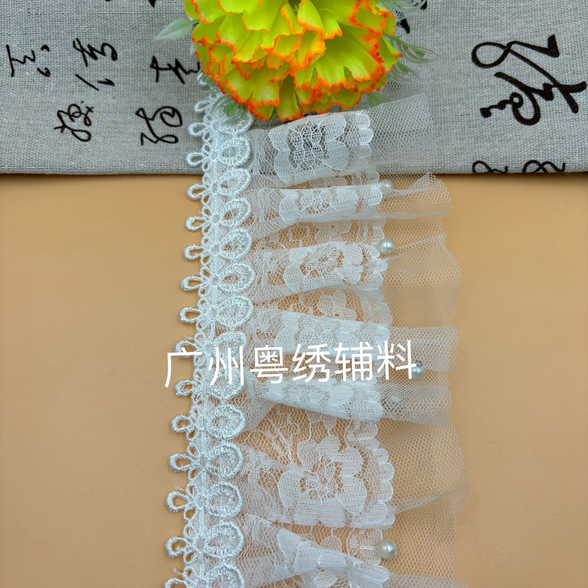 产品名称:牛奶丝雪纺蕾丝压褶钉珠花边