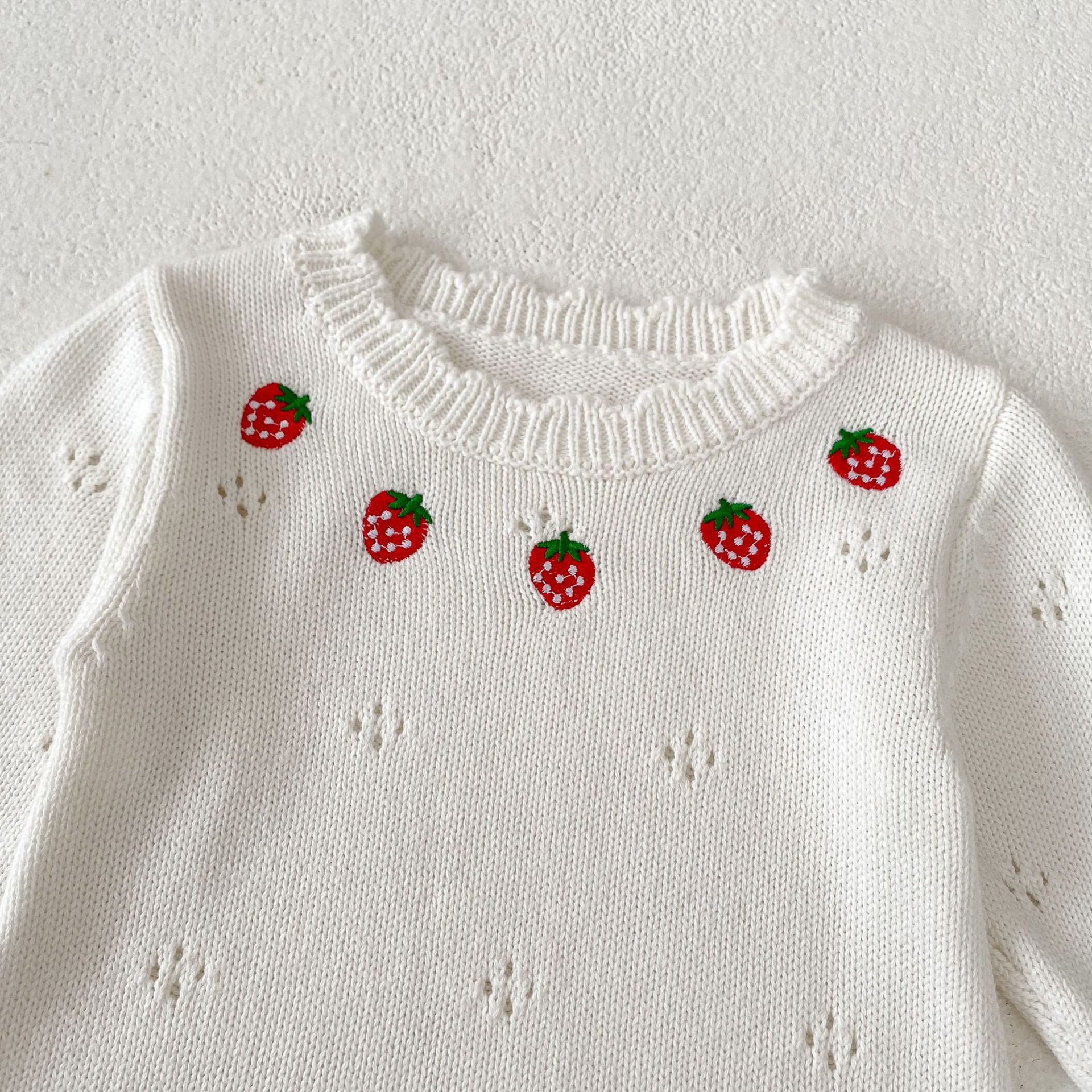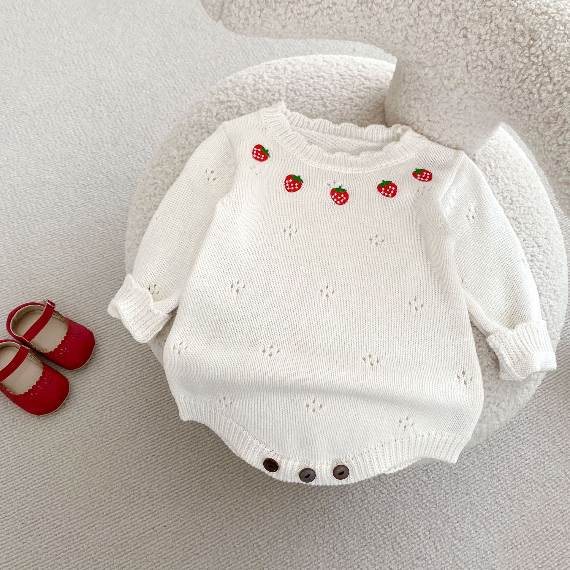 아기와 어린 아이들의 등반복 2024 가을 스웨터 아기 소녀 딸기 자수 긴 소매 니트 하하 옷 삼각형 가방 방귀 옷스토어 가기