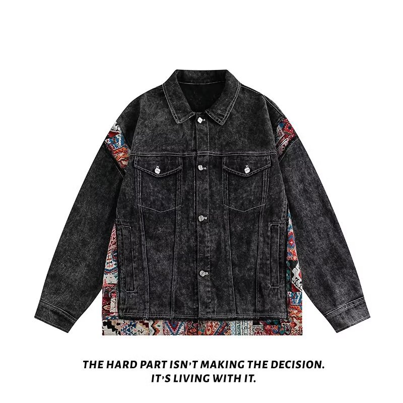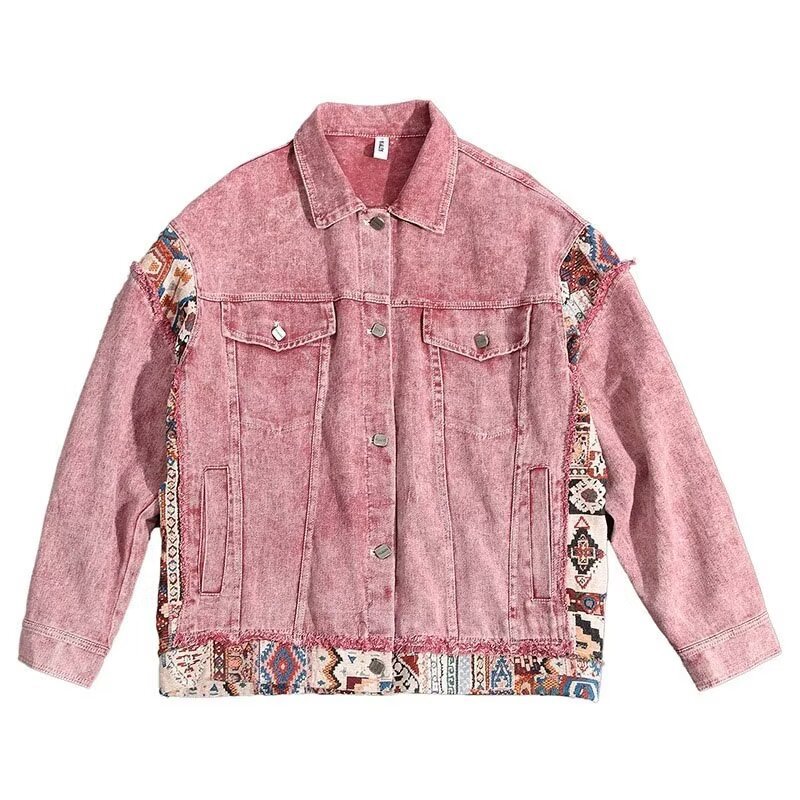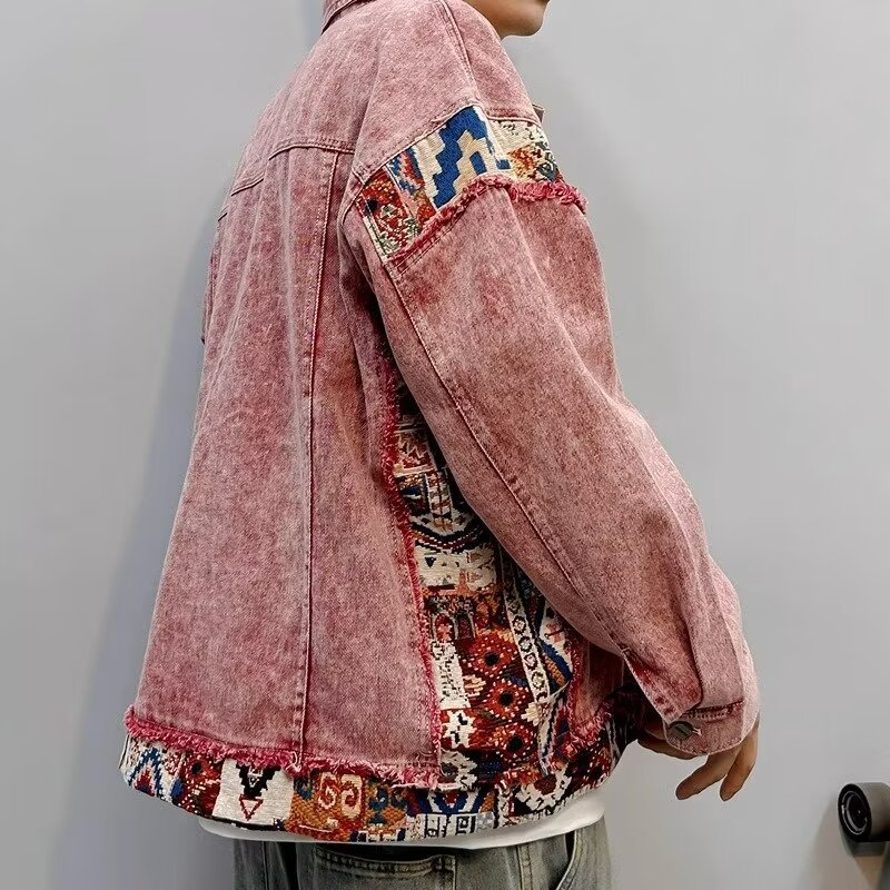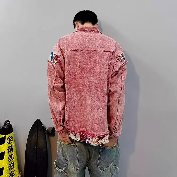 미국 스타일 빈티지 꽃 바느질 오래 된 핑크 데님 재킷 남자 일본 스타일 잘 생긴 작업 재킷 트렌디 탑스토어 가기