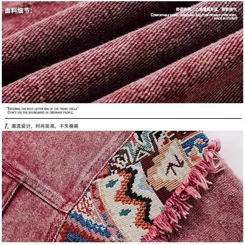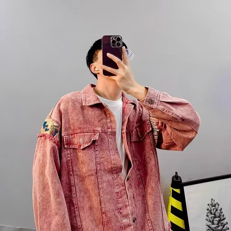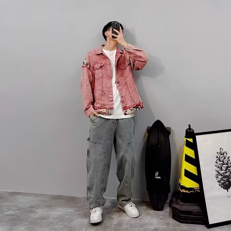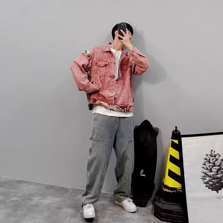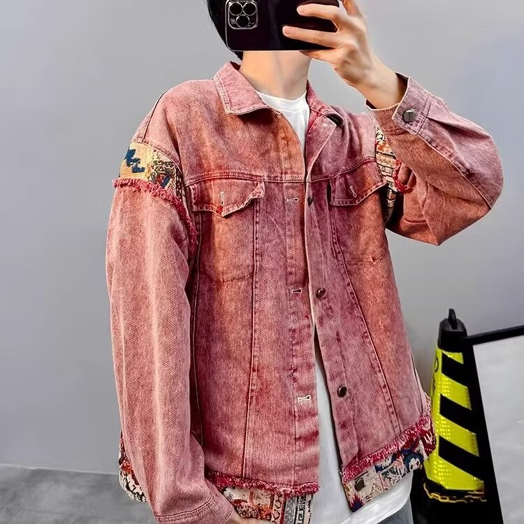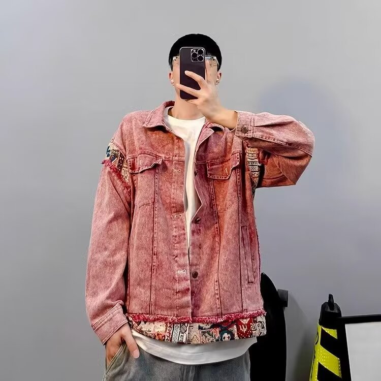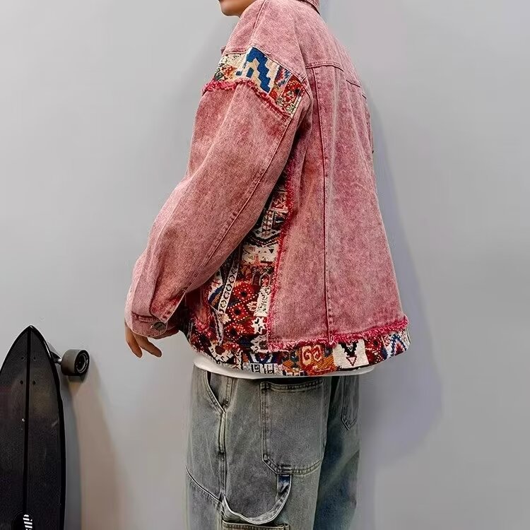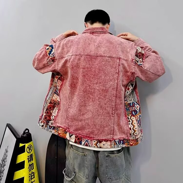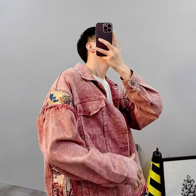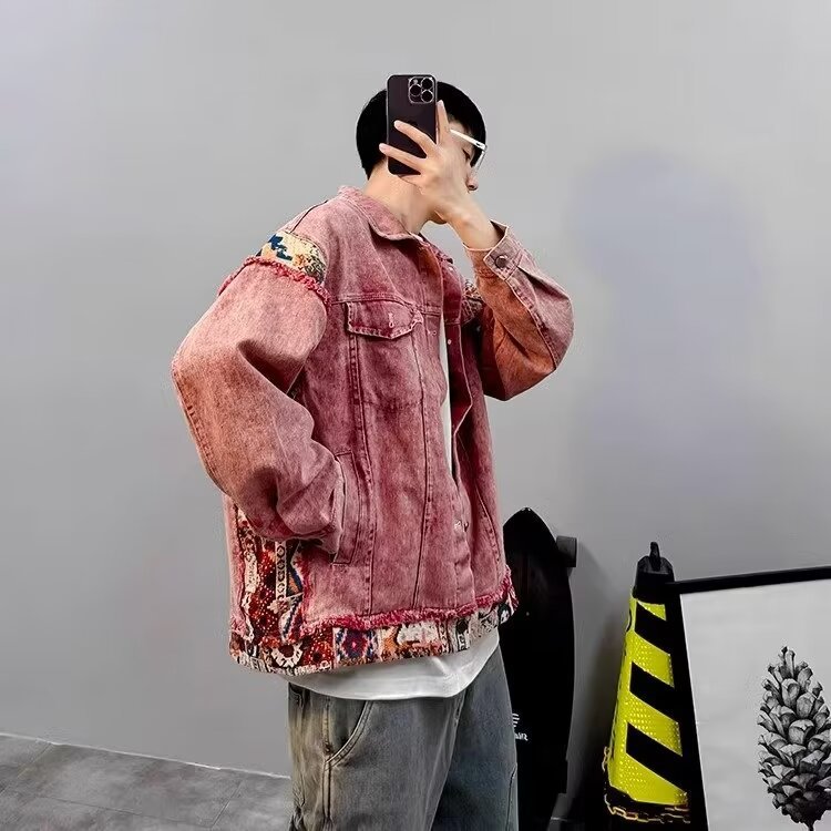 미국 스타일 빈티지 꽃 바느질 오래 된 핑크 데님 재킷 남자 일본 스타일 잘 생긴 작업 재킷 트렌디 탑