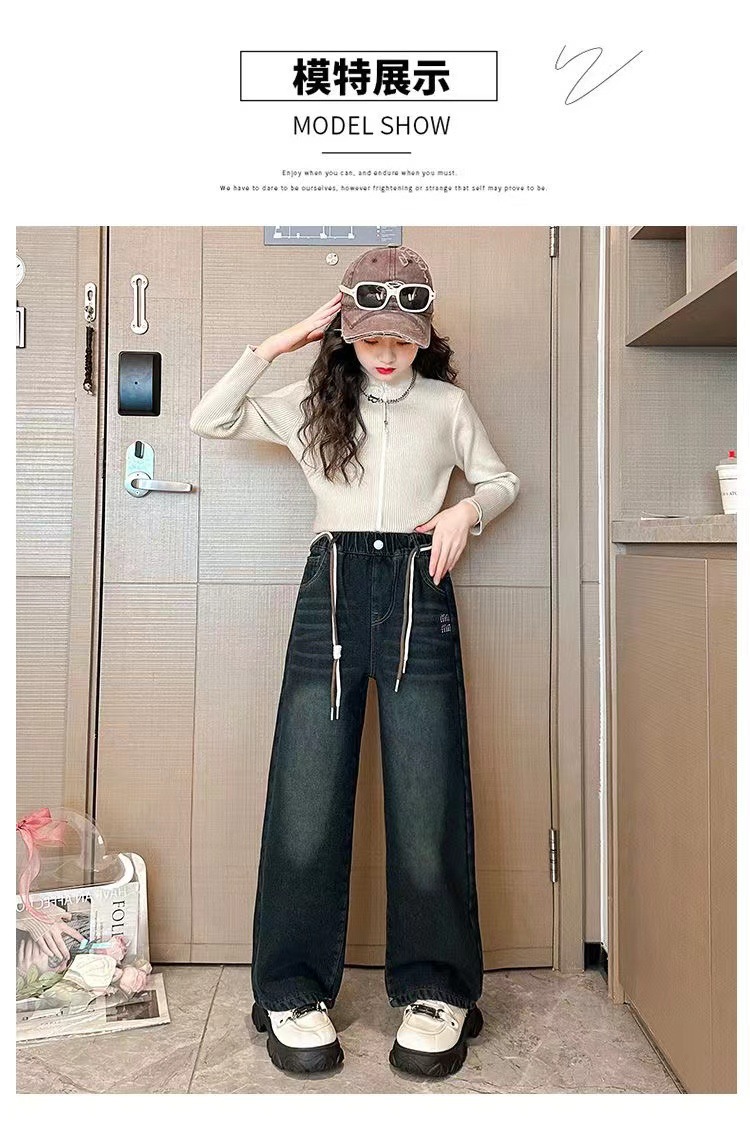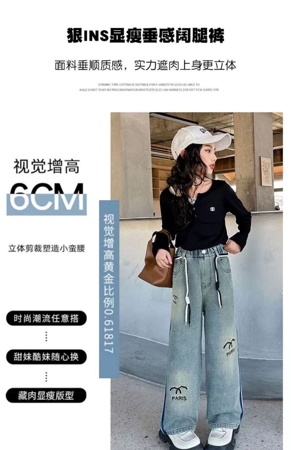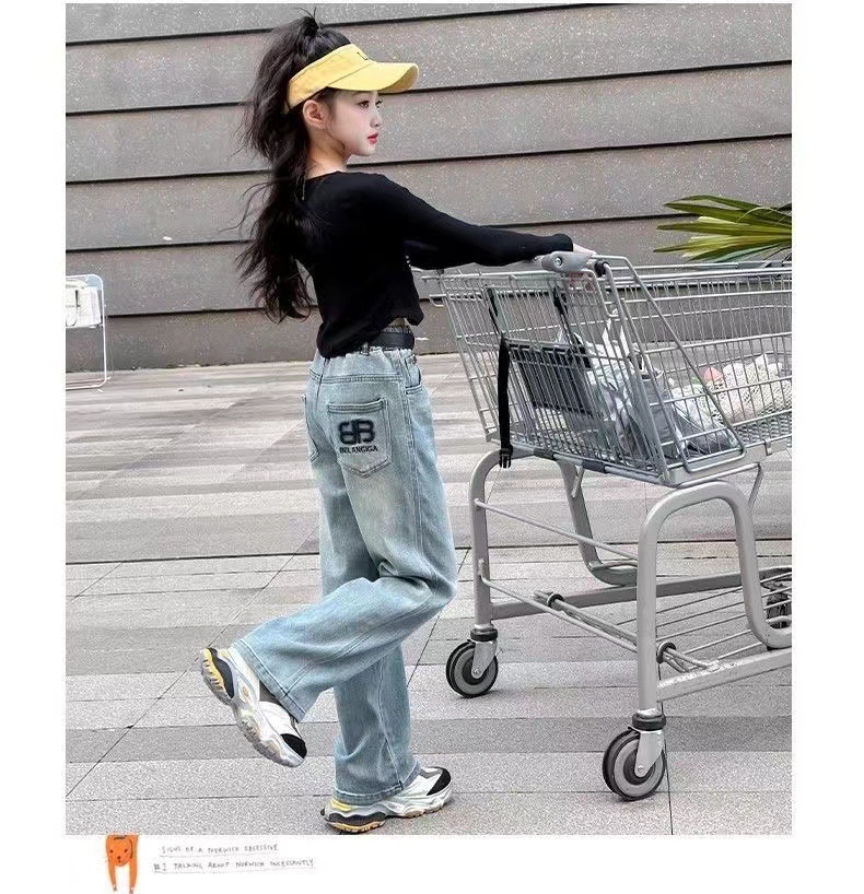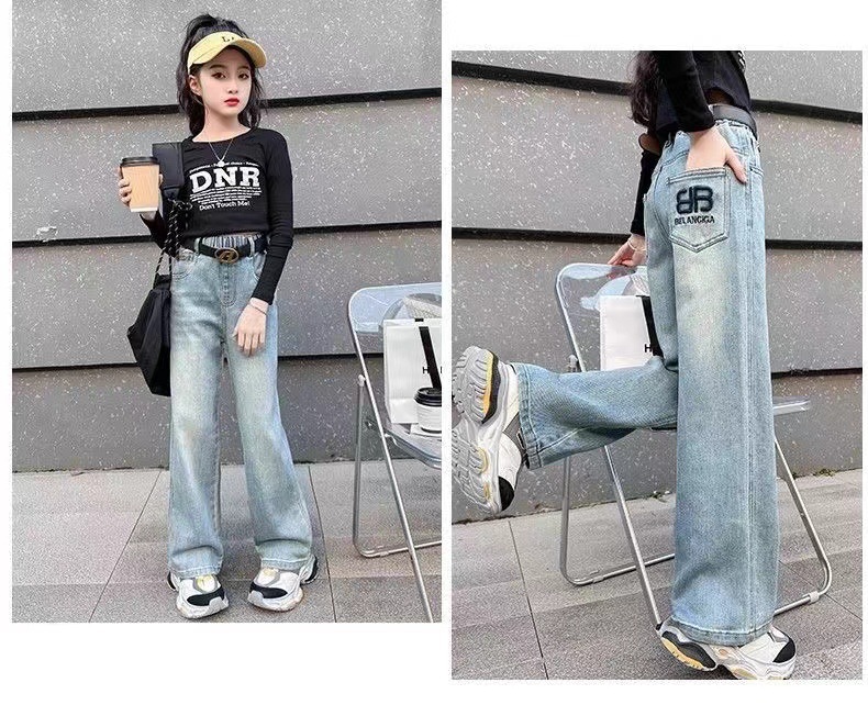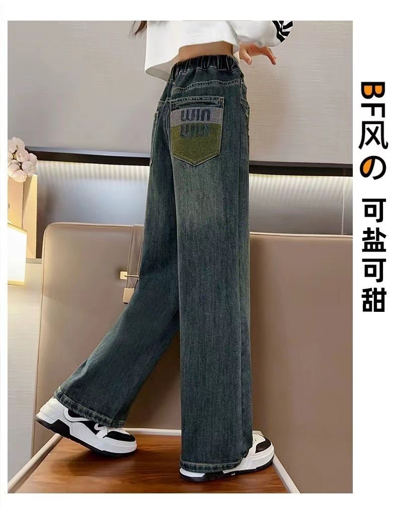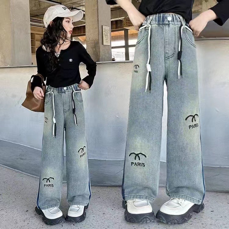 봄과 가을 소녀 바지 2024 새로운 스트레이트 레그 청바지 소녀 큰 어린이 가을 서양식 외부 착용 와이드 레그 바지스토어 가기