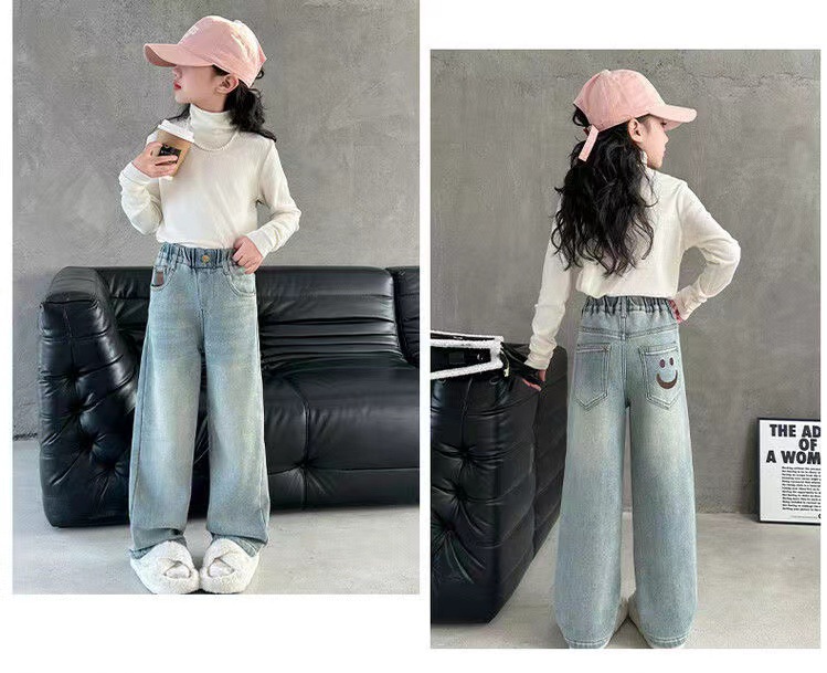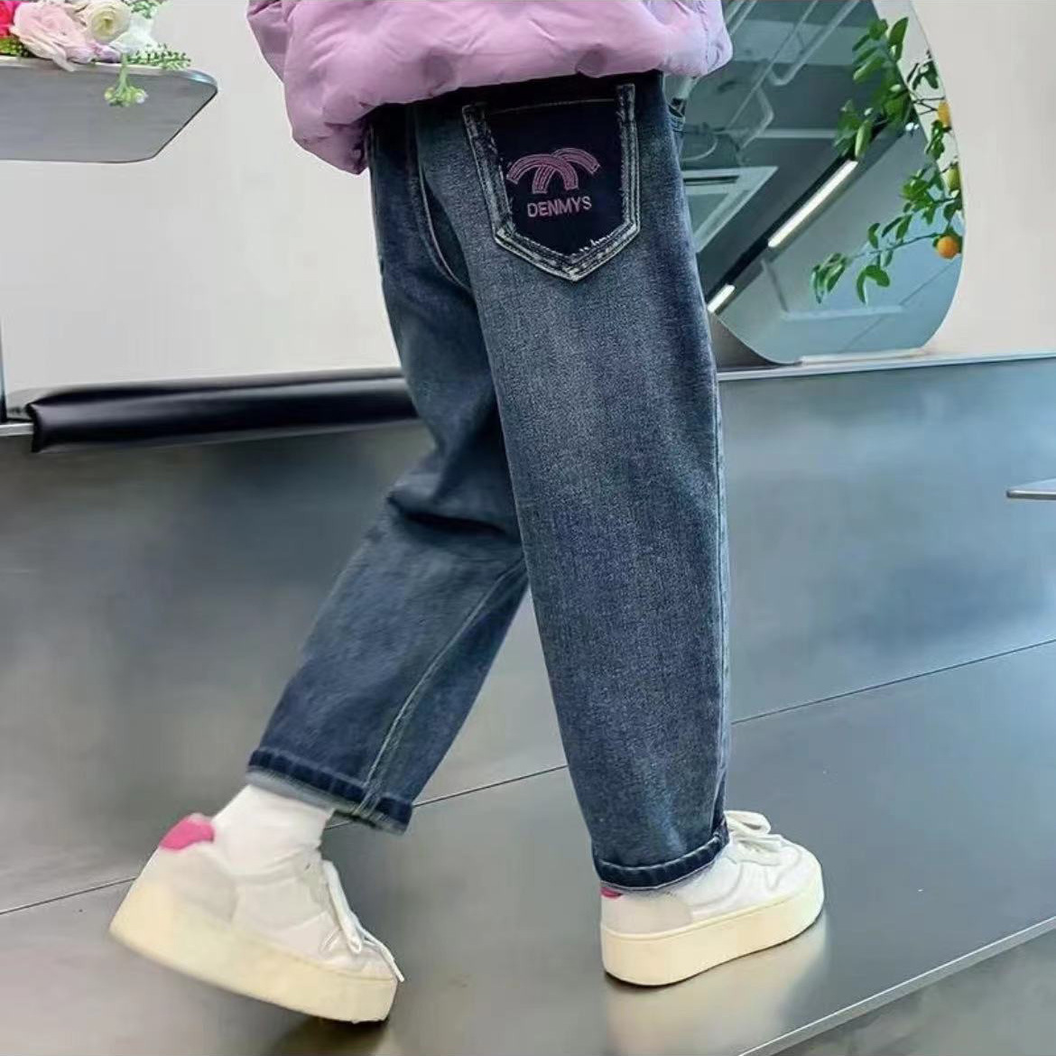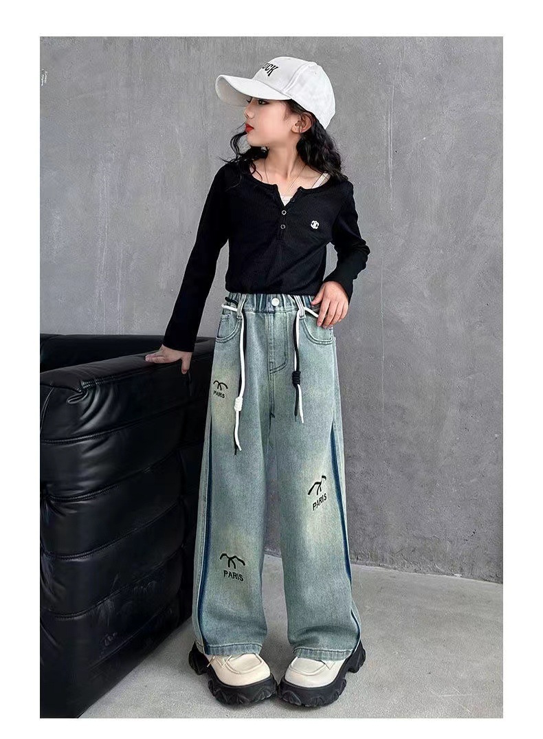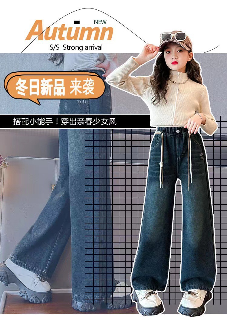 봄과 가을 소녀 바지 2024 새로운 스트레이트 레그 청바지 소녀 큰 어린이 가을 서양식 외부 착용 와이드 레그 바지스토어 가기