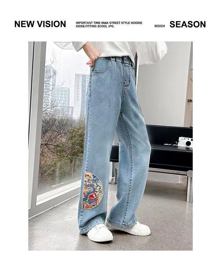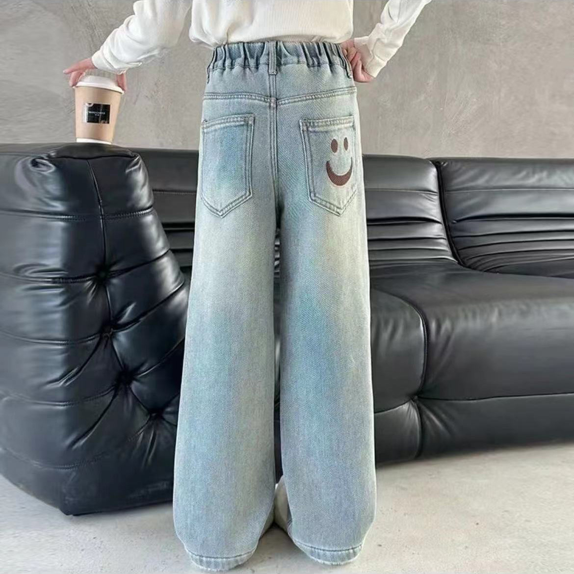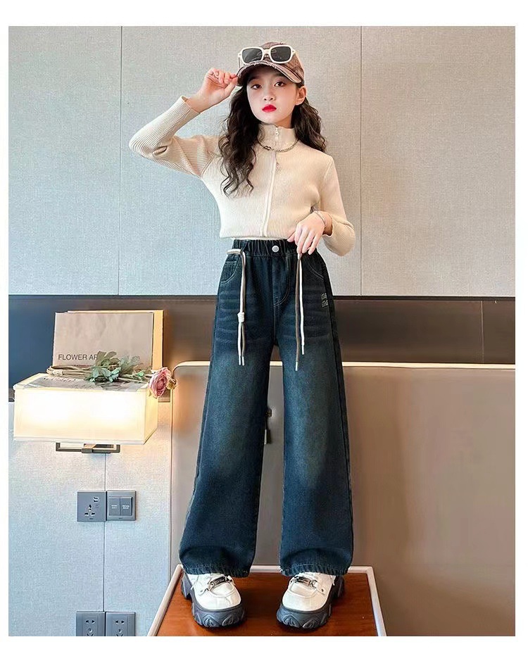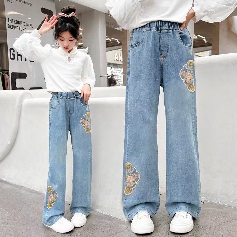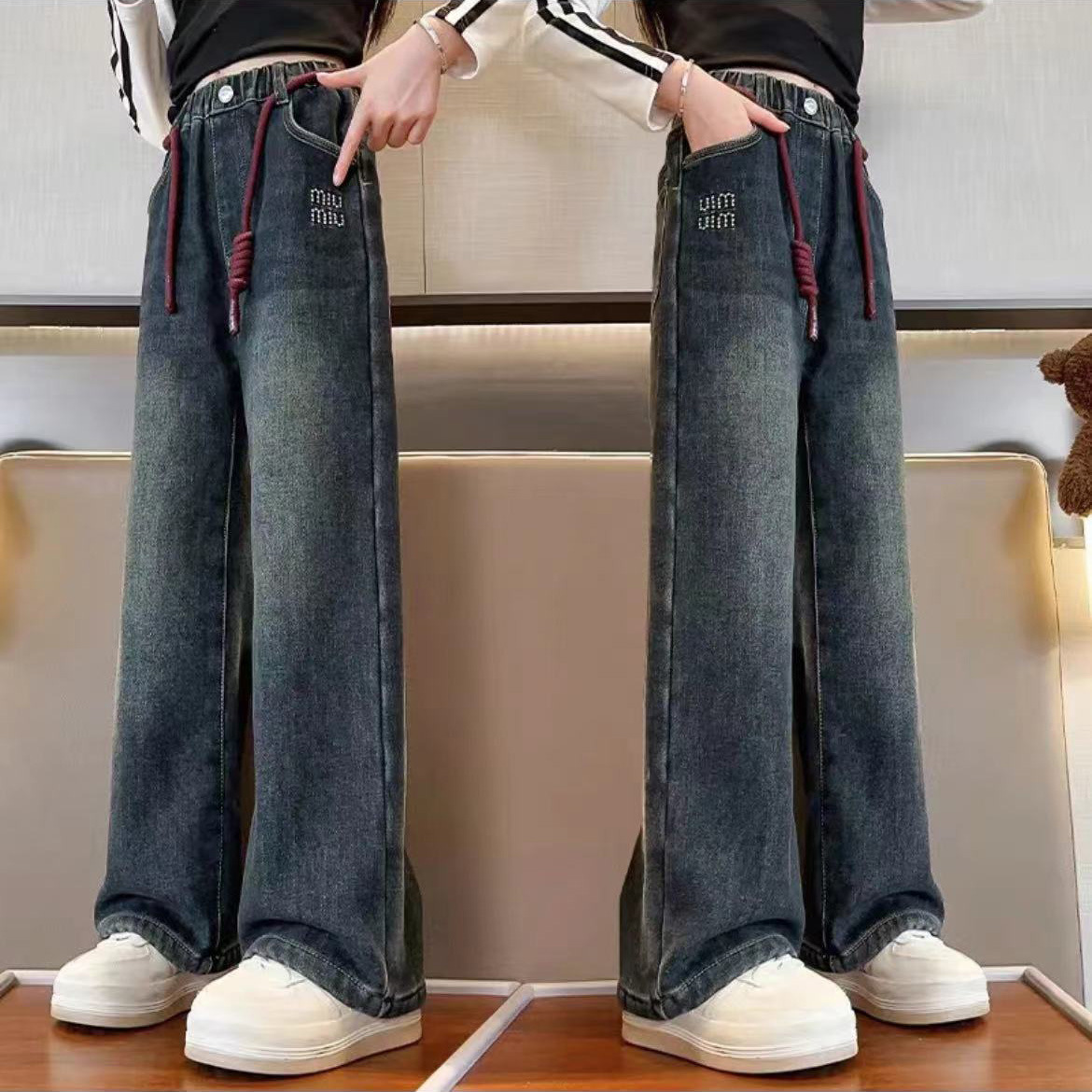 봄과 가을 소녀 바지 2024 새로운 스트레이트 레그 청바지 소녀 큰 어린이 가을 서양식 외부 착용 와이드 레그 바지