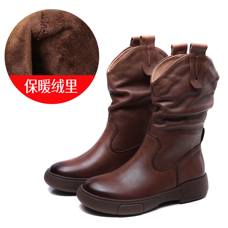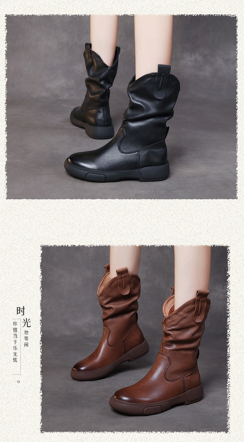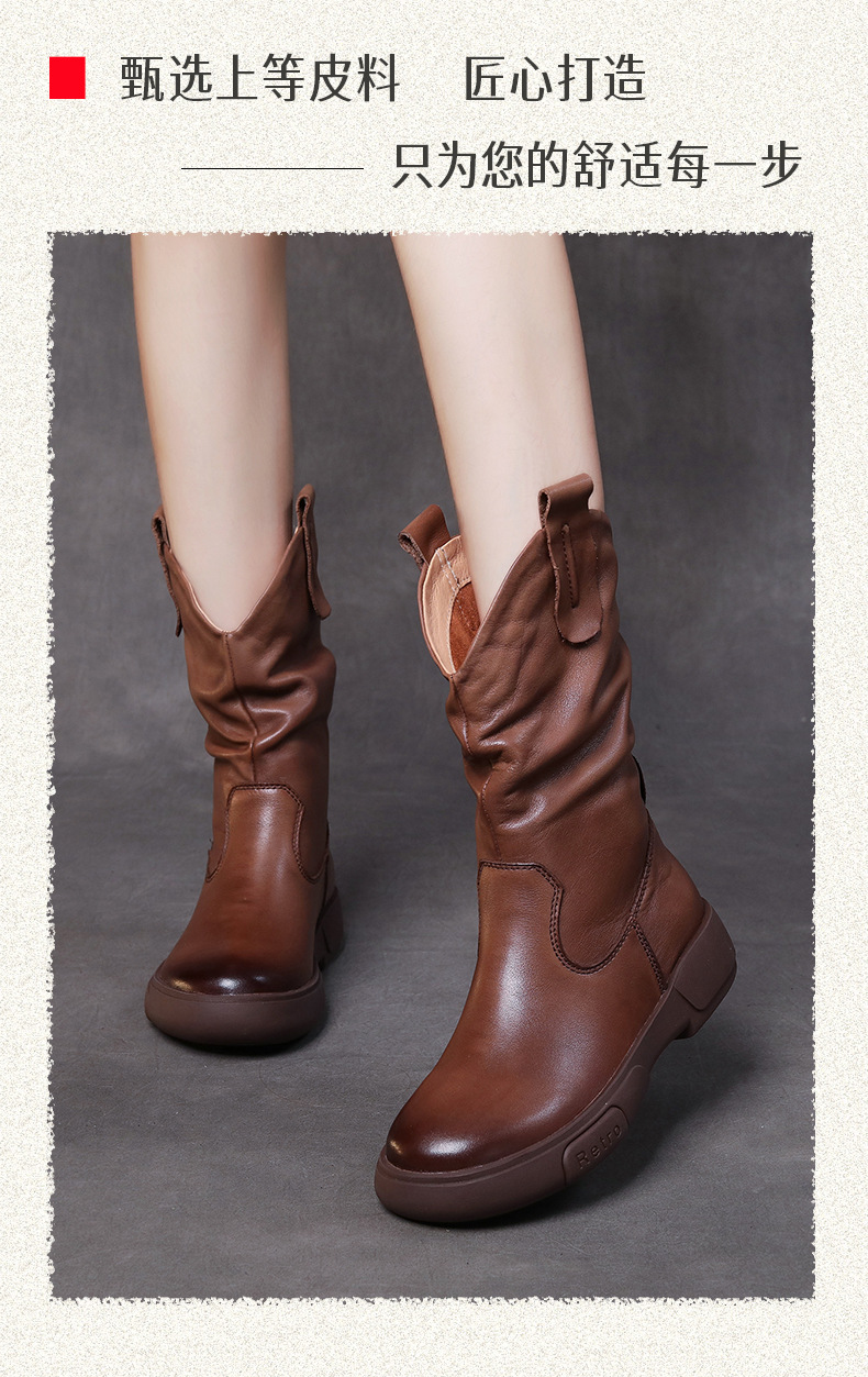 탑 레이어 소 가죽 야외 승마 부츠 스태킹 부츠 중급 부츠 여성 플랫 소프트 가죽 가을과 겨울 가죽 마틴 부츠 웨스턴
