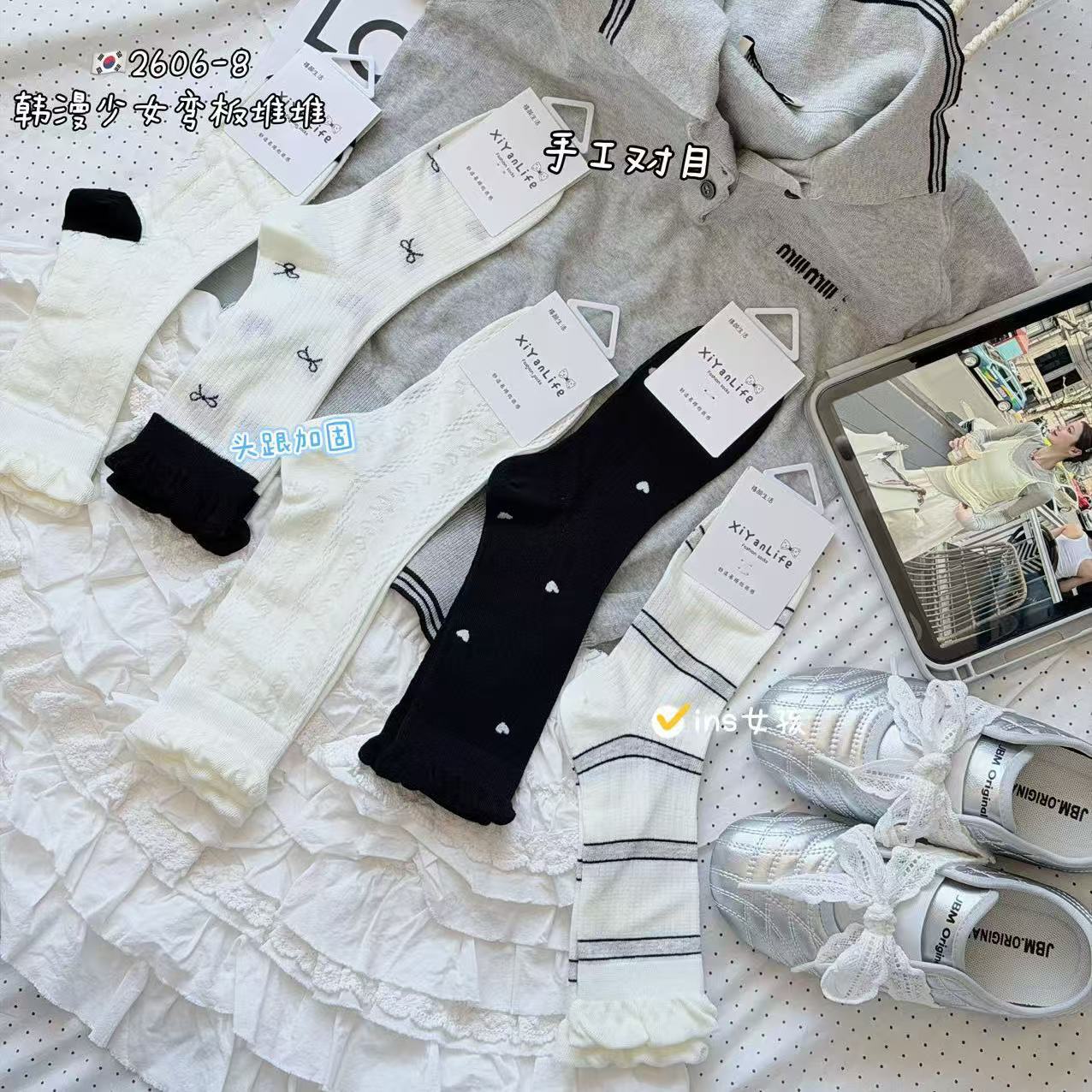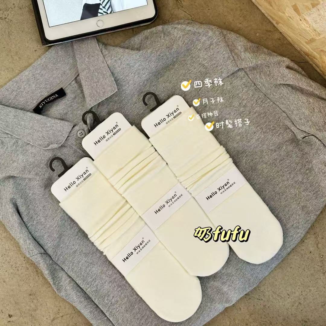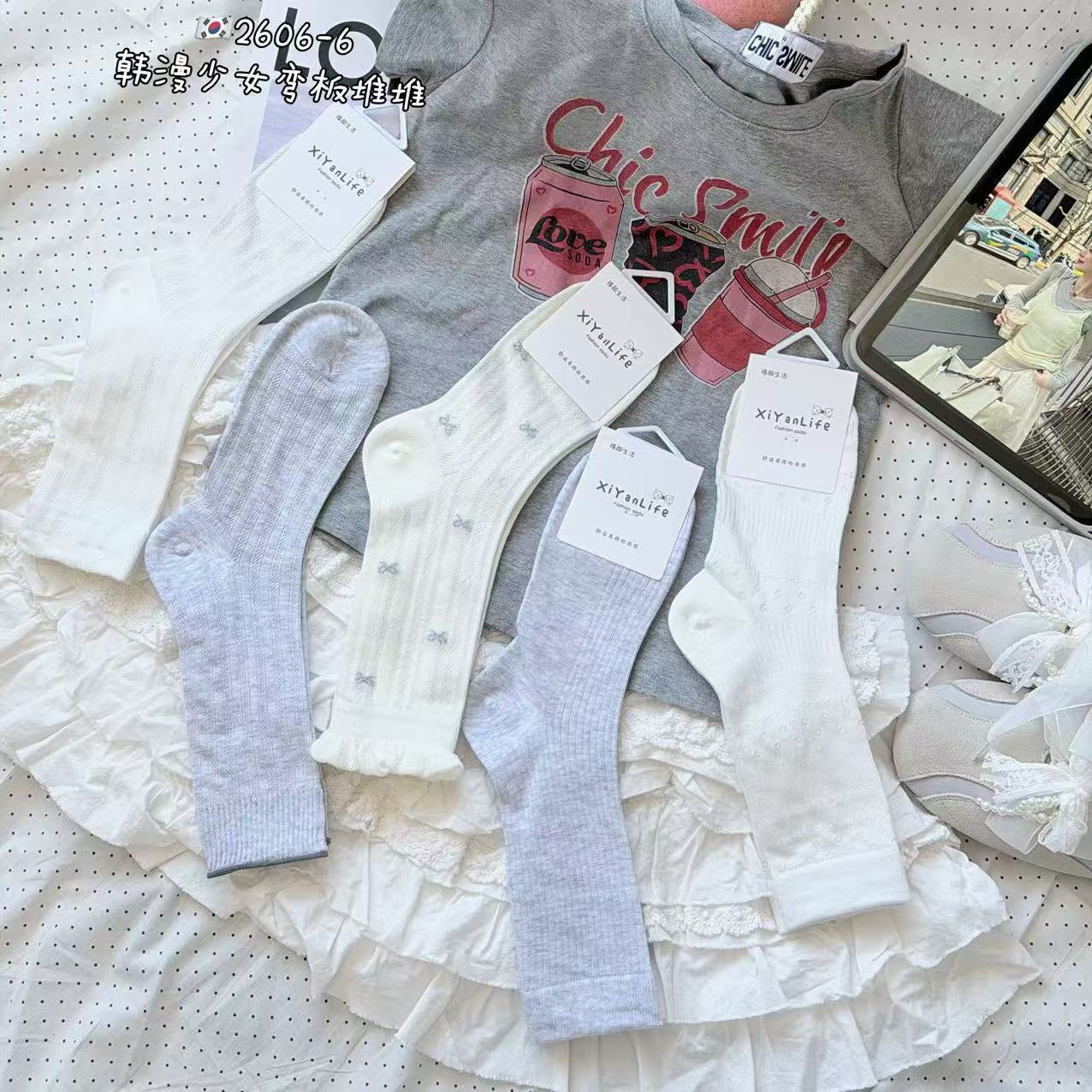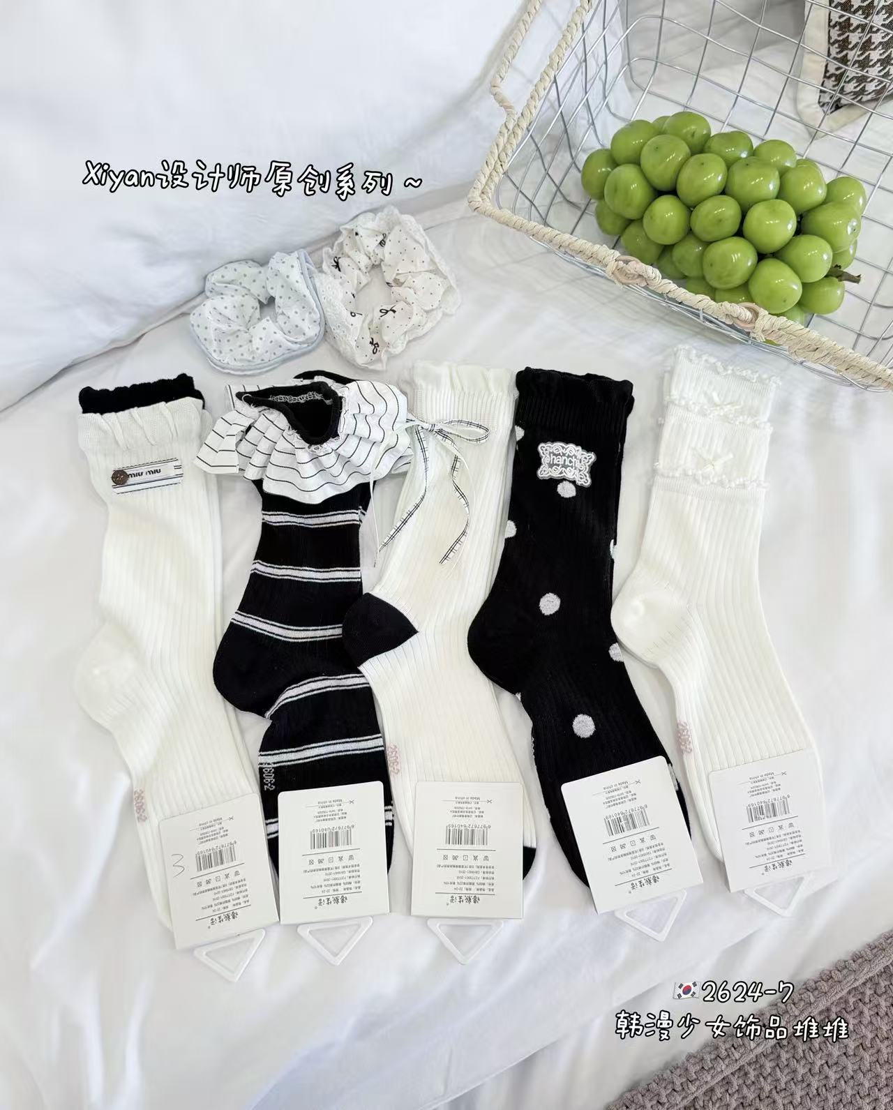 인스 트렌디한 중간 길이 양말, 봄 여름 한국 스타일 여성용 파일 양말, 코마면 흑백 인터넷 연예인 파일 양말