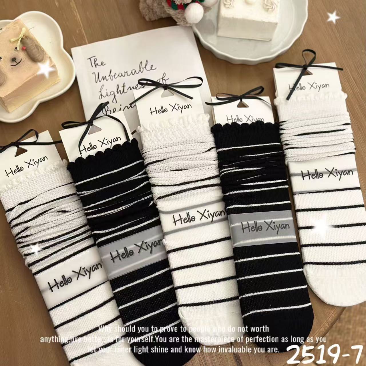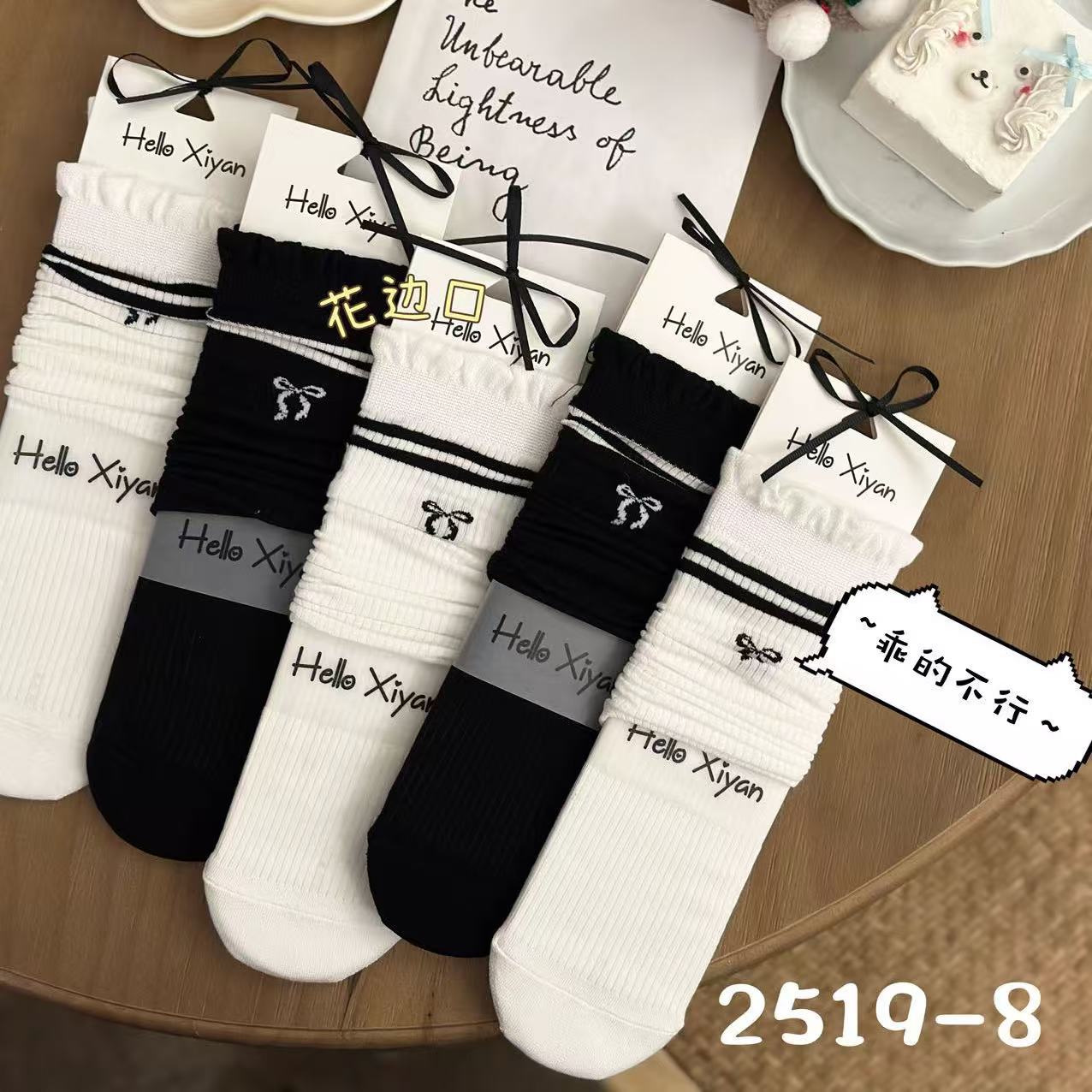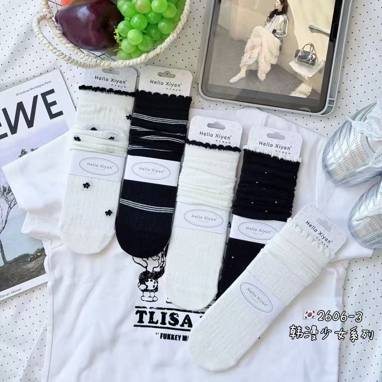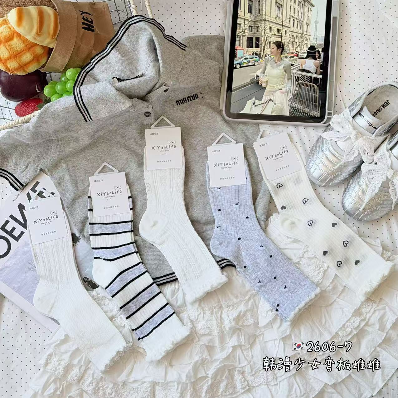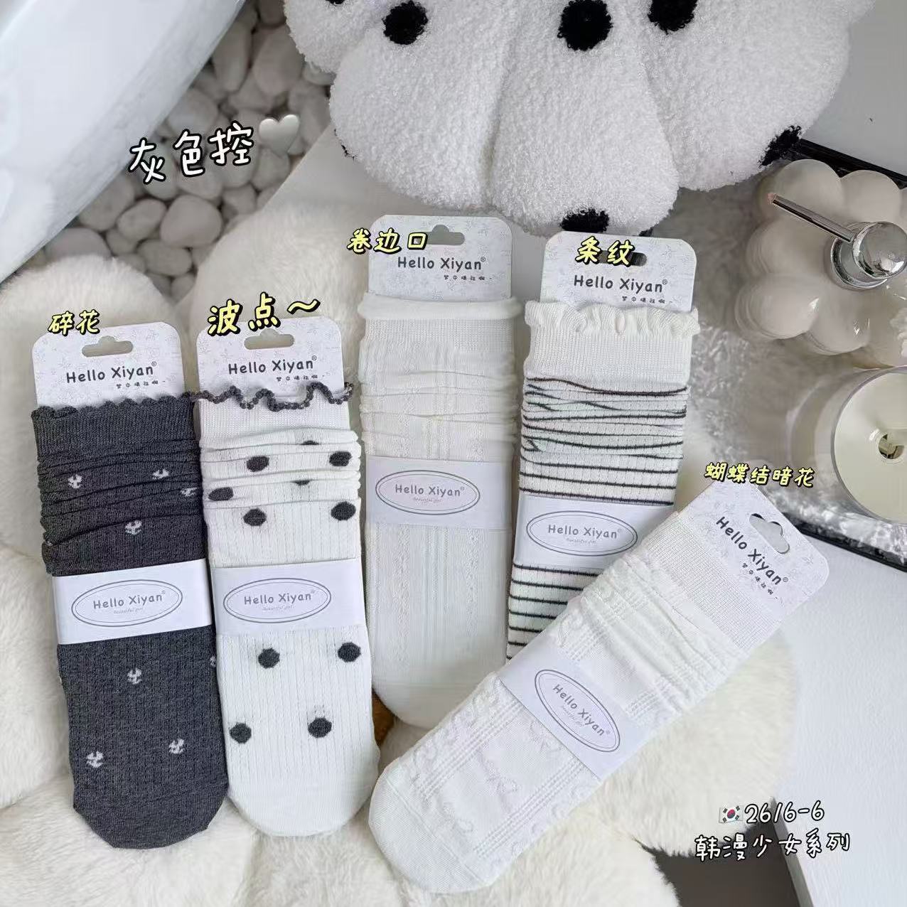 인스 트렌디한 중간 길이 양말, 봄 여름 한국 스타일 여성용 파일 양말, 코마면 흑백 인터넷 연예인 파일 양말