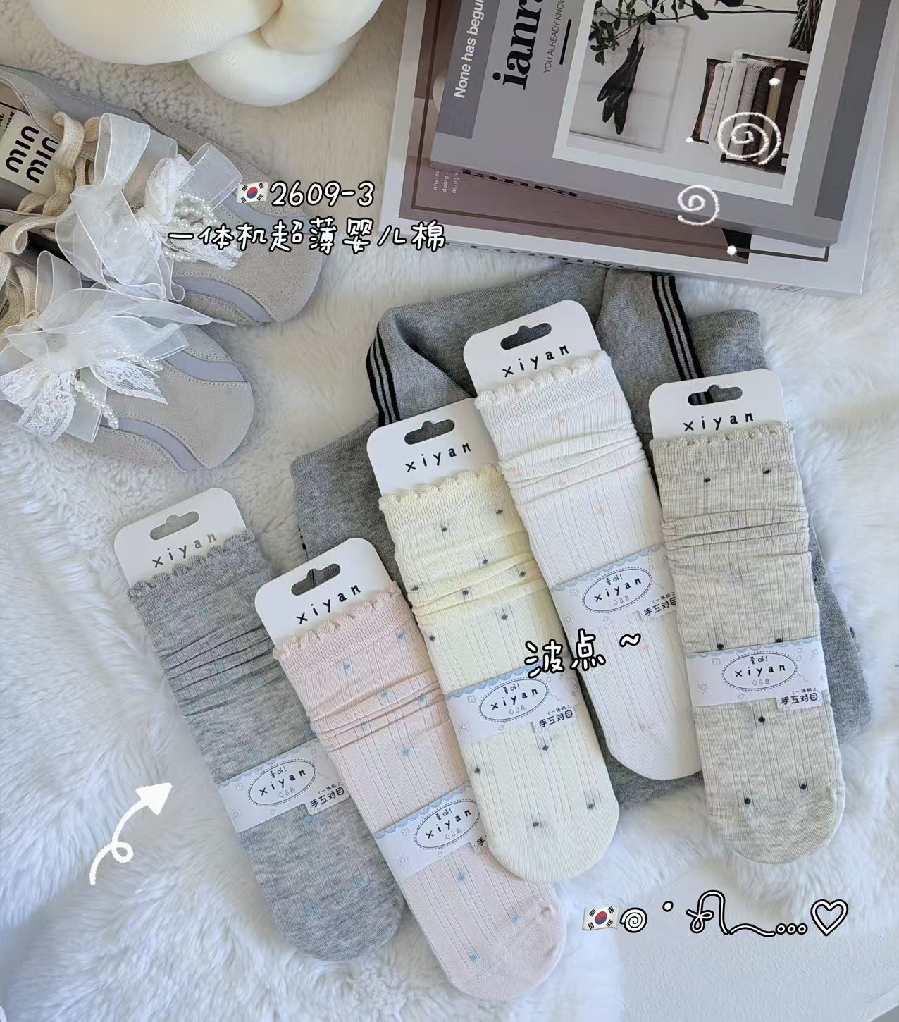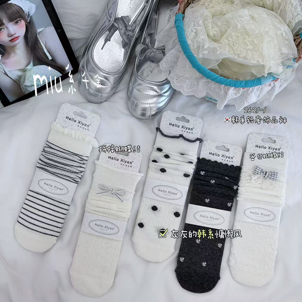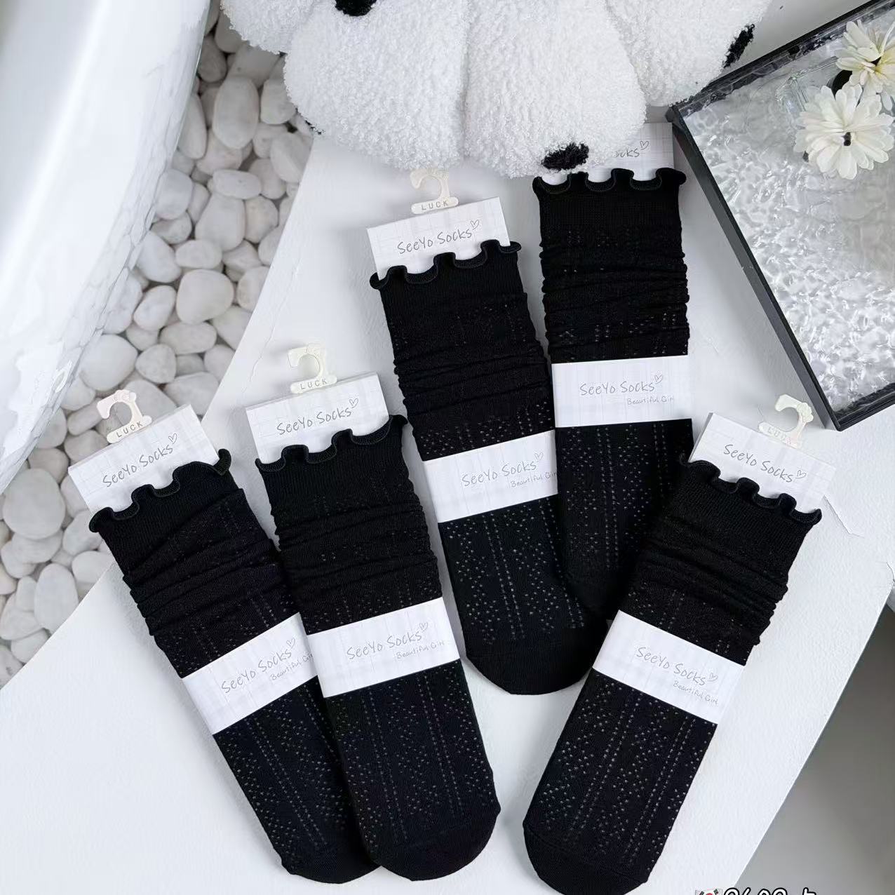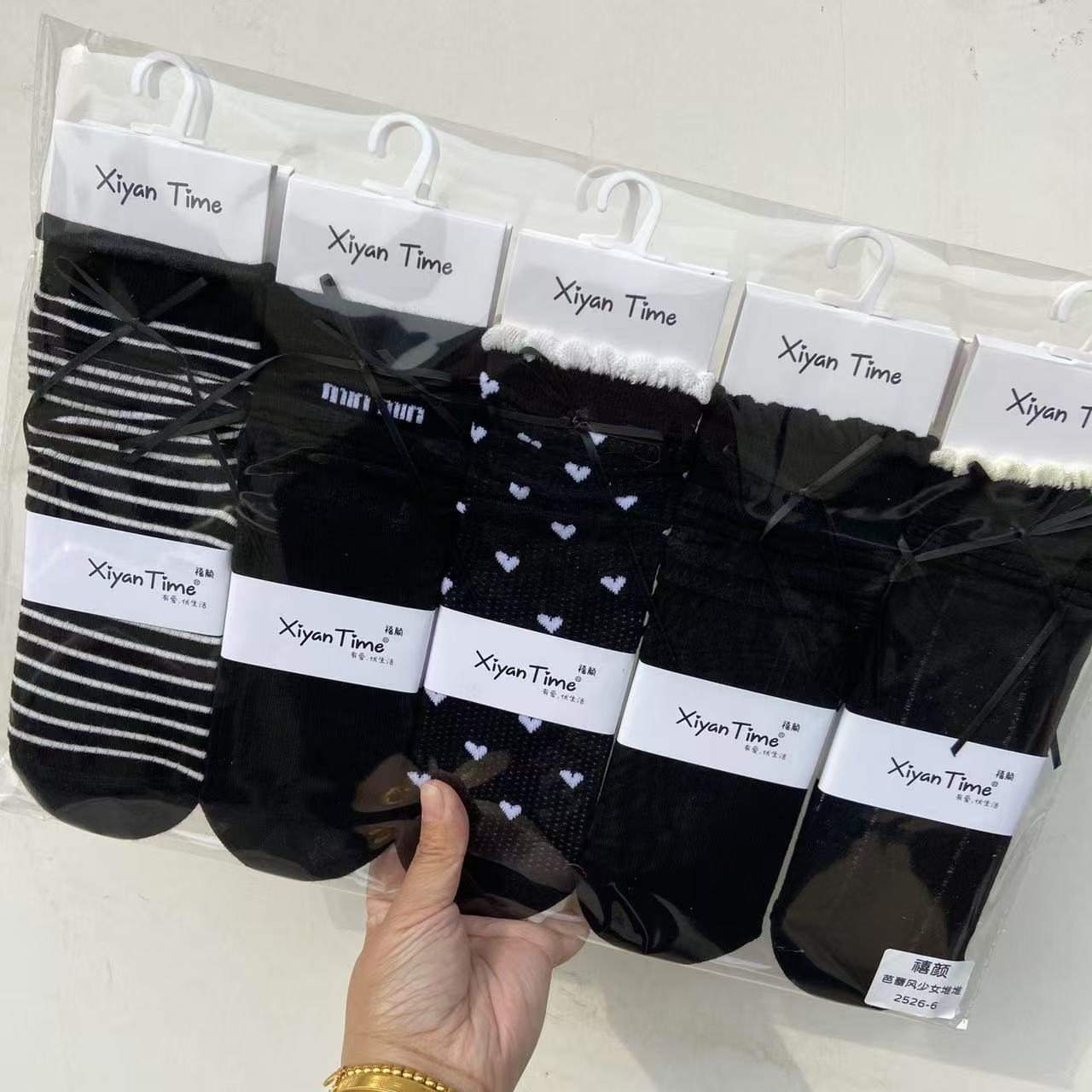인스 트렌디한 중간 길이 양말, 봄 여름 한국 스타일 여성용 파일 양말, 코마면 흑백 인터넷 연예인 파일 양말