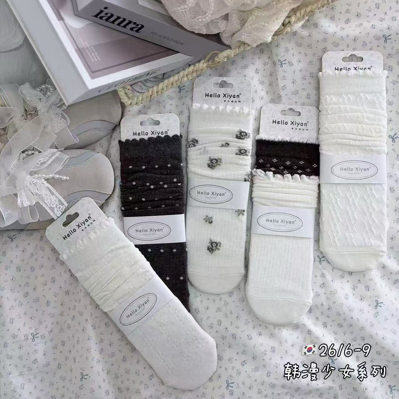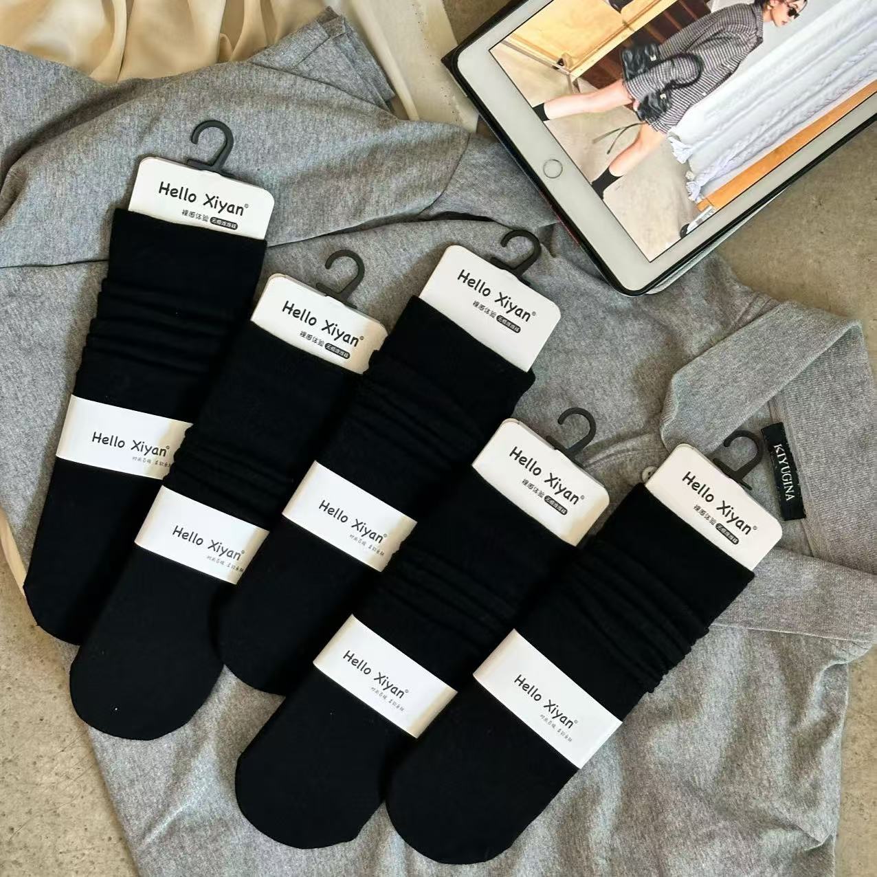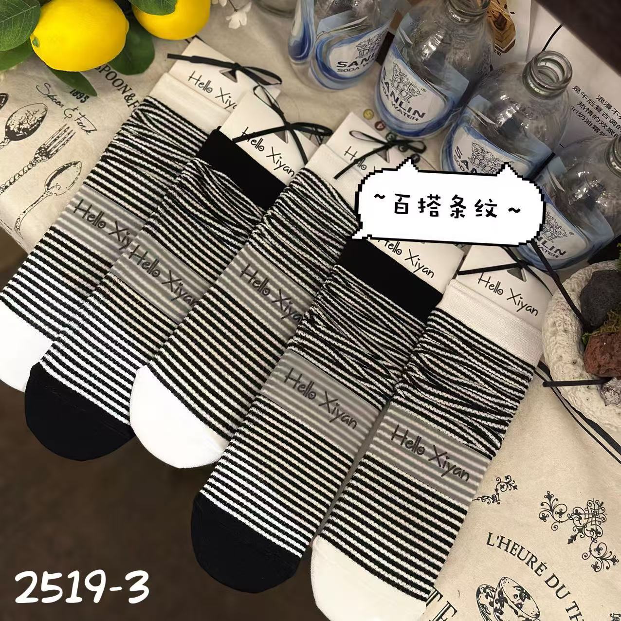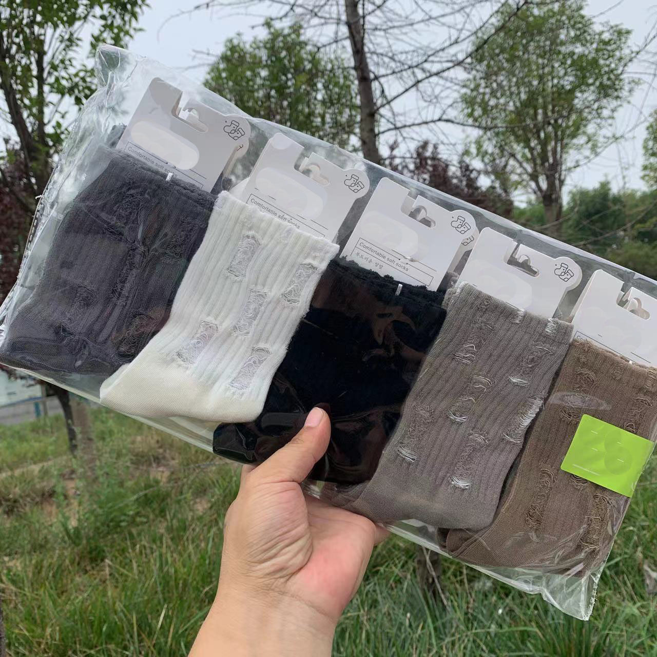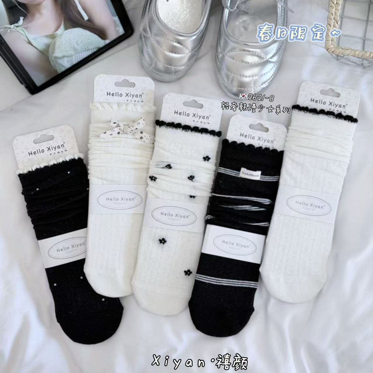 인스 트렌디한 중간 길이 양말, 봄 여름 한국 스타일 여성용 파일 양말, 코마면 흑백 인터넷 연예인 파일 양말스토어 가기