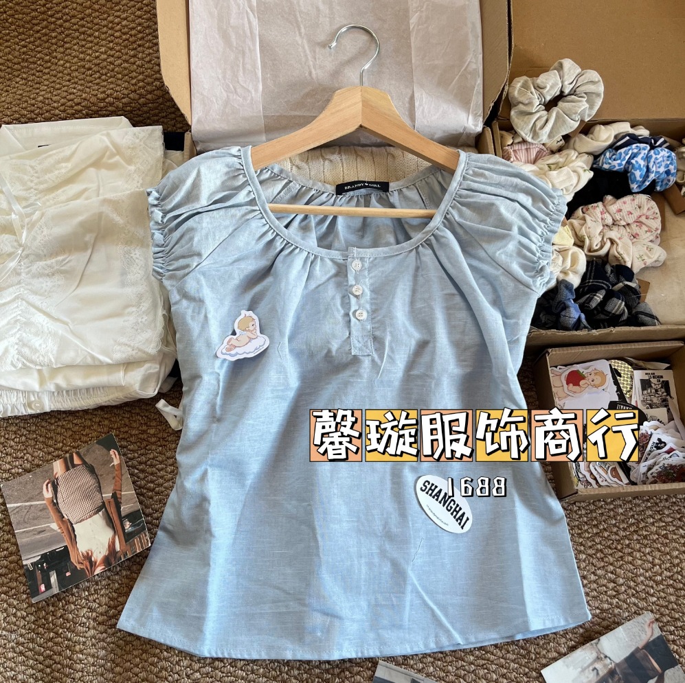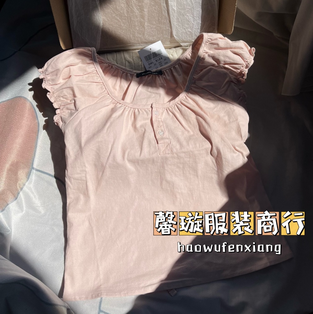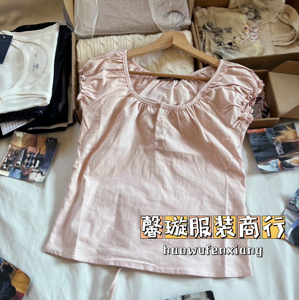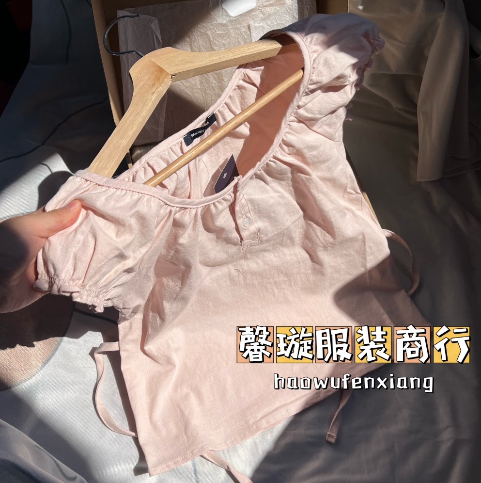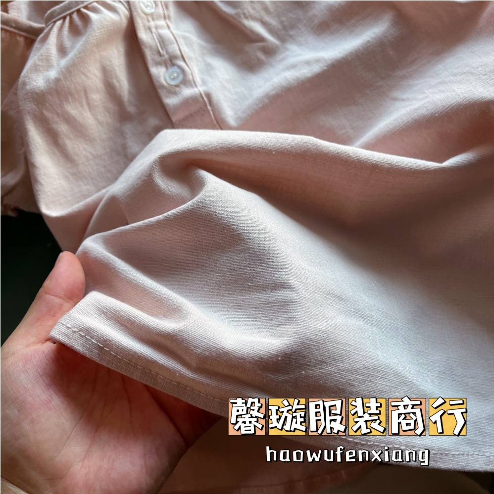 BM 스타일의 새로운 핑크 린넨 버블 슬리브 반팔 셔츠 탑 여성용 bm 달콤한 얇은 3 버튼 짧은 티셔츠스토어 가기