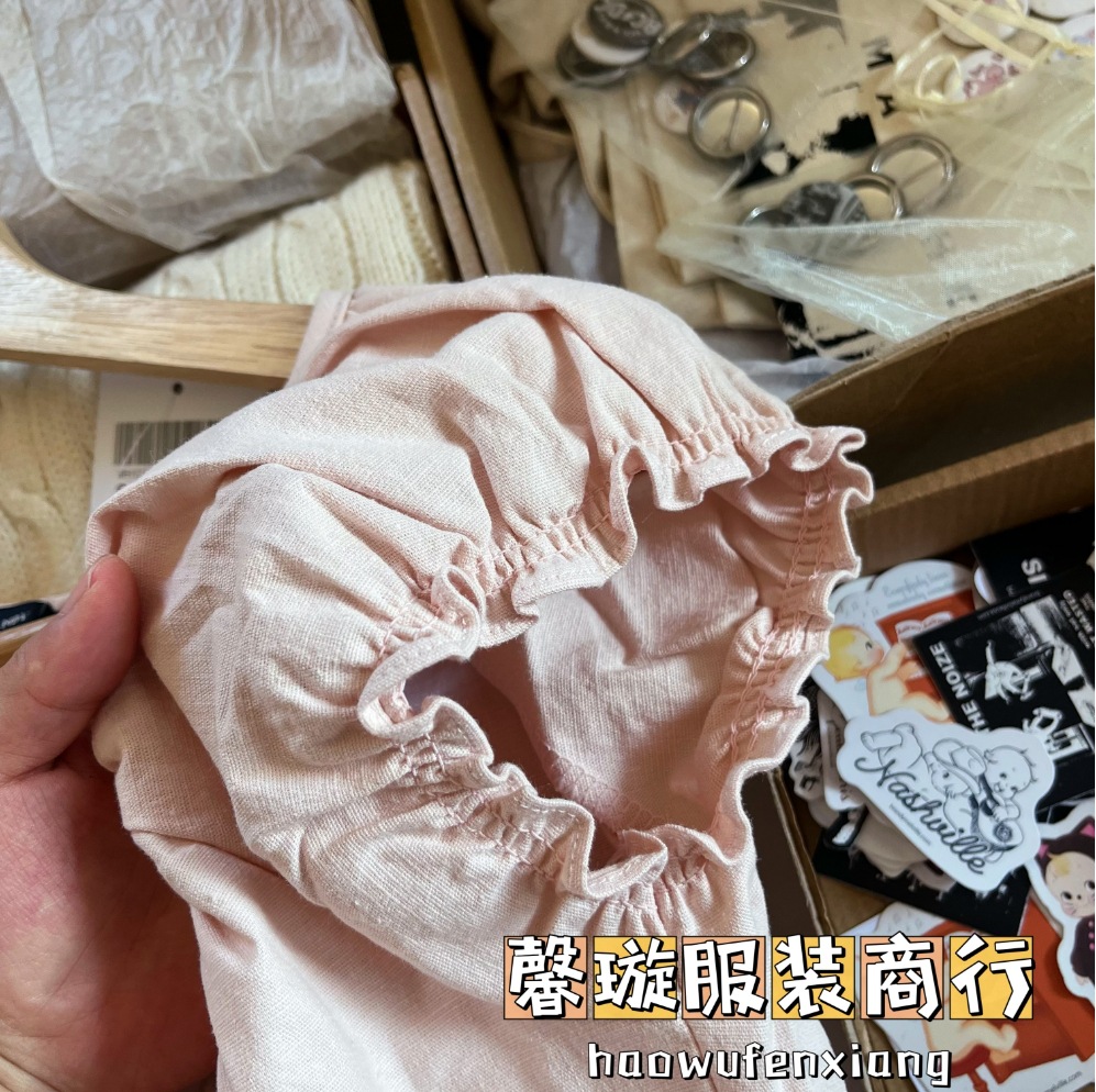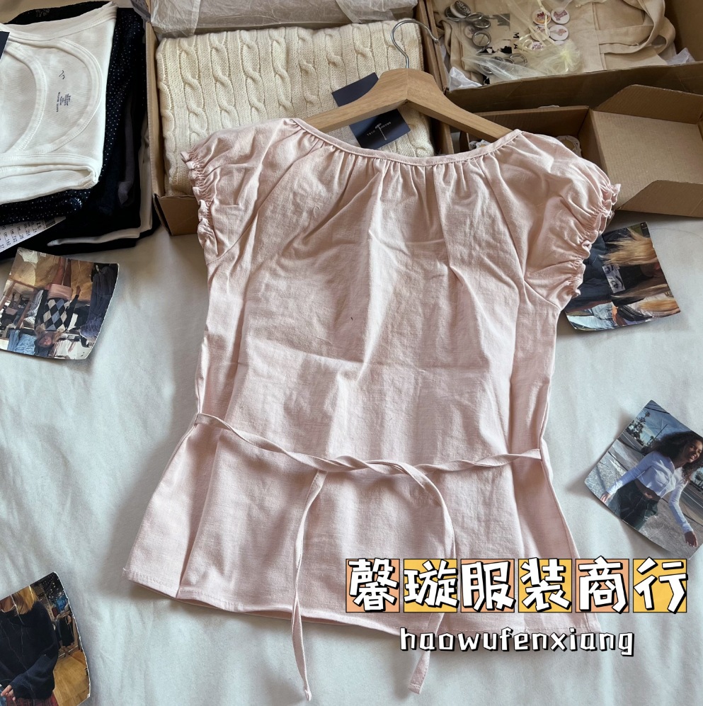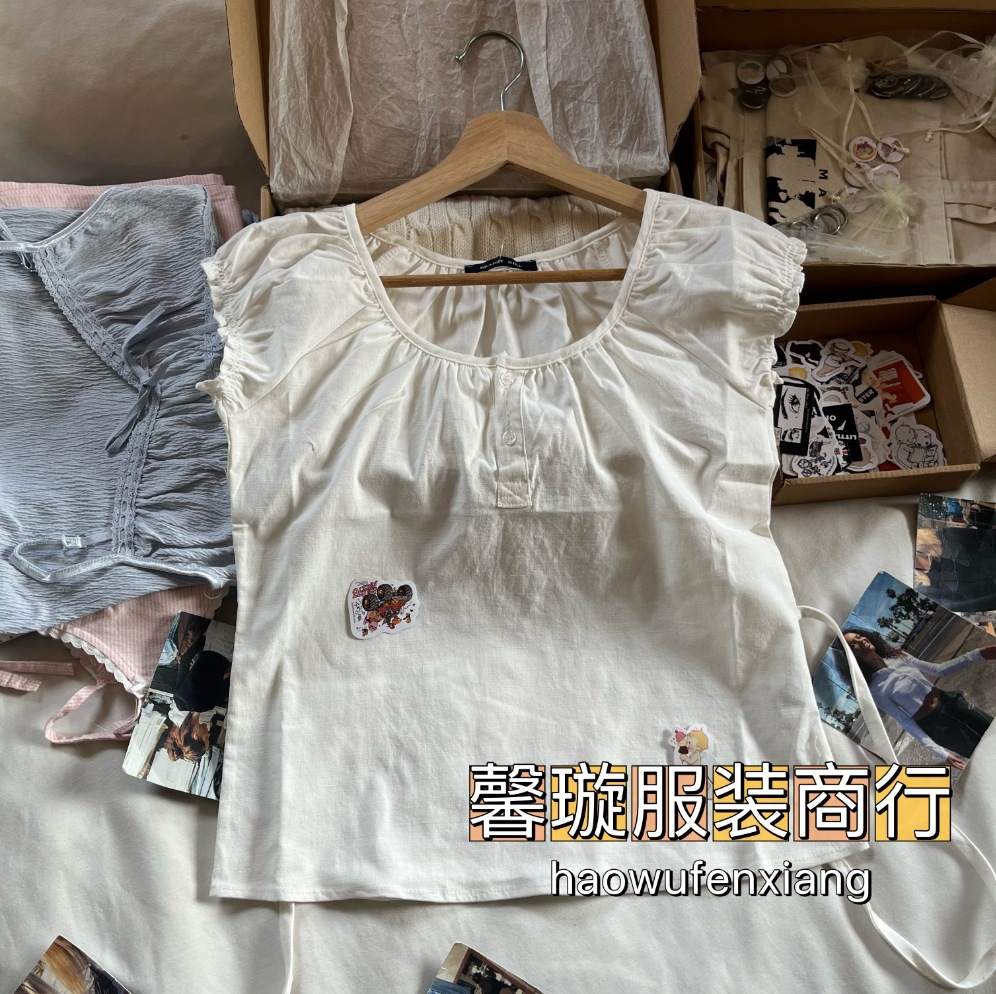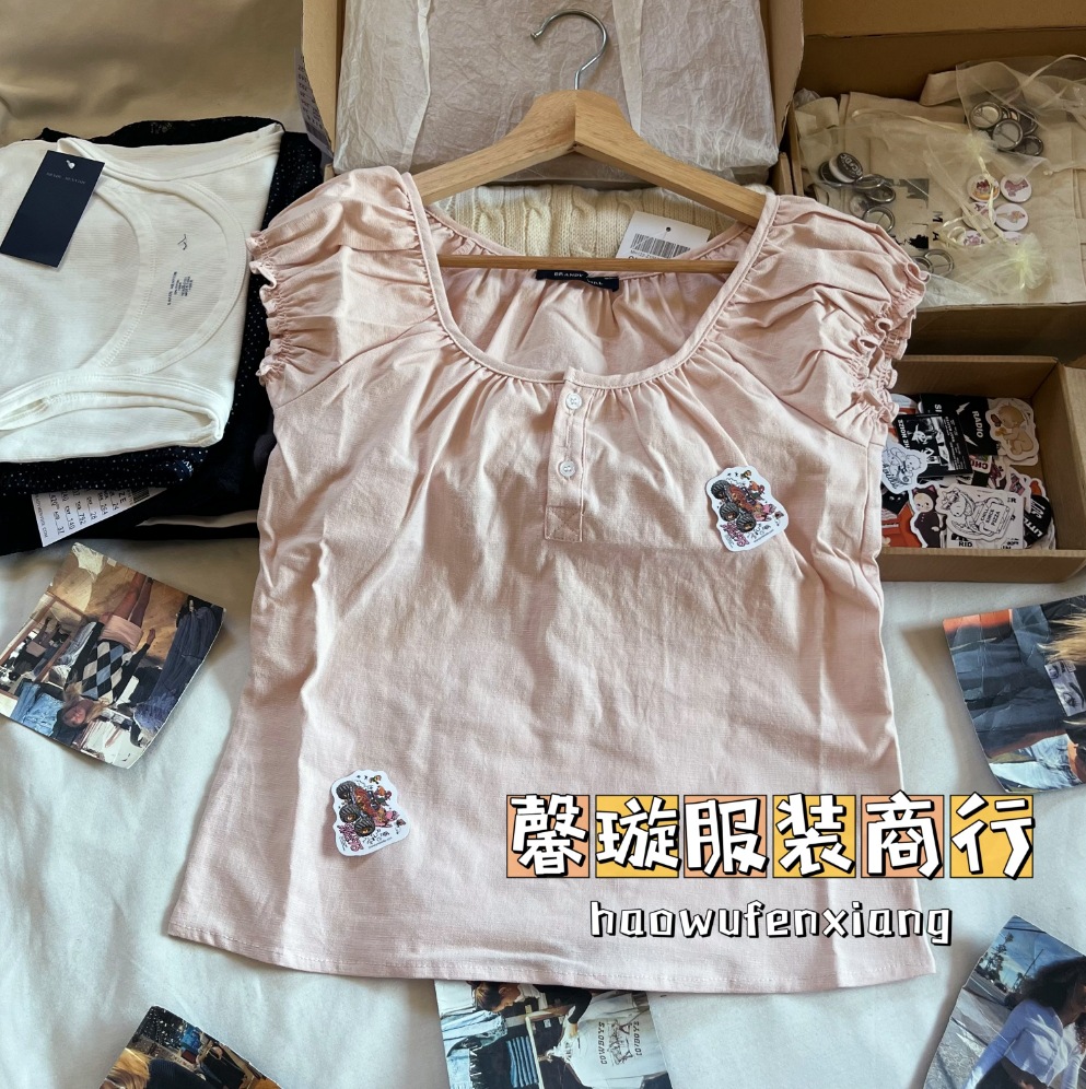 BM 스타일의 새로운 핑크 린넨 버블 슬리브 반팔 셔츠 탑 여성용 bm 달콤한 얇은 3 버튼 짧은 티셔츠스토어 가기