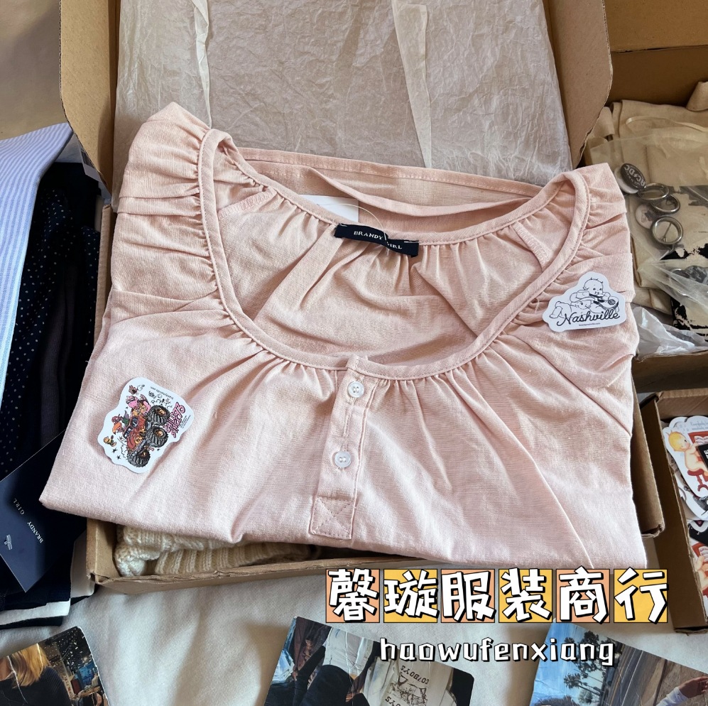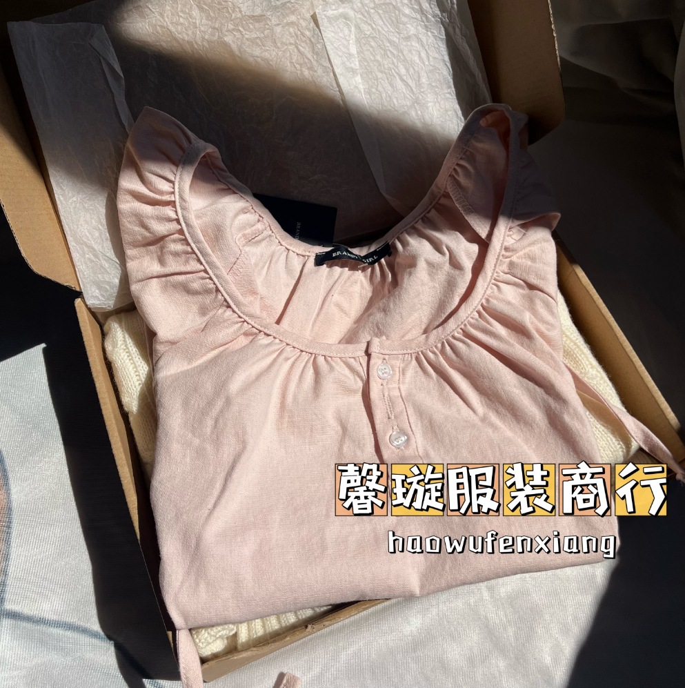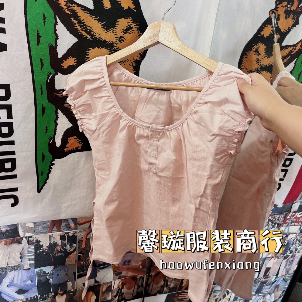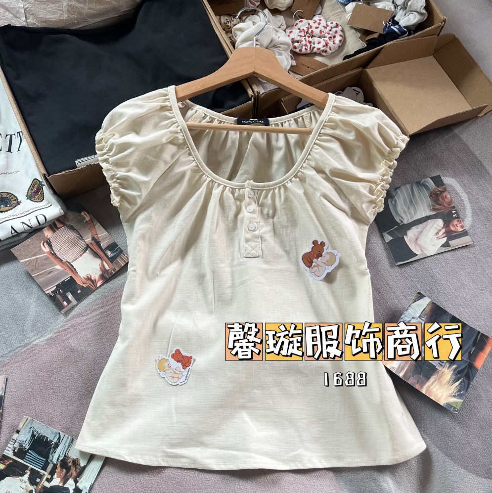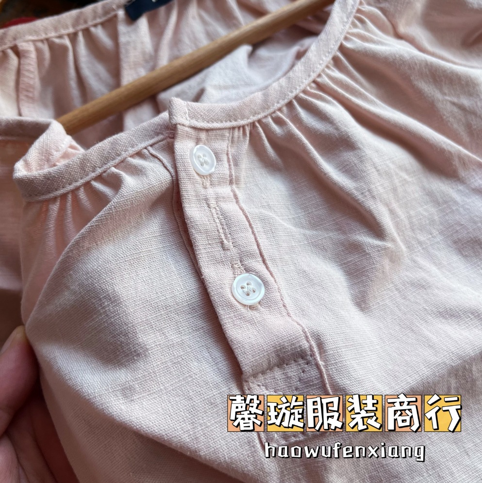 BM 스타일의 새로운 핑크 린넨 버블 슬리브 반팔 셔츠 탑 여성용 bm 달콤한 얇은 3 버튼 짧은 티셔츠스토어 가기