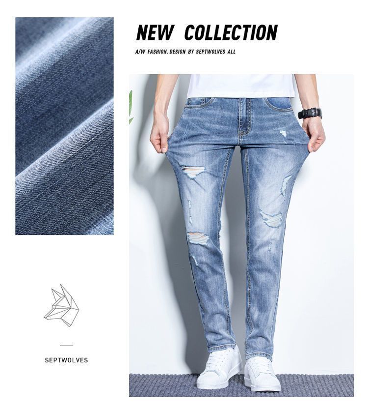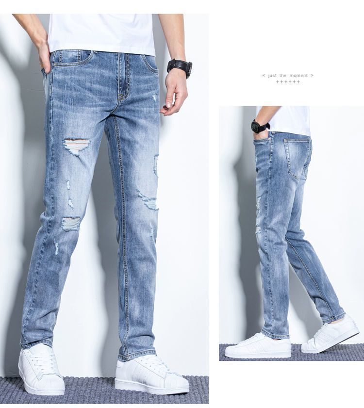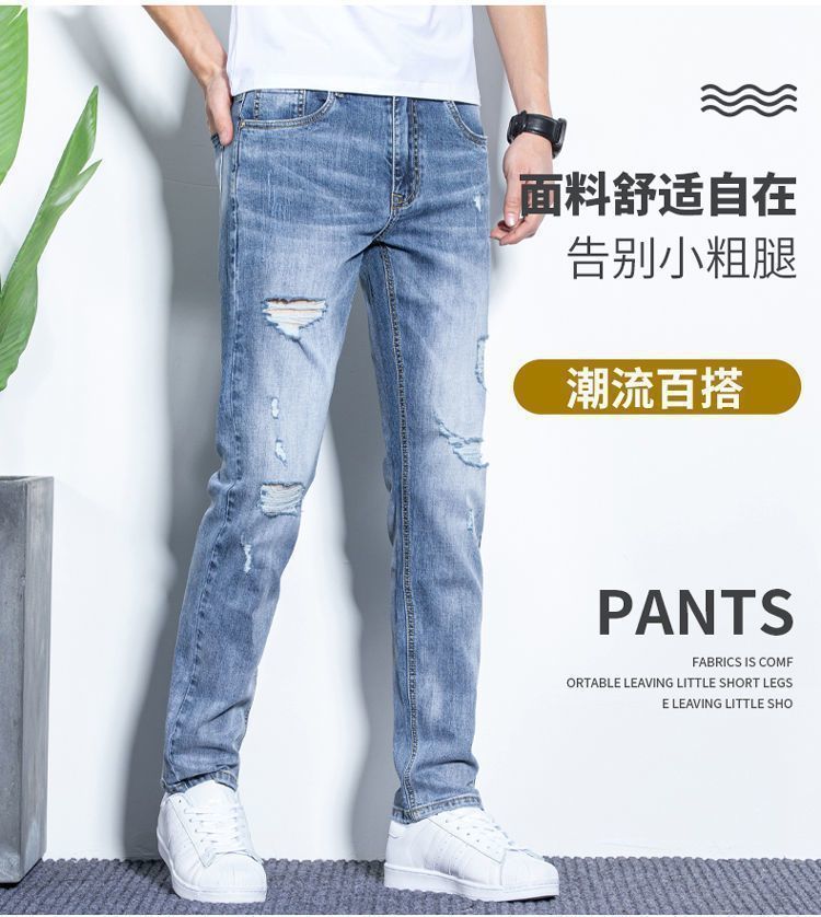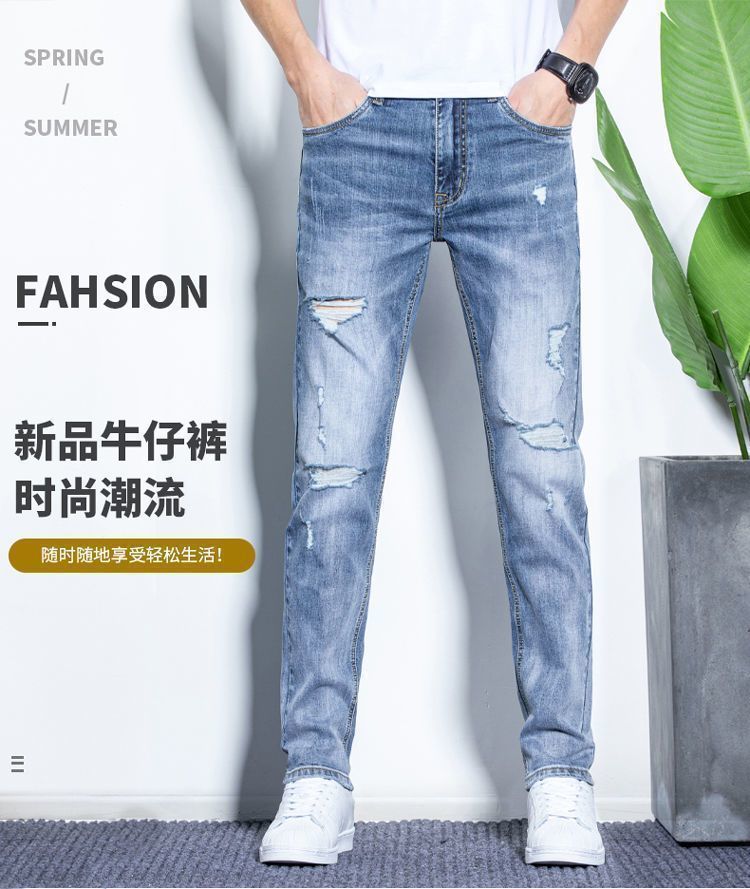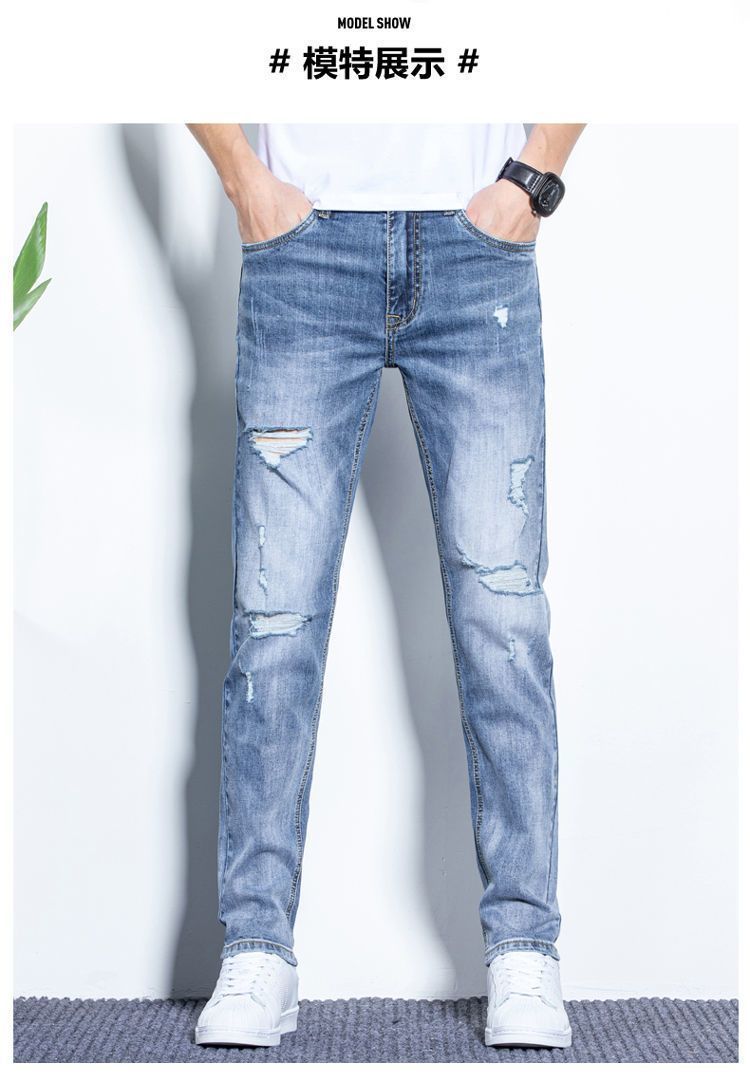 라이트 블루 남성용 청바지 남성용 스트레치 리핑 바지 여름 얇은 슬림 핏 스트레이트 바지 남성용 하이 엔드 캐주얼 바지스토어 가기
