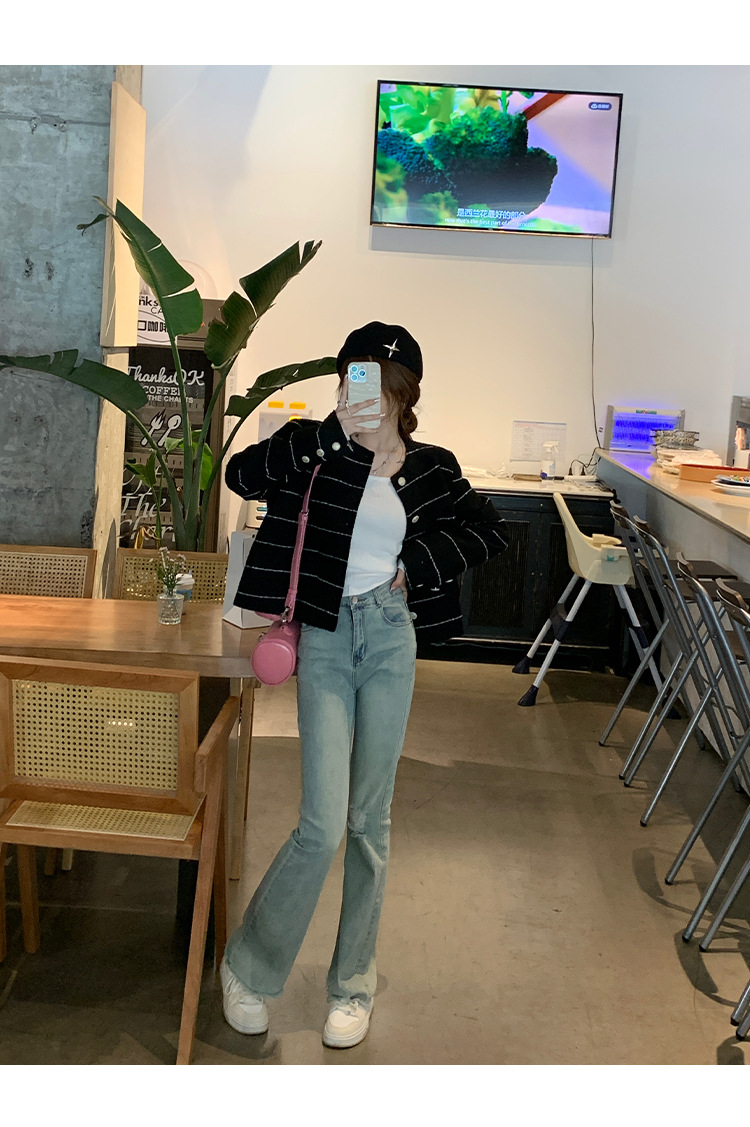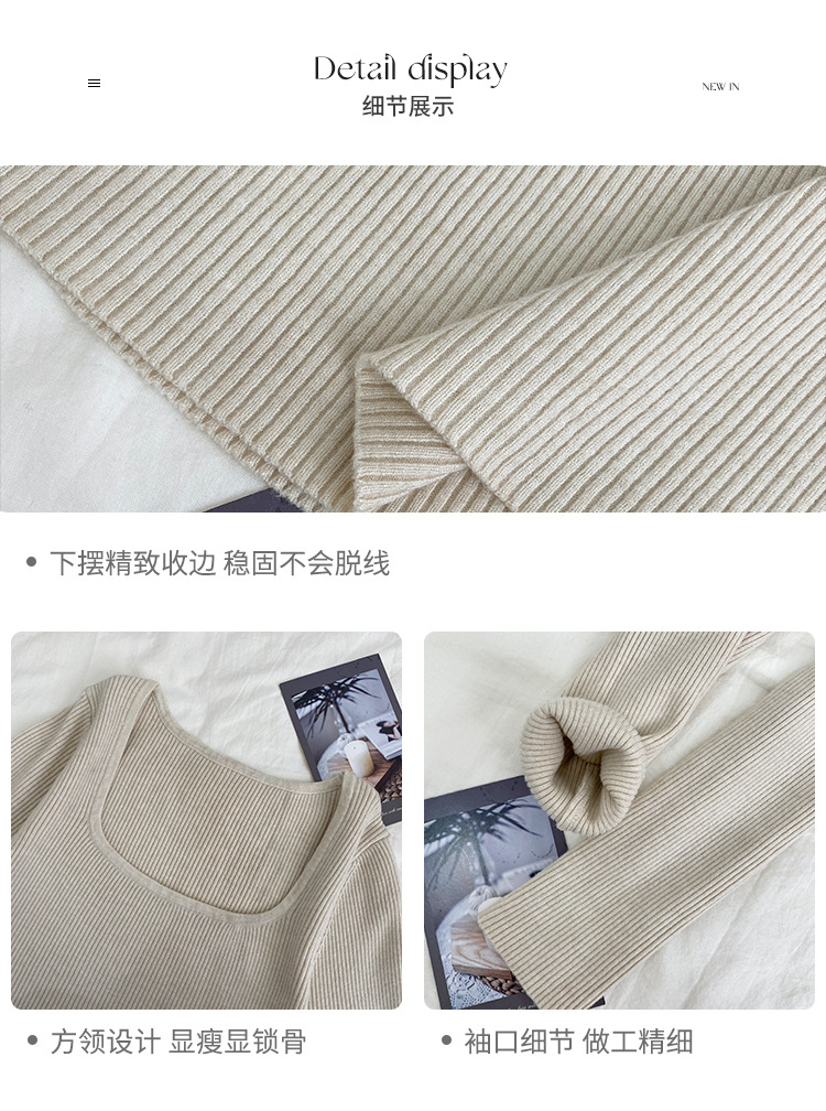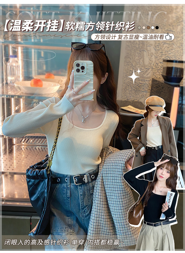 베이스 셔츠 여성의 2024 년 초가을 새로운 얇은 니트 셔츠 짧은 스웨터 슬림핏 내부 스퀘어 칼라 긴팔 탑스토어 가기