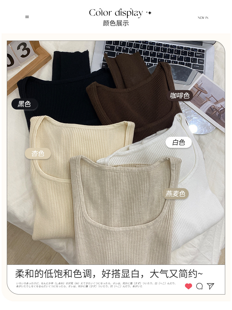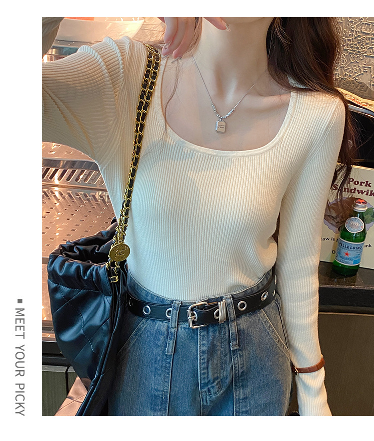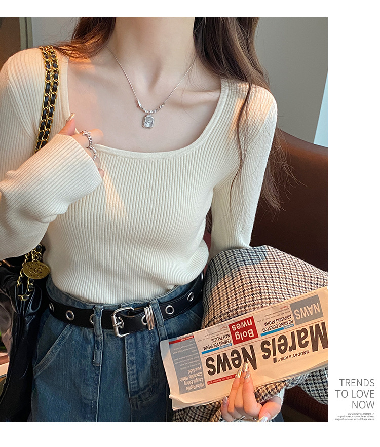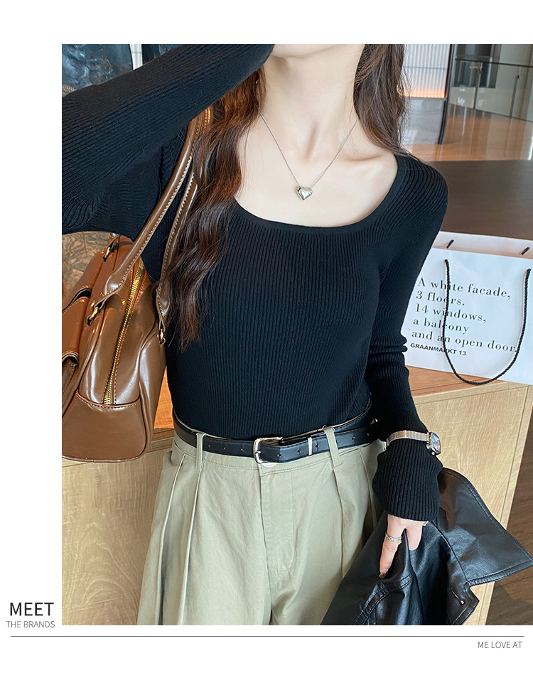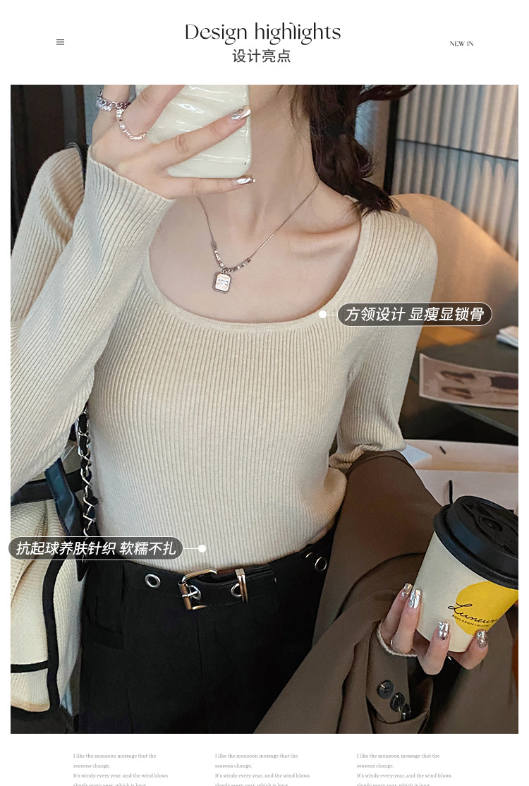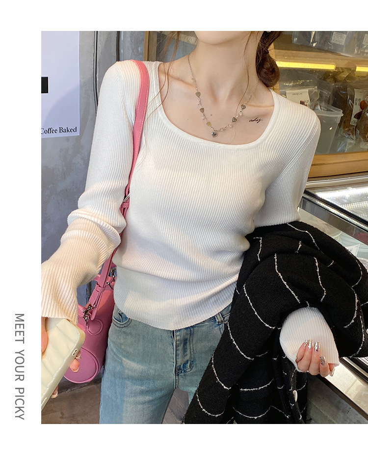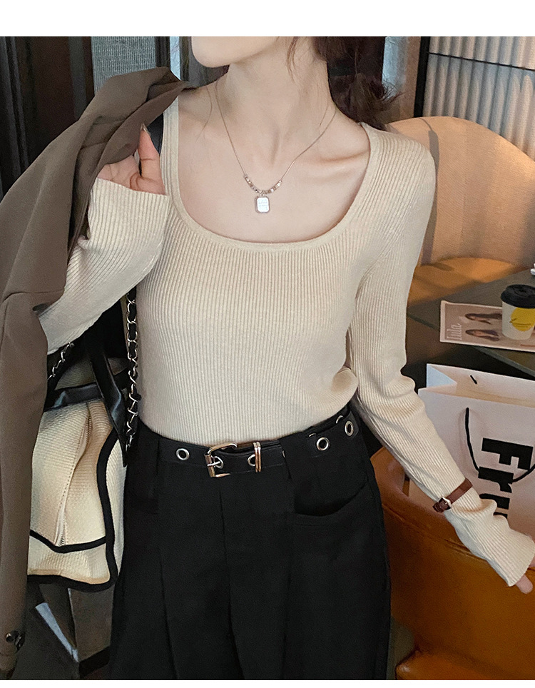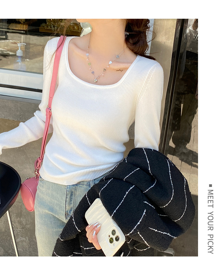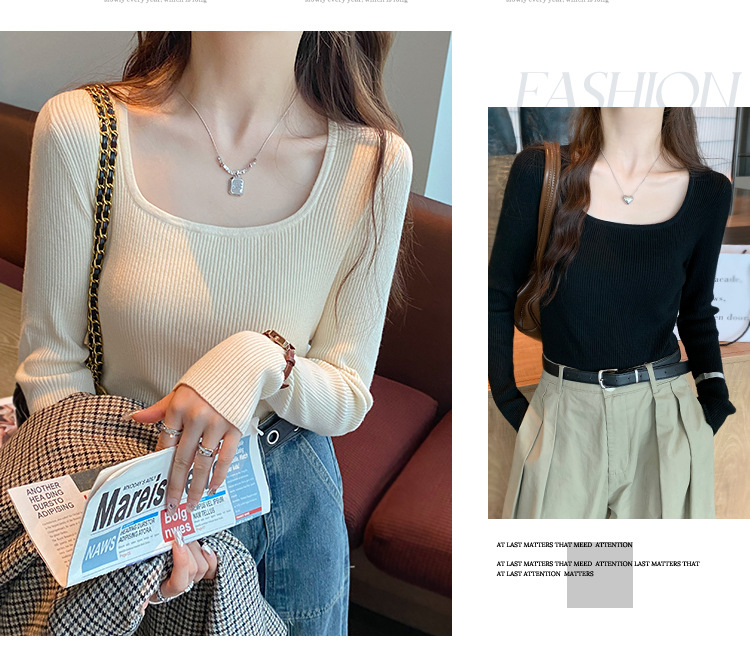 베이스 셔츠 여성의 2024 년 초가을 새로운 얇은 니트 셔츠 짧은 스웨터 슬림핏 내부 스퀘어 칼라 긴팔 탑