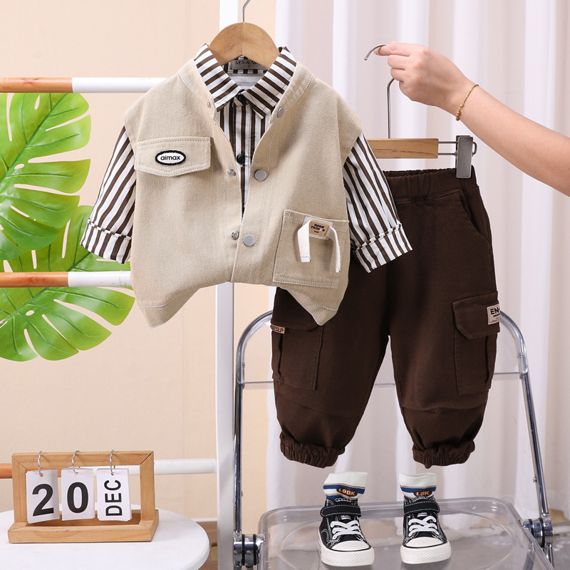 소년 가을 봄과 가을 세트 2024 새로운 아기 어린이 봄과 가을 한국 스타일 조끼 셔츠 3 피스 패션스토어 가기