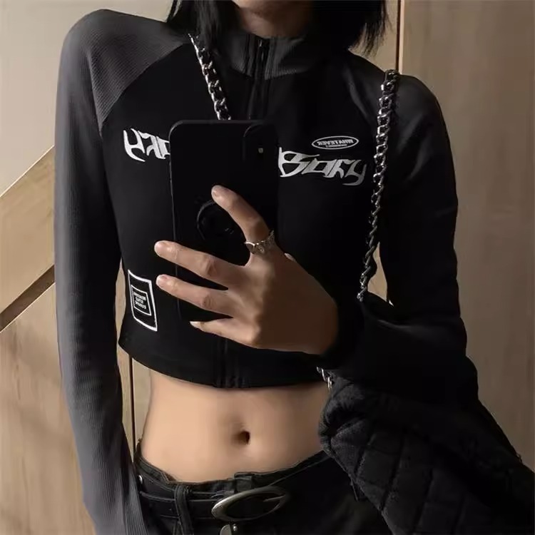 2024 년 초 가을 매운 빈티지 벨라 스타일 슬림 핏 긴팔 티셔츠 지퍼 짧은 어깨 슬리밍 탑