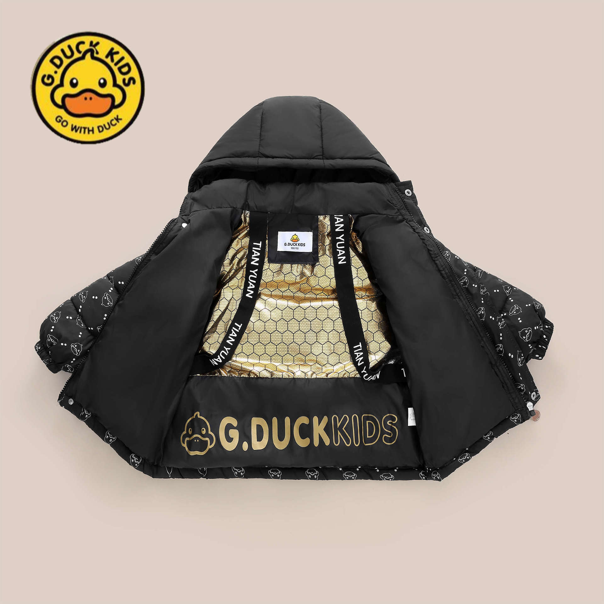 소년과 소녀를 위한 정통 작은 노란색 오리 어린이 다운 재킷, 중대형 어린이 블랙 골드 그래핀 가열 비수기 다운 재킷스토어 가기