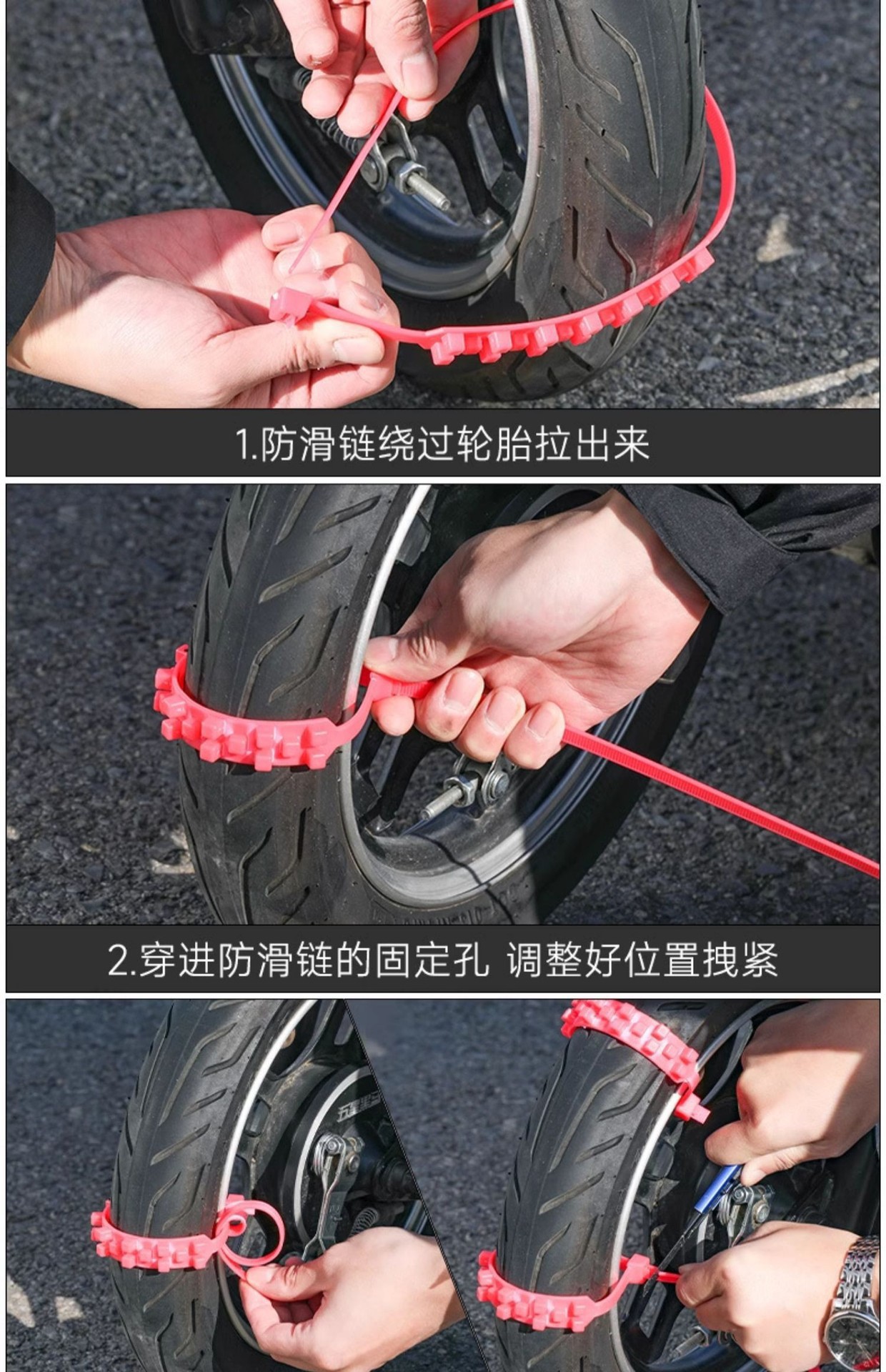 범용 2 륜 3 륜 배터리 자동차 전기 자동차 스노우 체인 오토바이 타이어 타이는 타이어 스노우 체인을 손상시키지 않습니다.