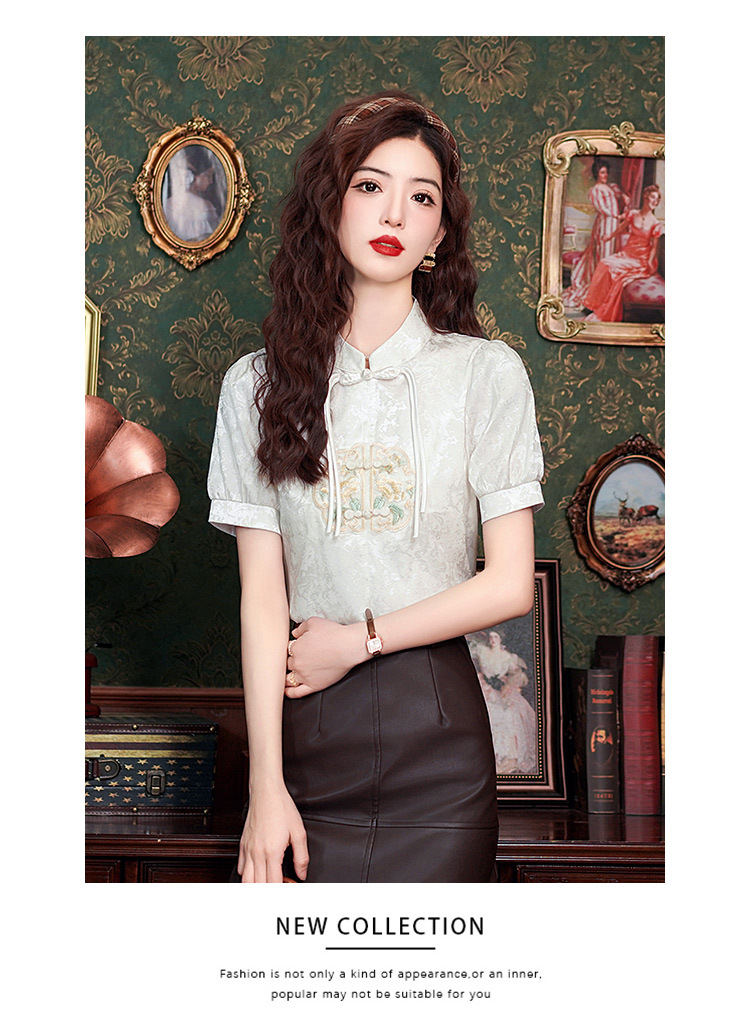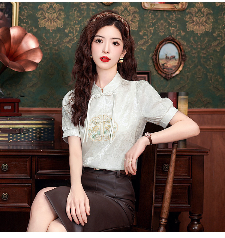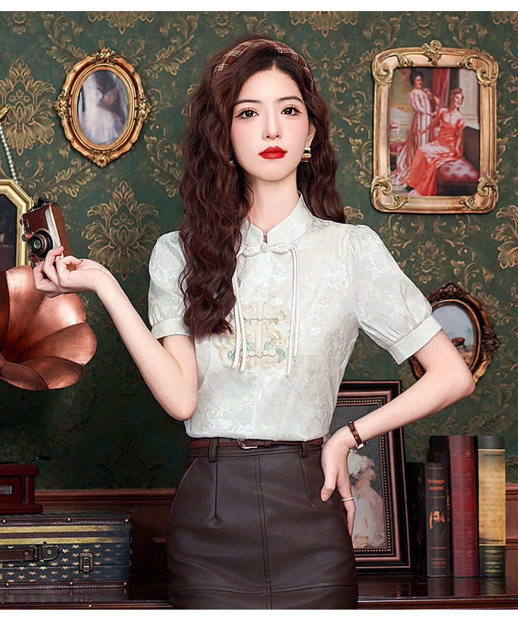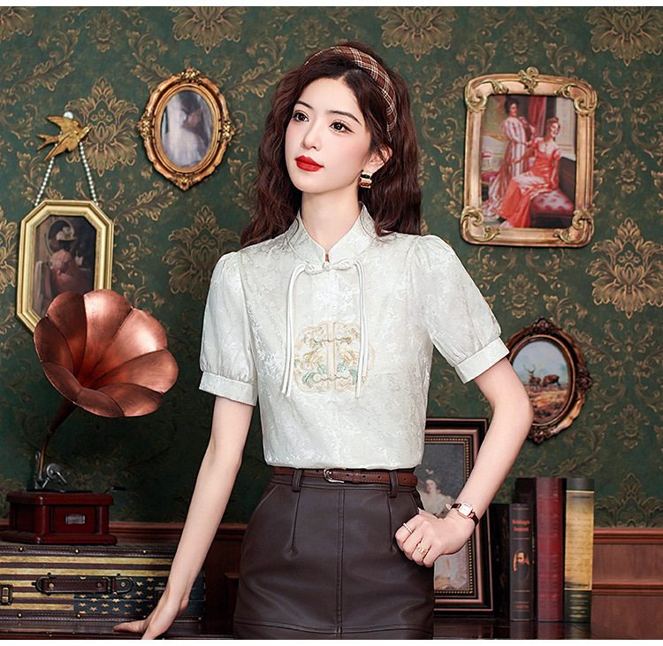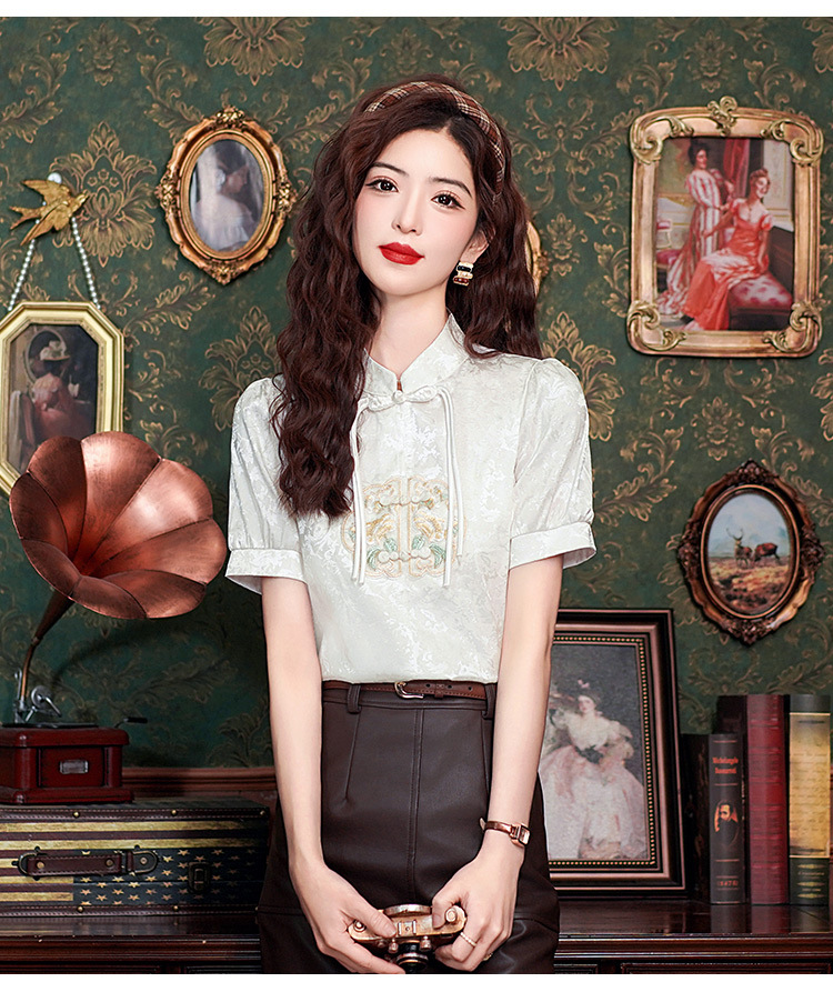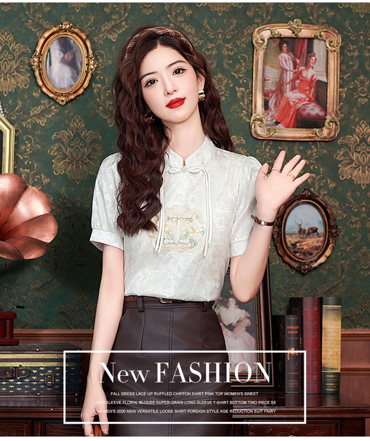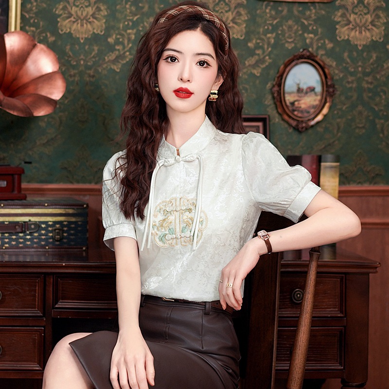 빈티지 새로운 중국 스타일 에이지 감소 시폰 셔츠 여성용 여름 자수 반팔 셔츠 중국 스타일 수직 칼라 버튼 탑