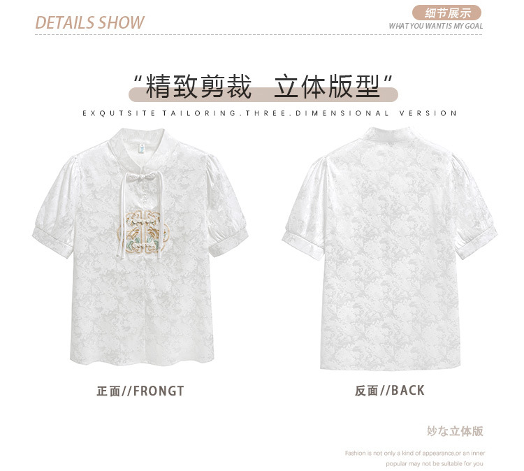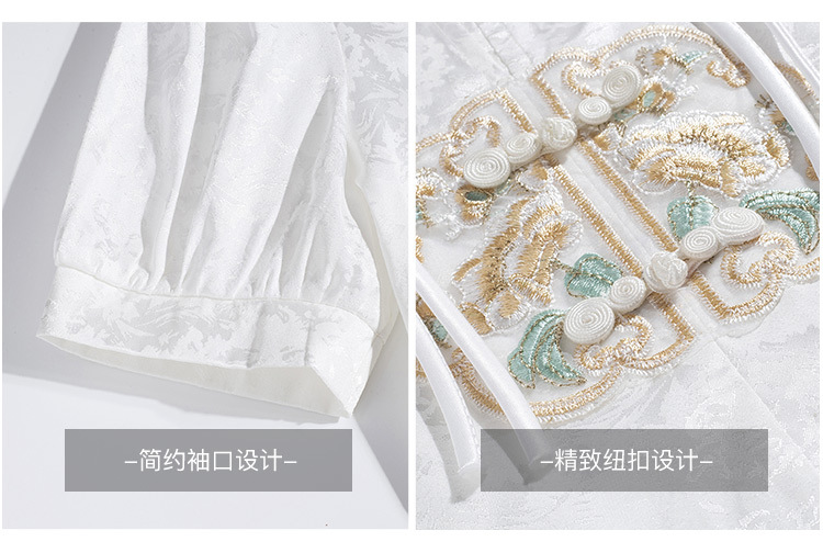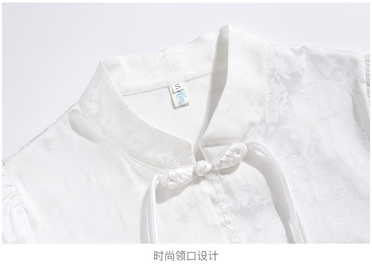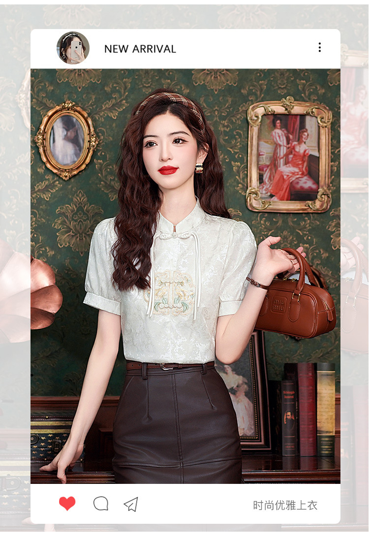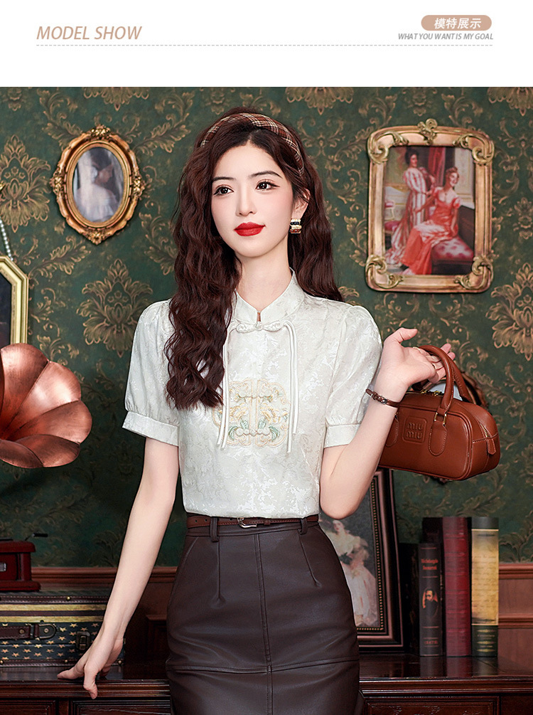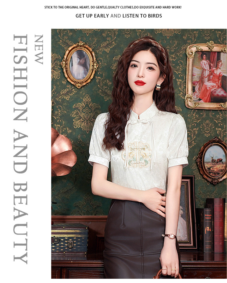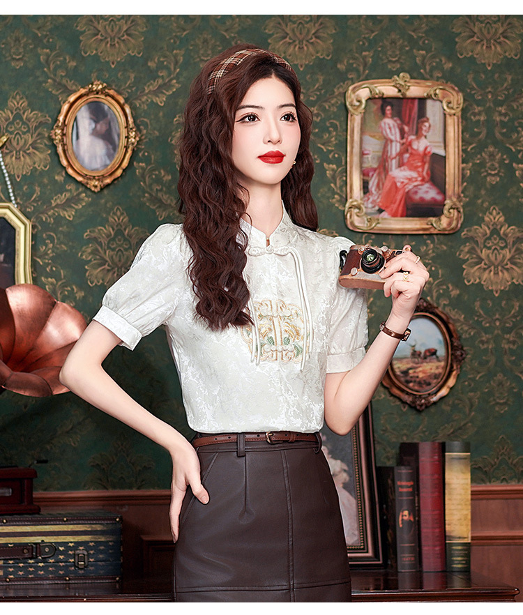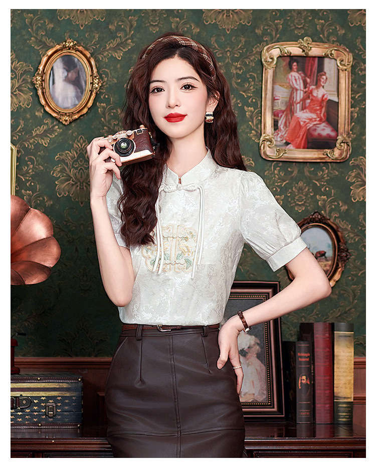 빈티지 새로운 중국 스타일 에이지 감소 시폰 셔츠 여성용 여름 자수 반팔 셔츠 중국 스타일 수직 칼라 버튼 탑