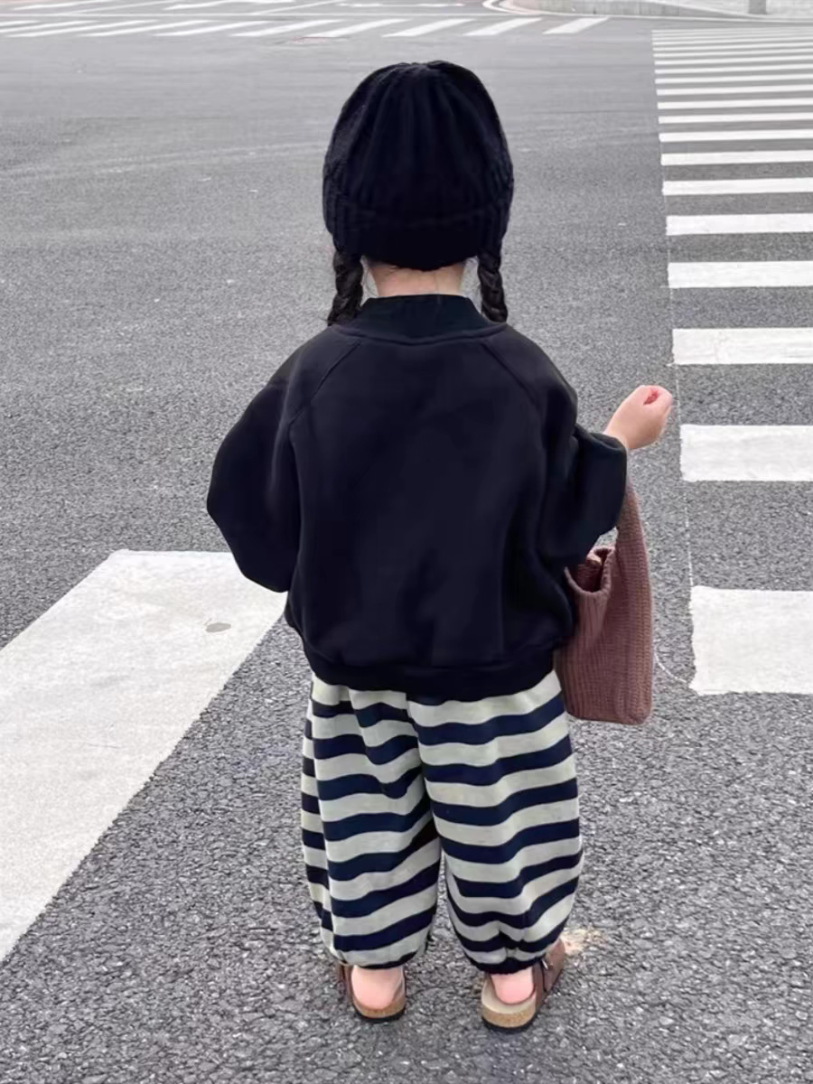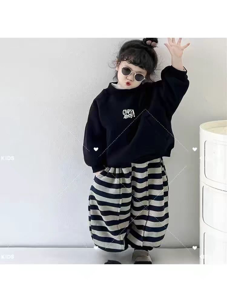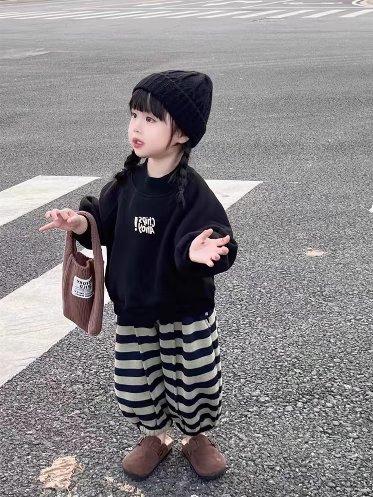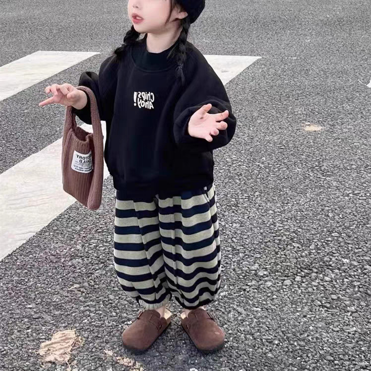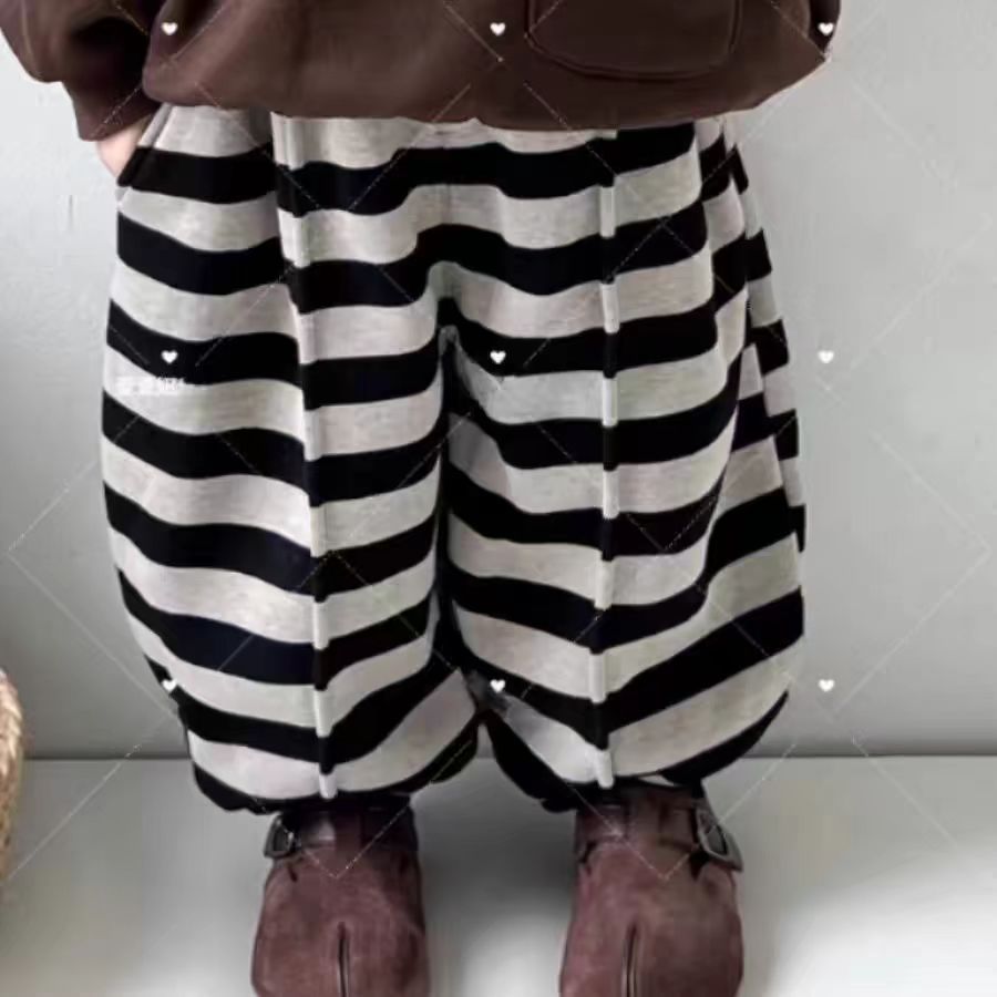한국 스타일 어린이 봄과 가을 2024 소년 소녀를위한 새로운 도착 줄무늬 캐주얼 바지 아기 세련된 느슨한 패션 스웨트 바지