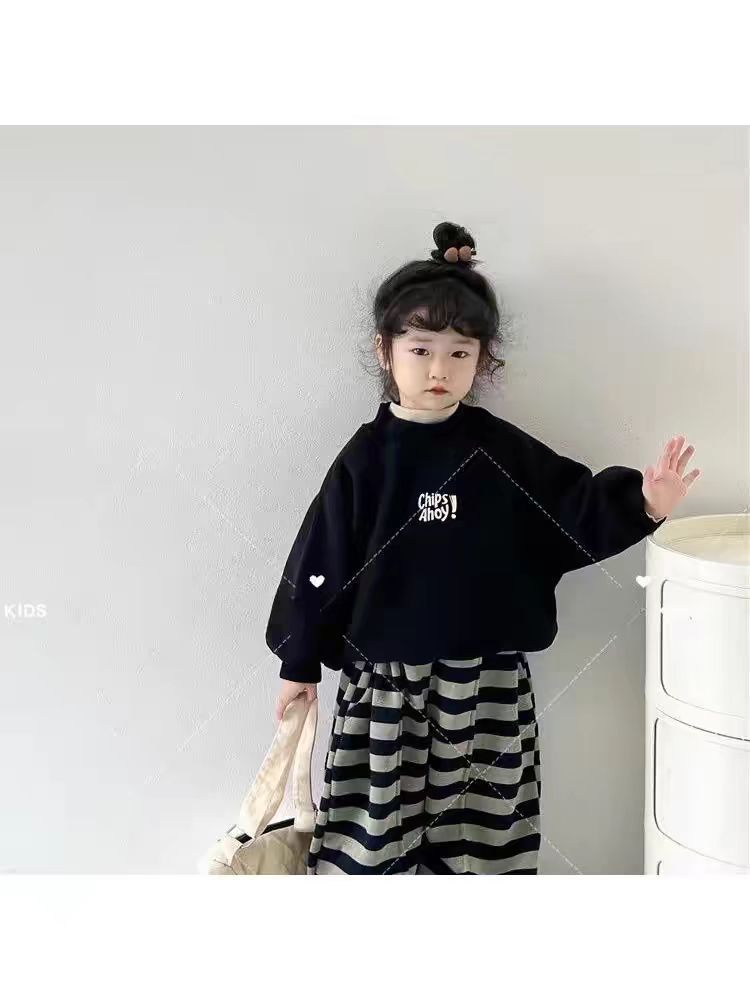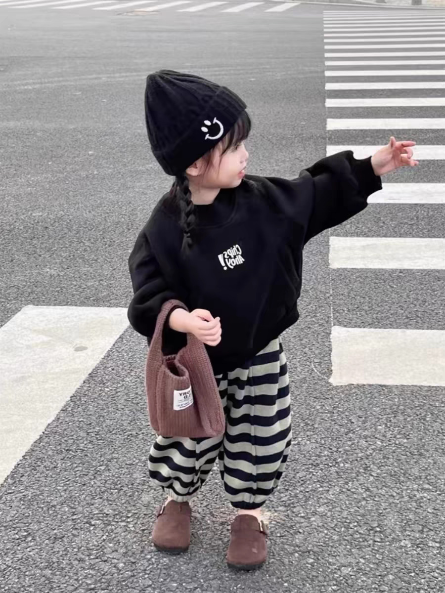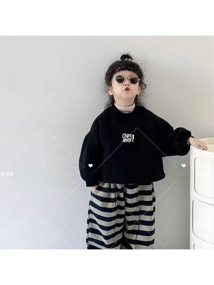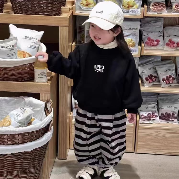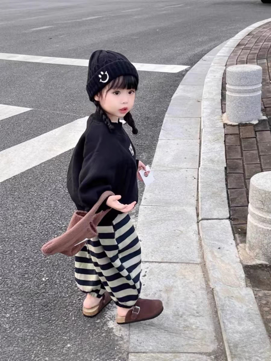 한국 스타일 어린이 봄과 가을 2024 소년 소녀를위한 새로운 도착 줄무늬 캐주얼 바지 아기 세련된 느슨한 패션 스웨트 바지