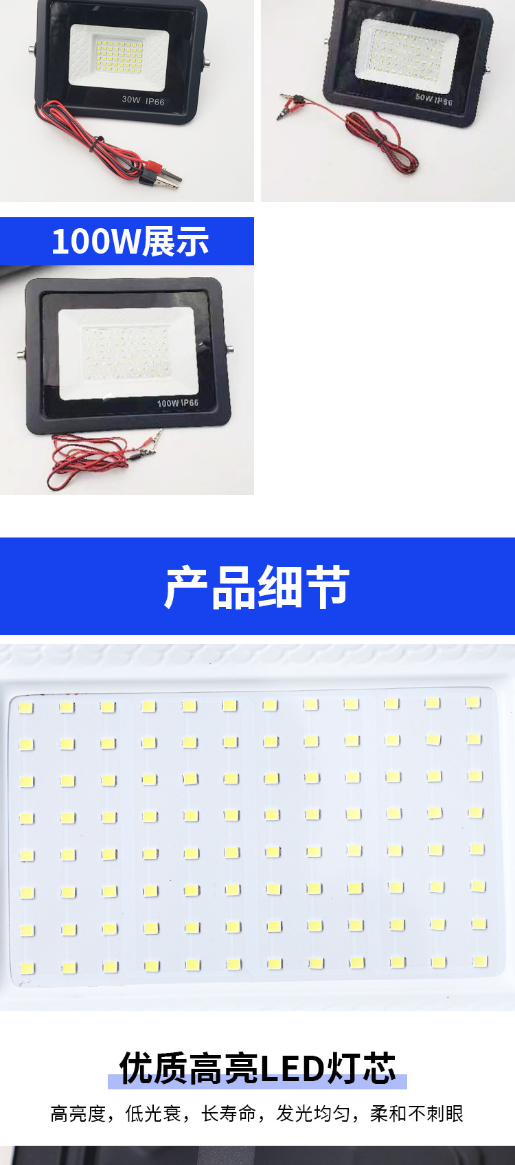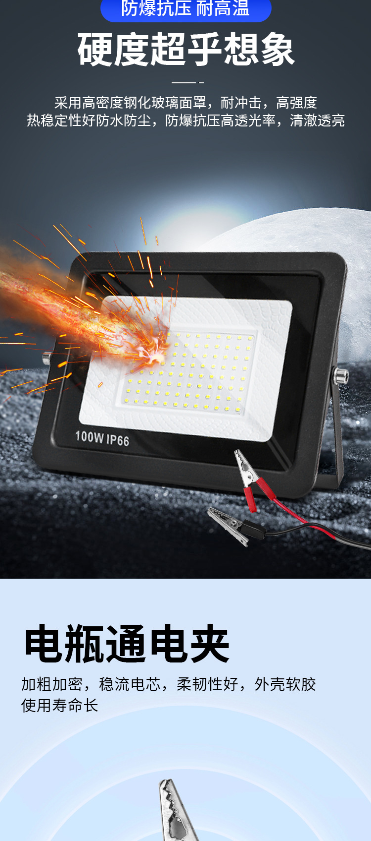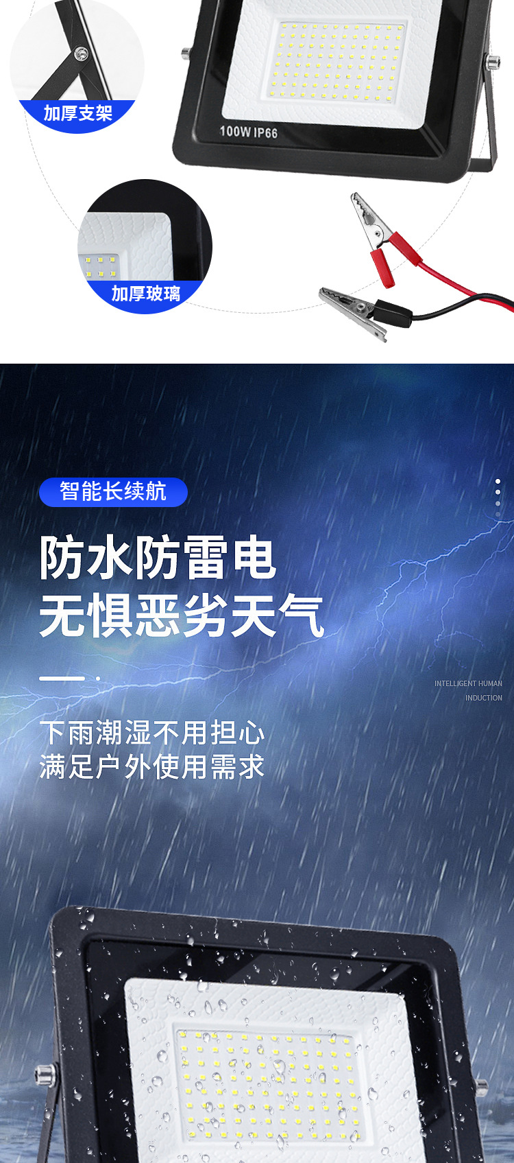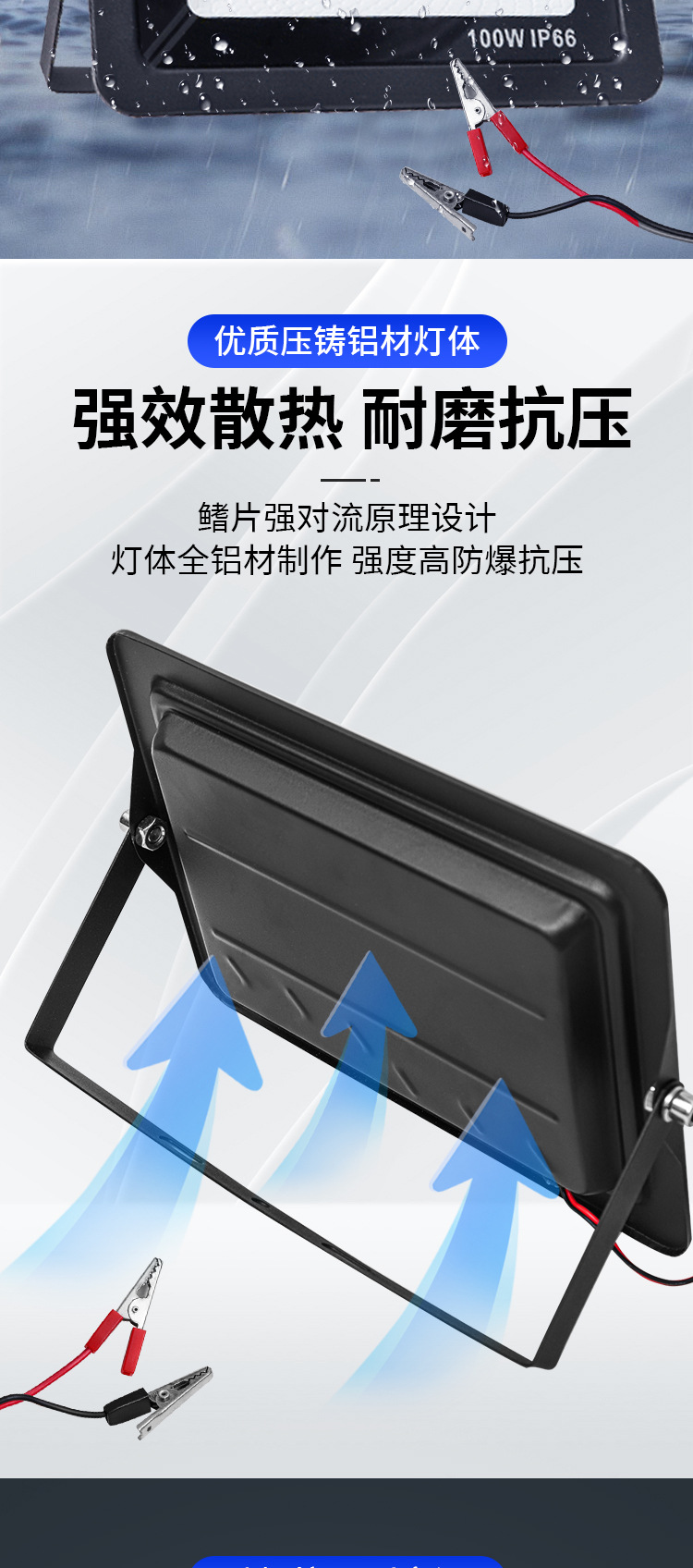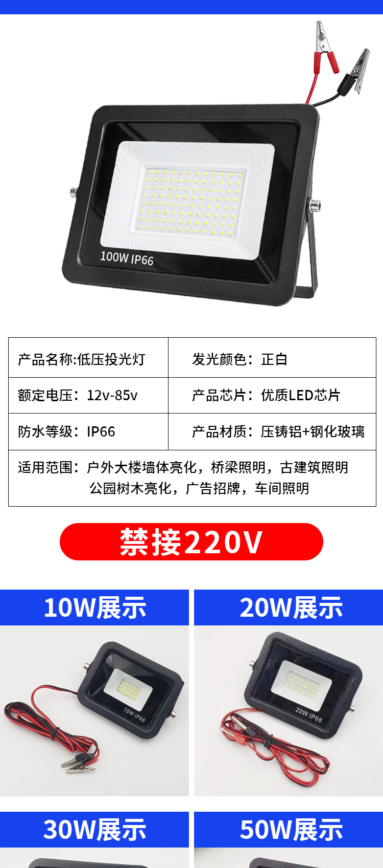 DC12V 低压鳄鱼夹子LED投光灯100W高亮度 防水户外LED泛光灯代发