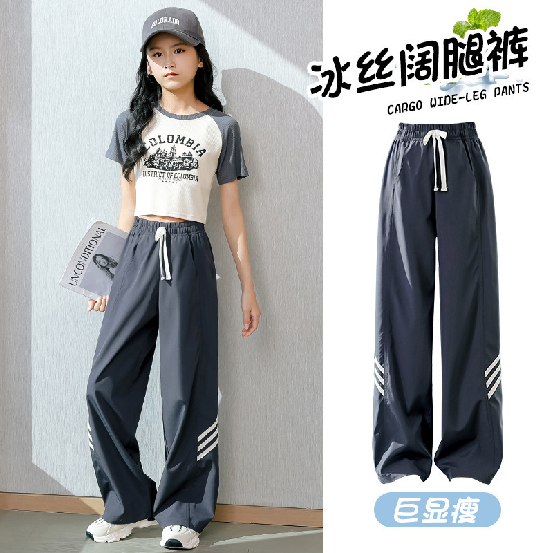 소녀 넓은 다리 바지 2024 새로운 어린이 바지 여름 얇은 얼음 실크 스트레이트 바지 큰 어린이 여성 여름 옷 빠른 건조