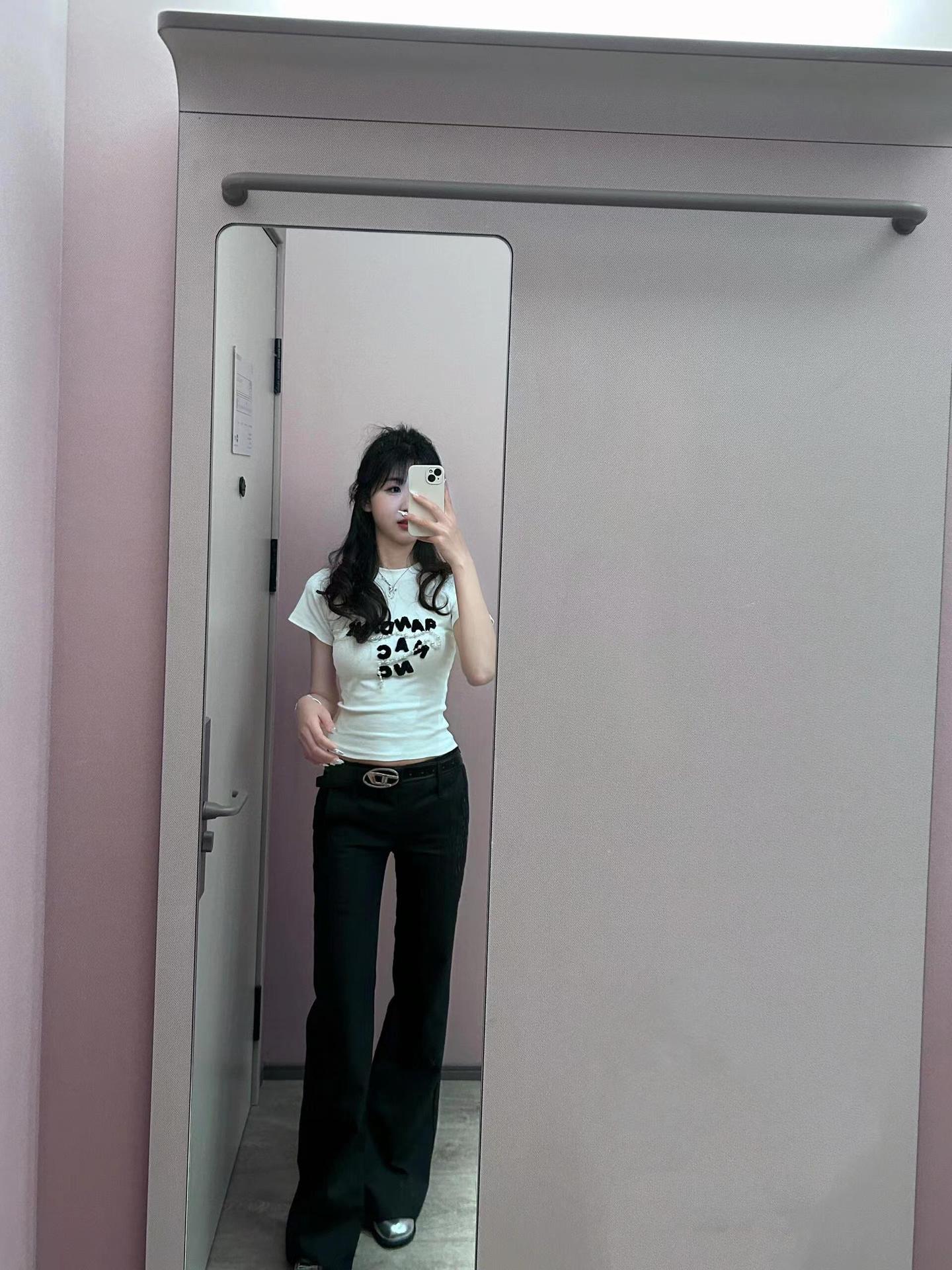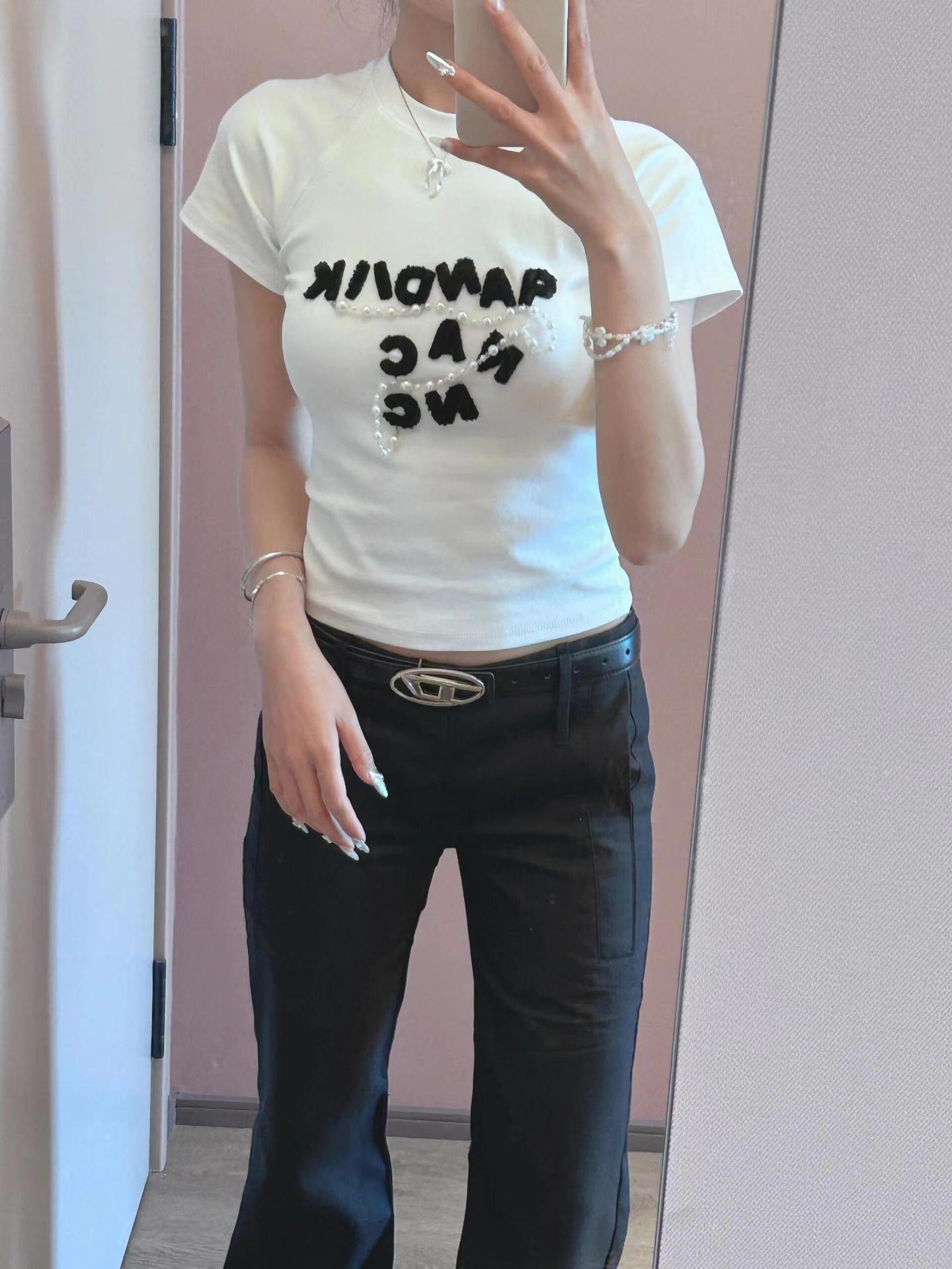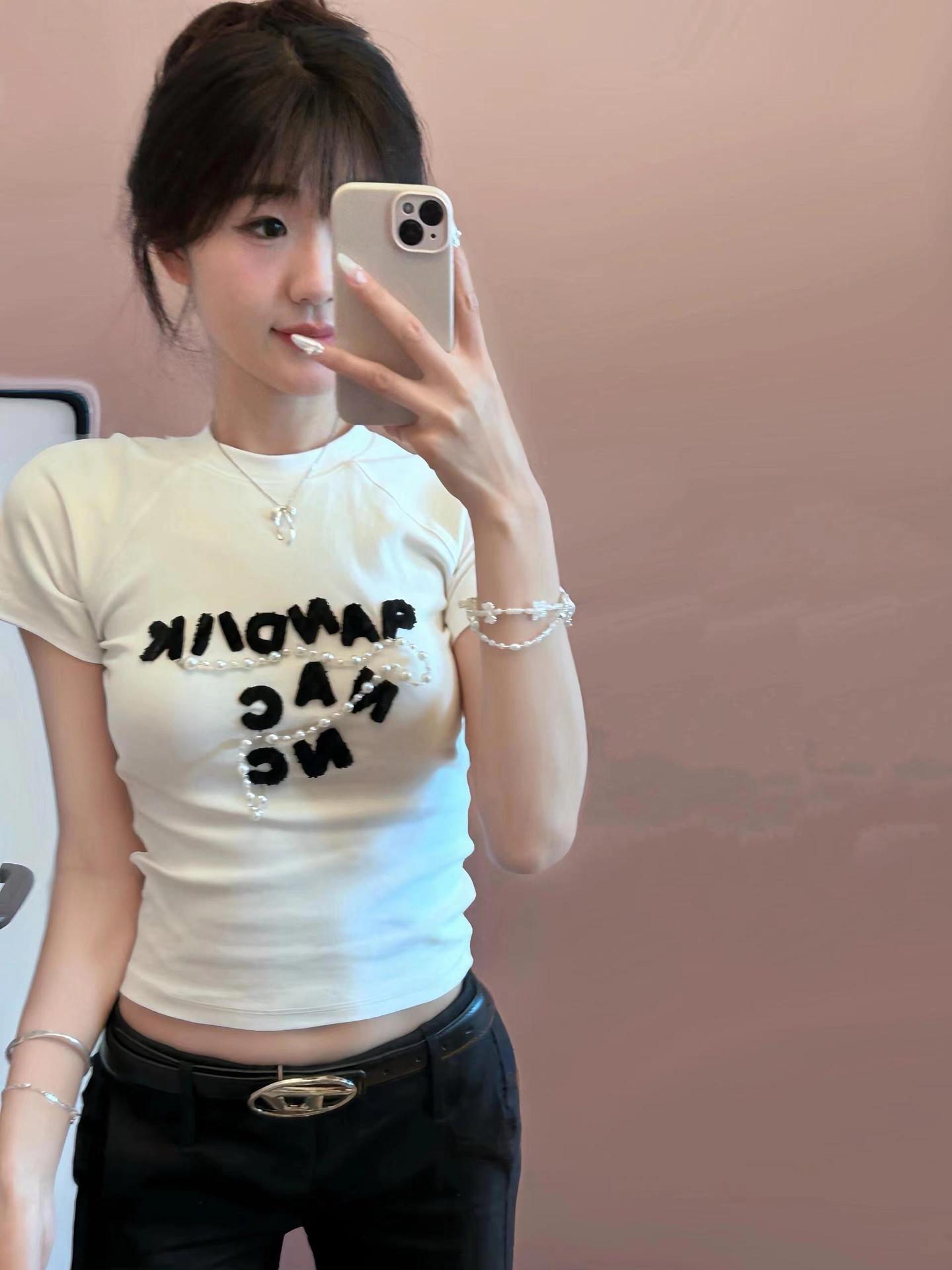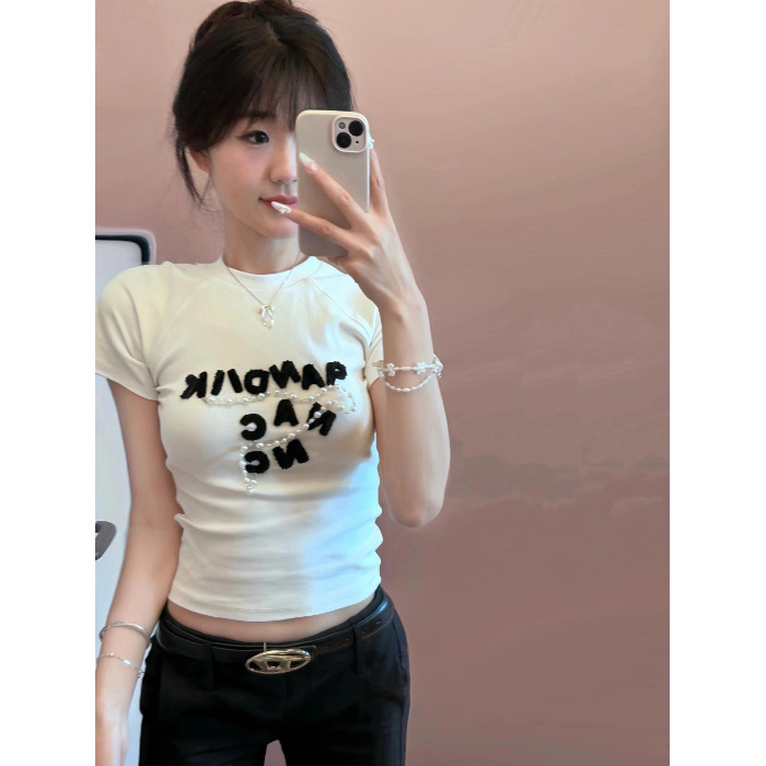 아메리칸 스타일 레트로 반팔 티셔츠 여성용 여름 슬림 핏 슬리밍 퓨어 코튼 디자인 센스 탑 펄 체인 화이트 티셔츠 트렌디스토어 가기