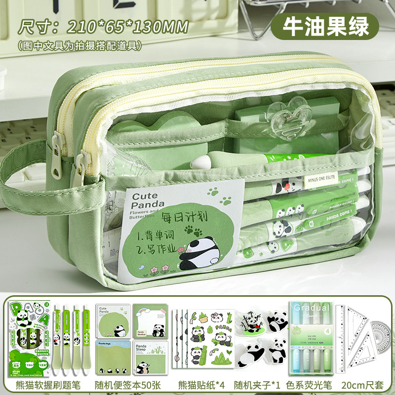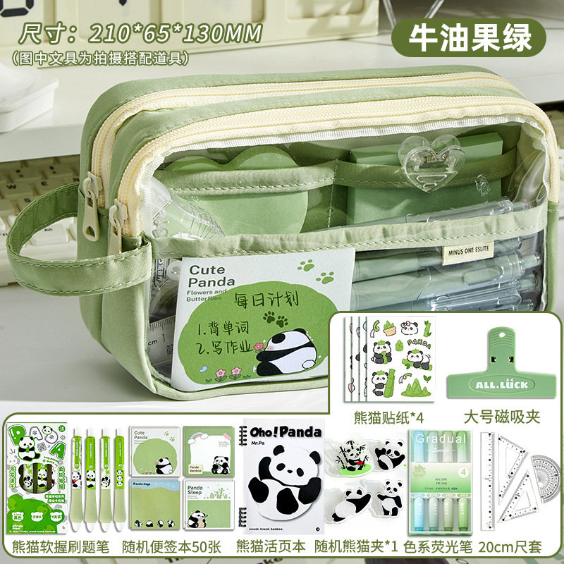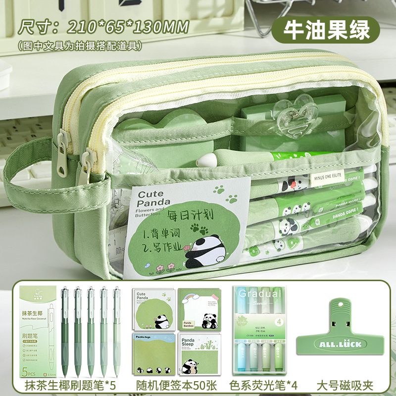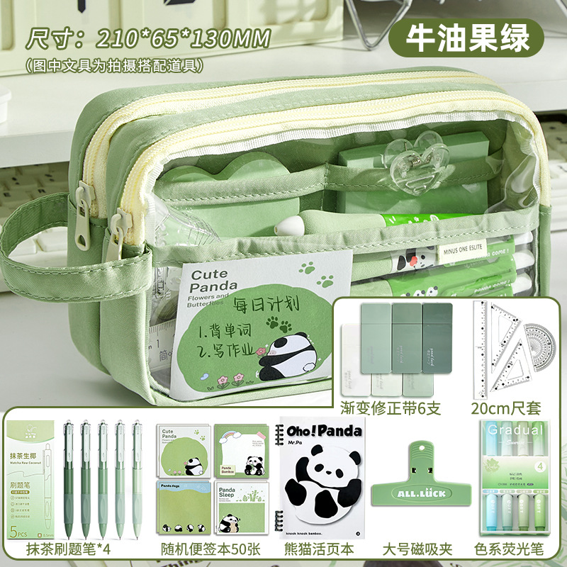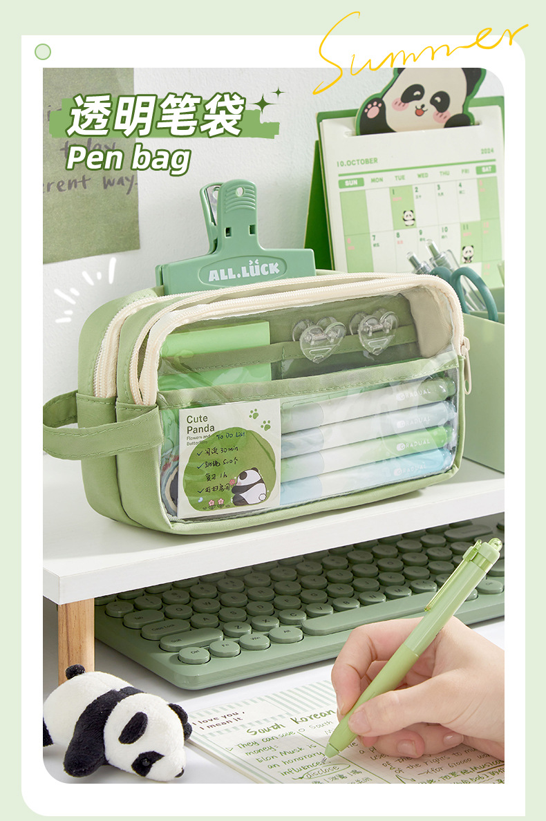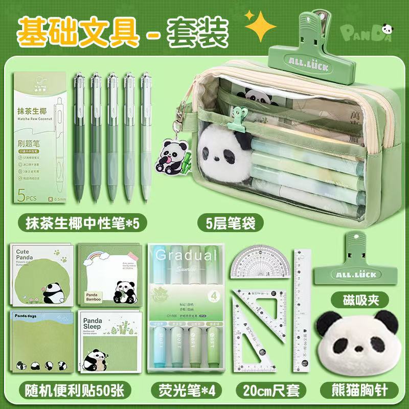 • 필통 + 말차 브러쉬 + 자석 클립 + 메모장 + 형광펜 + 자 커버 + 수정테이프 + 노트 + 팬더 펜 +
