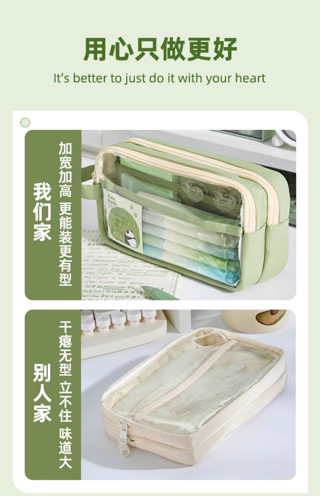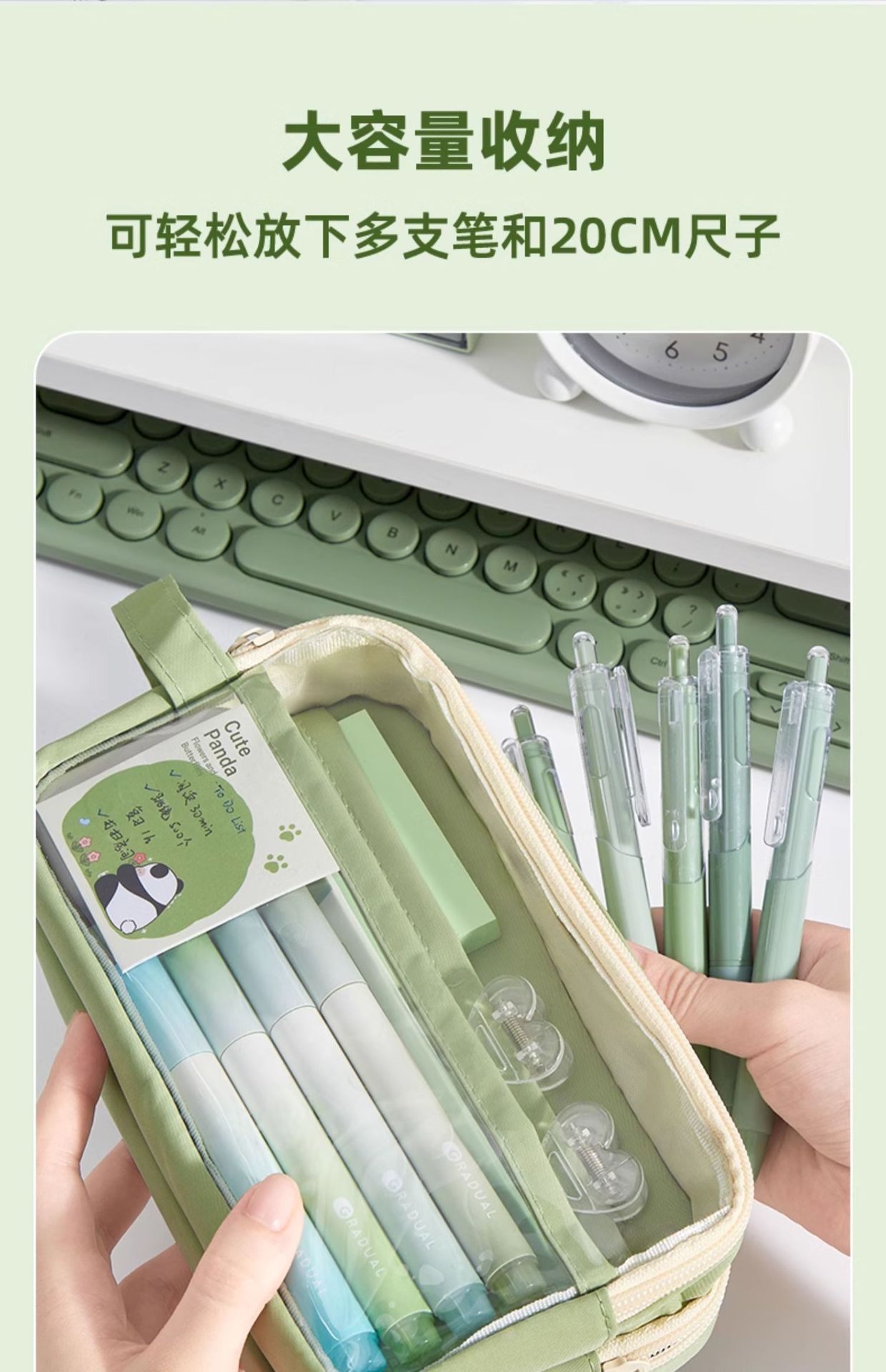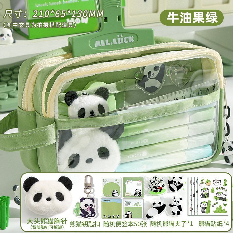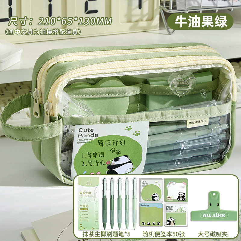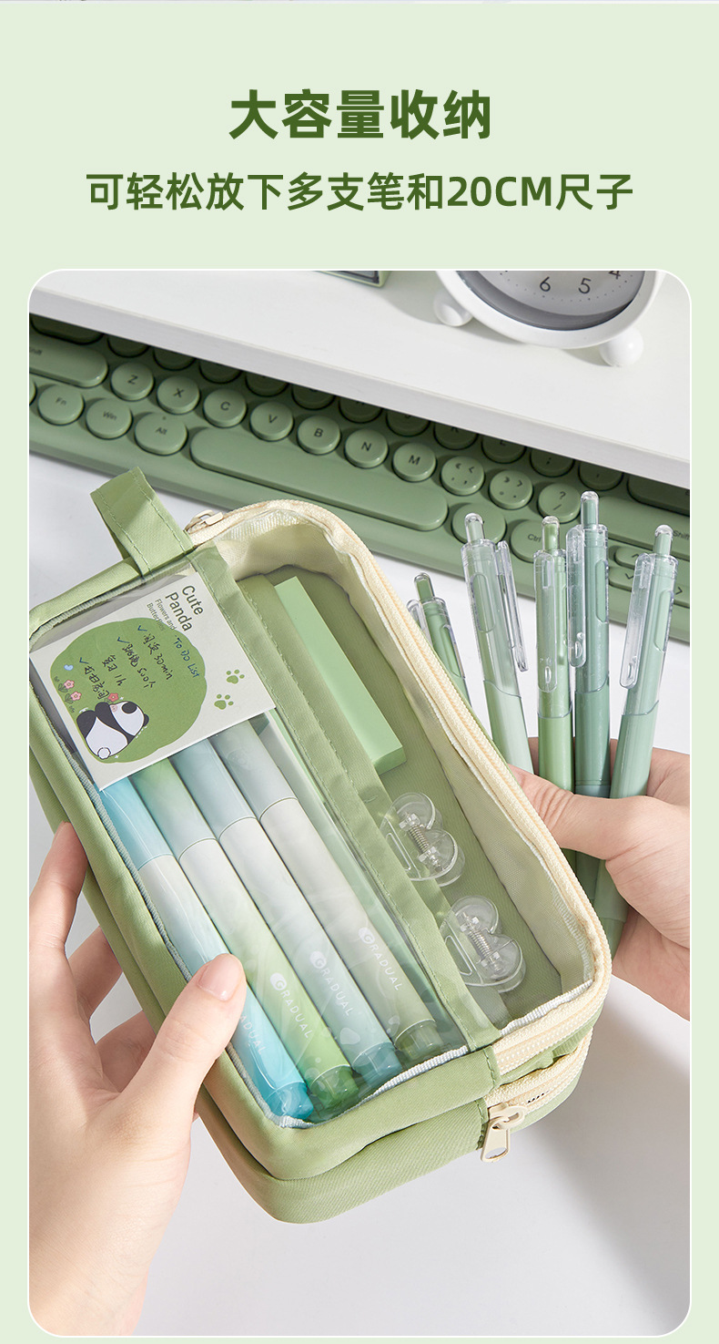 • 필통 + 말차 브러쉬 + 자석 클립 + 메모장 + 형광펜 + 자 커버 + 수정테이프 + 노트 + 팬더 펜 +