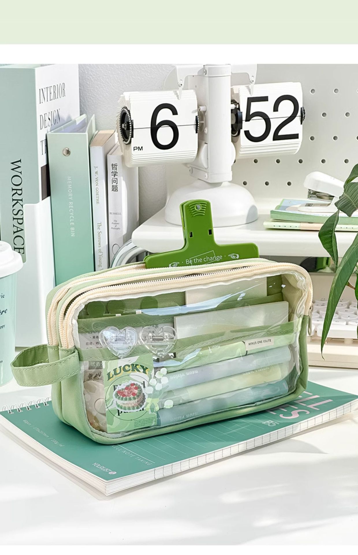 • 필통 + 말차 붓 + 대형 자석 클립 + 메모장 + 형광펜 + 자 커버 + 수정테이프 + 노트