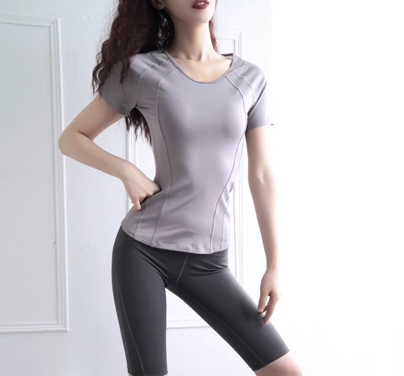 국경 간 퀵 드라이 스트레치 요가 세트 꽉 끼는 스포츠 탑 여성 여름 슬림 핏 통기성 반팔 피트니스 러닝 티셔츠