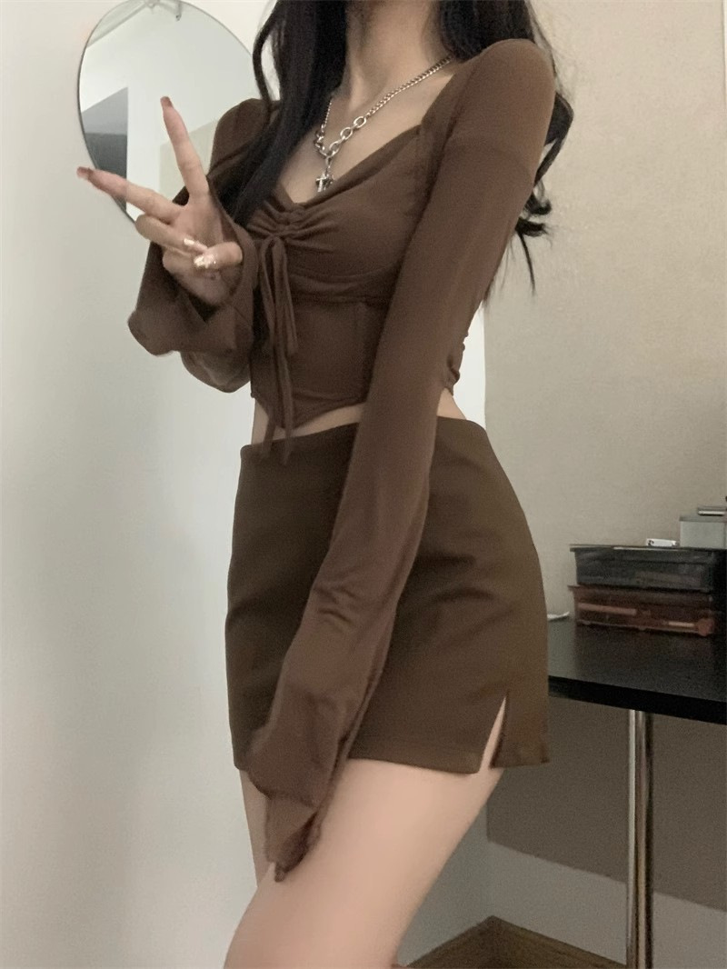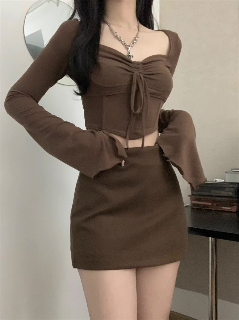 가을 작은 순수한 바람 달콤한 뜨거운 소녀 착용 다크 브라운 긴 소매 탑 엉덩이 치마 가벼운 요리 투피스 세트 여성스토어 가기