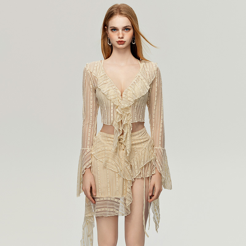 비키니 수영복 여성용 2024 새로운 분할 4 피스 세트 레이스 긴 소매 섹시한 슬리밍 온천 해변 휴가