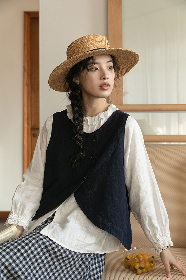 가을 2024 새로운 도착 프랑스 예술적 복고풍 꽃 목화 린넨 긴 소매 흰색 셔츠 짧은 조끼