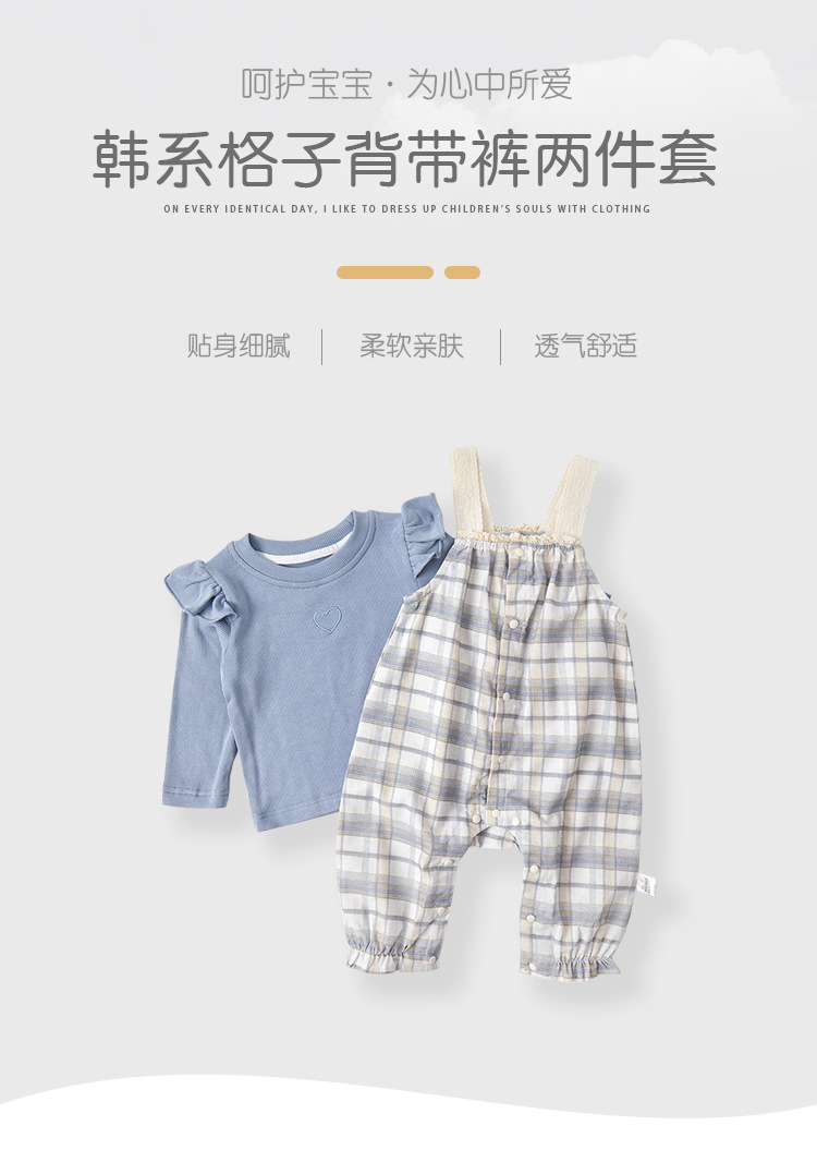 베이비 세트 가을 새로운 긴 소매 바닥 셔츠 + 한국 버전의 격자 무늬 멜빵 0-1 아기 옷 겉옷스토어 가기