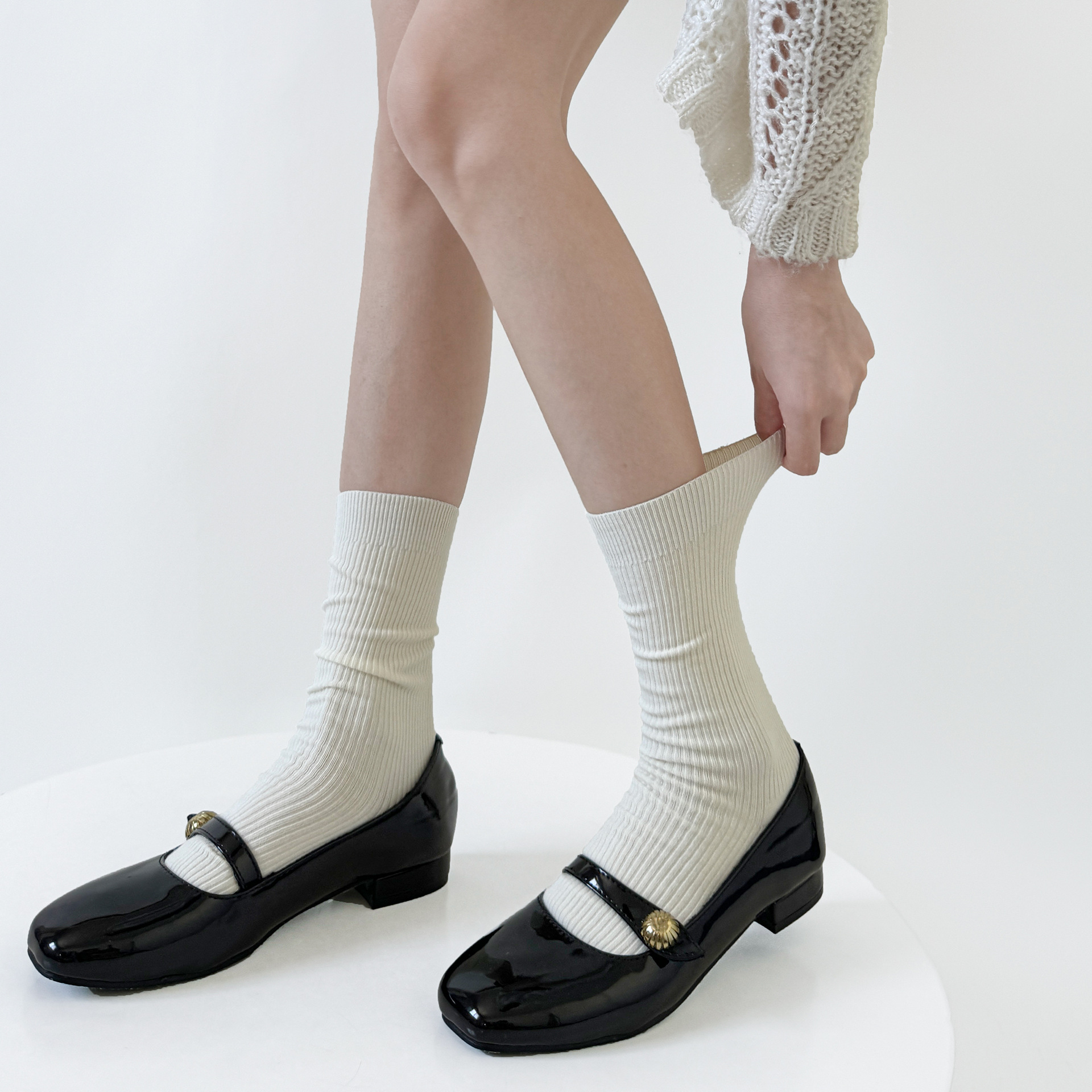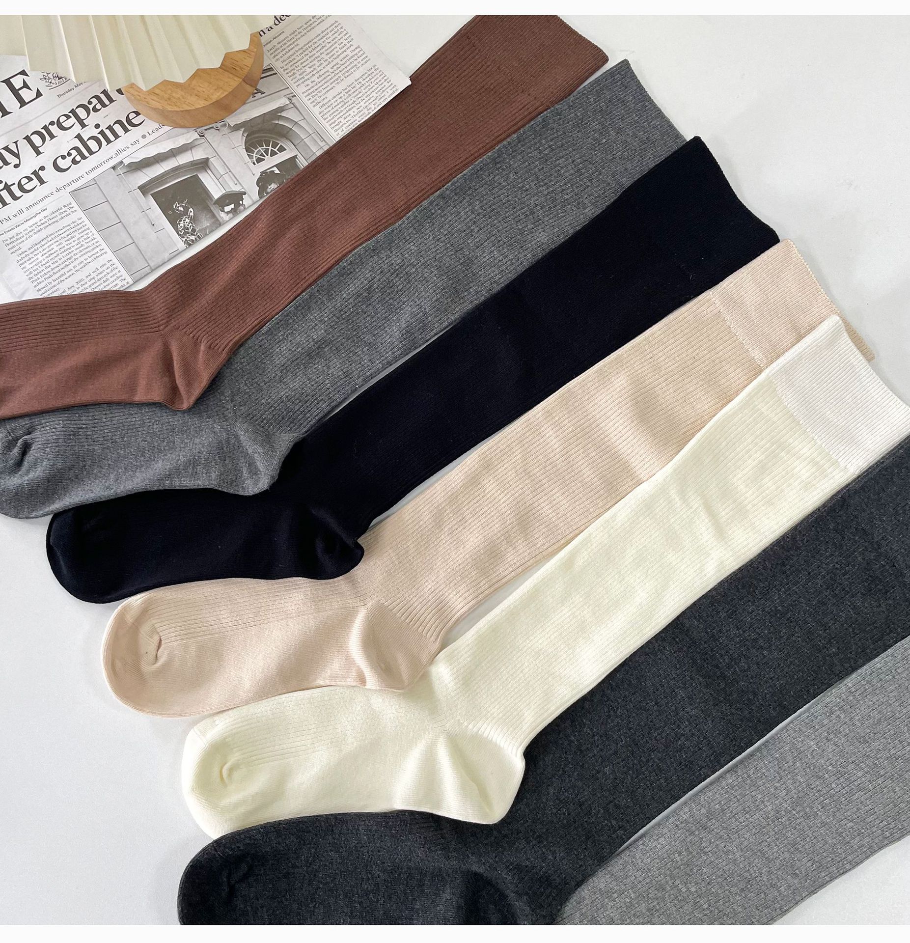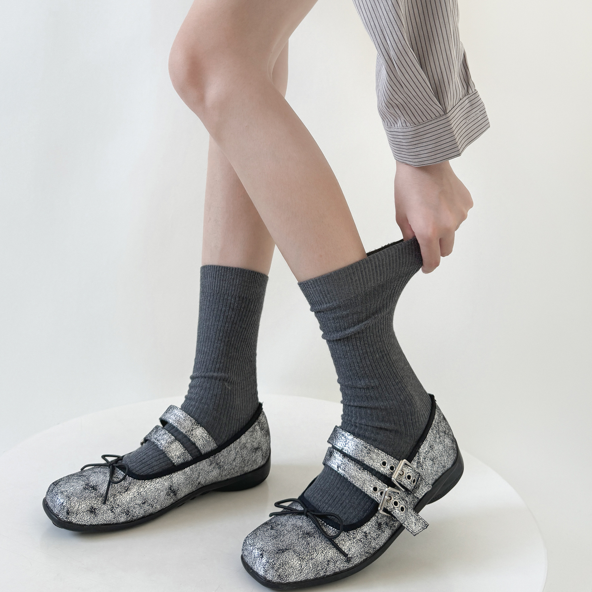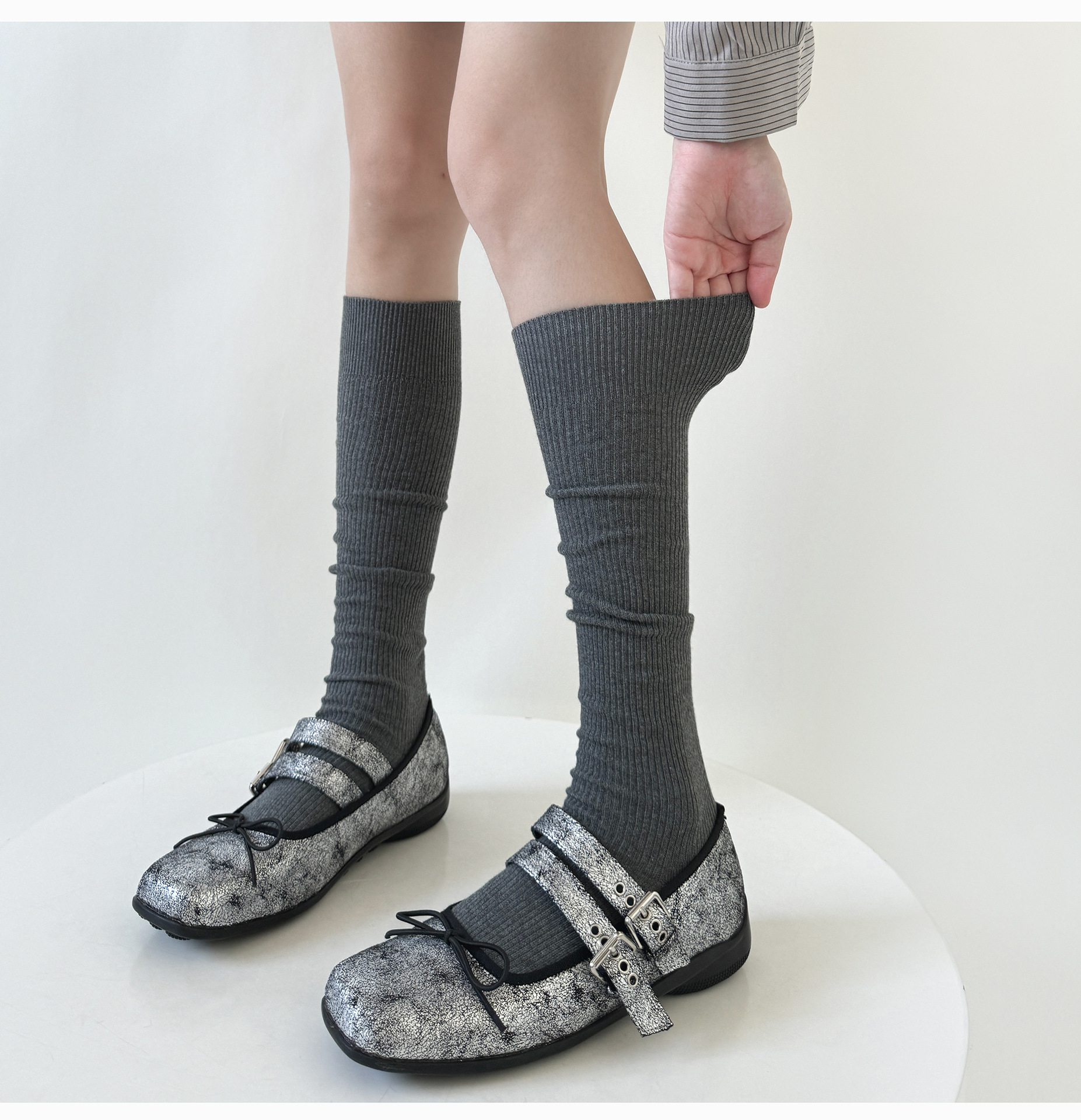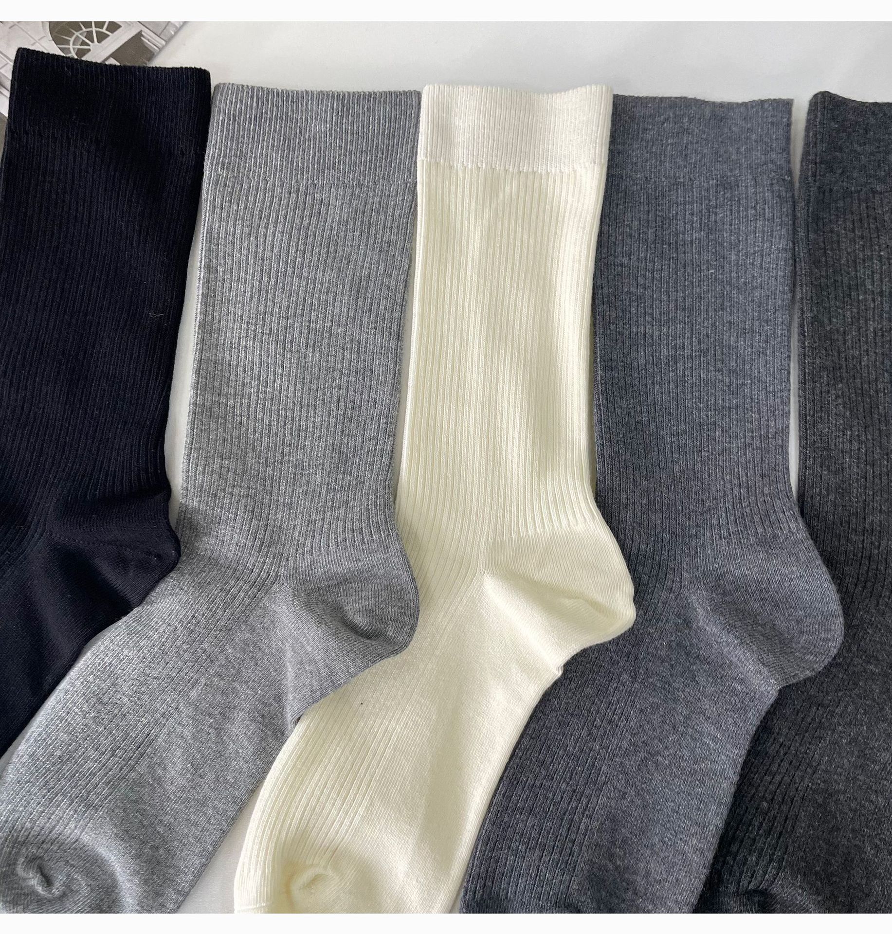 일본 JK 양말 우유 흰색 수직 줄무늬 송아지 양말 봄과 가을 슬리밍 압력 스택 양말 회색 면 얇은 중간 튜브 양말