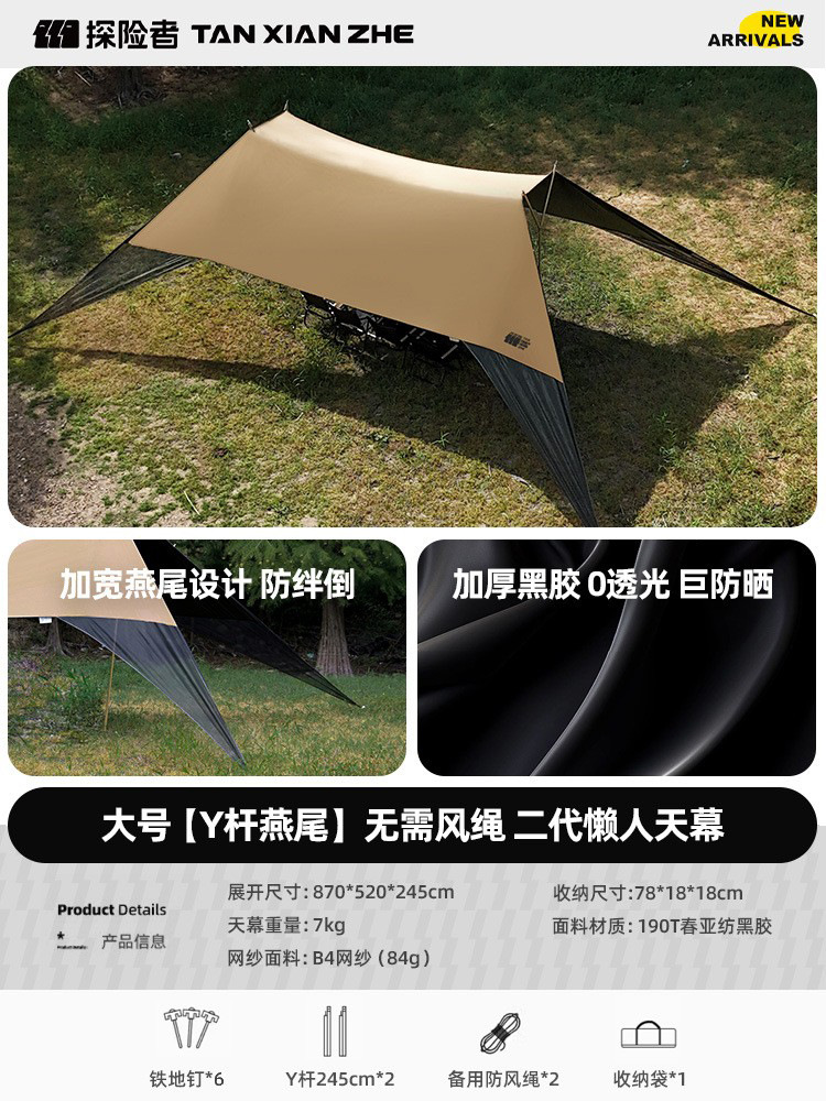 탐험가 바람이없는 로프 무료 건물 게으른 도브 테일 Y 막대 검은 접착제 캐노피 선 스크린 야외 캠핑 장비