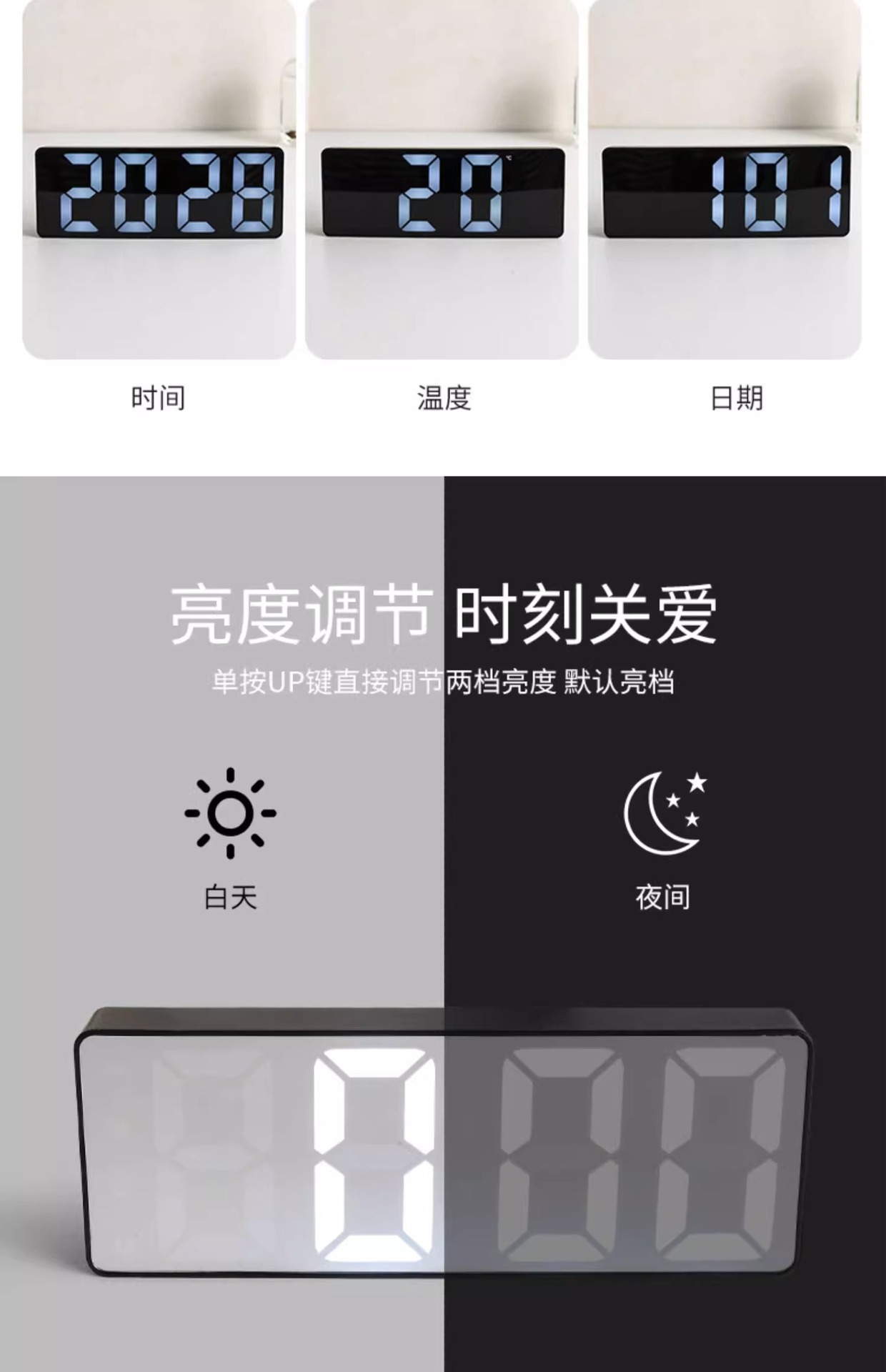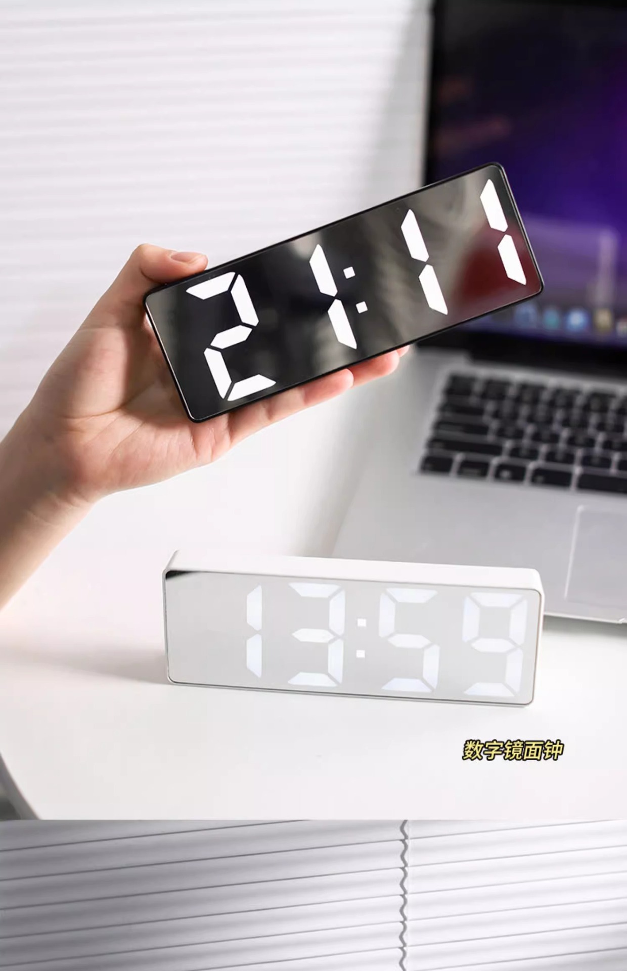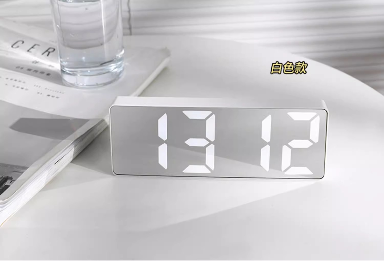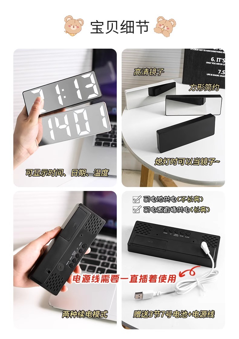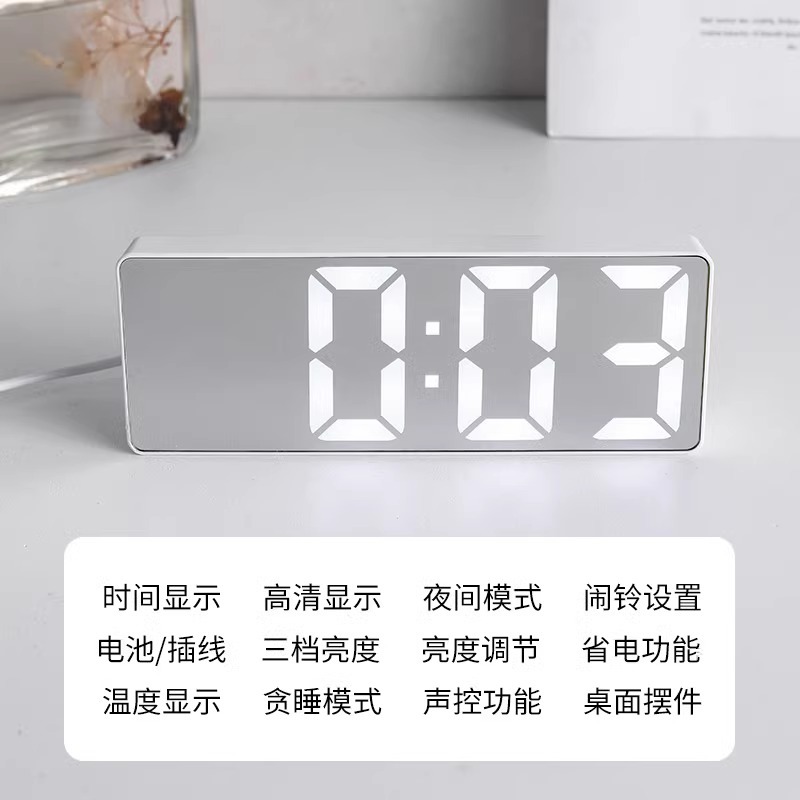 • 흰색 거울 알람시계 업그레이드 모델(USB 케이블 + 배터리 포함) 다기능
