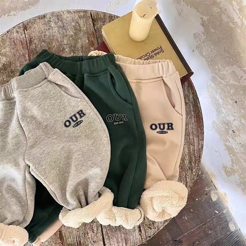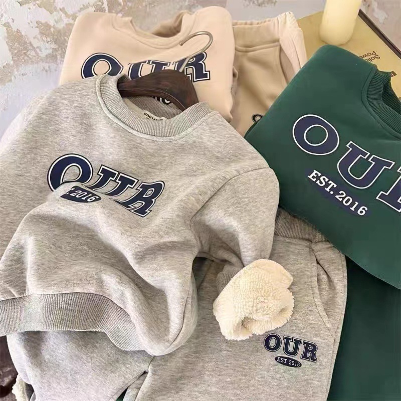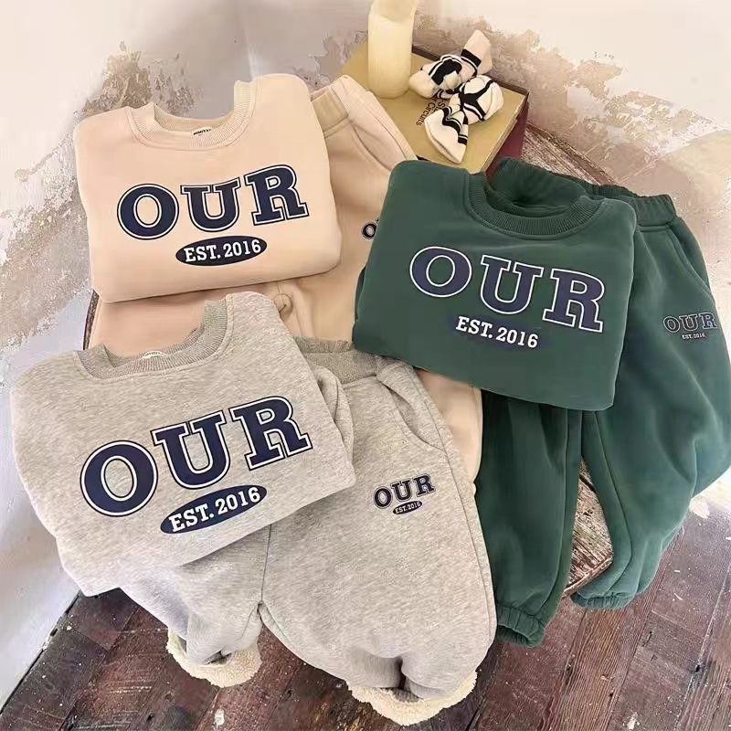 국경 간 재고 가을과 겨울 어린이 기모 둥근 목 세트 소년 소녀 패션 편지 인쇄 스웨터 2 피스 도매