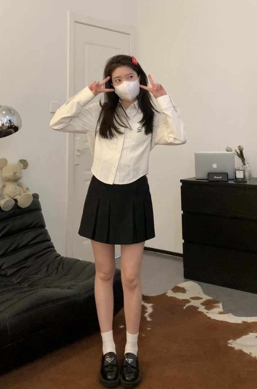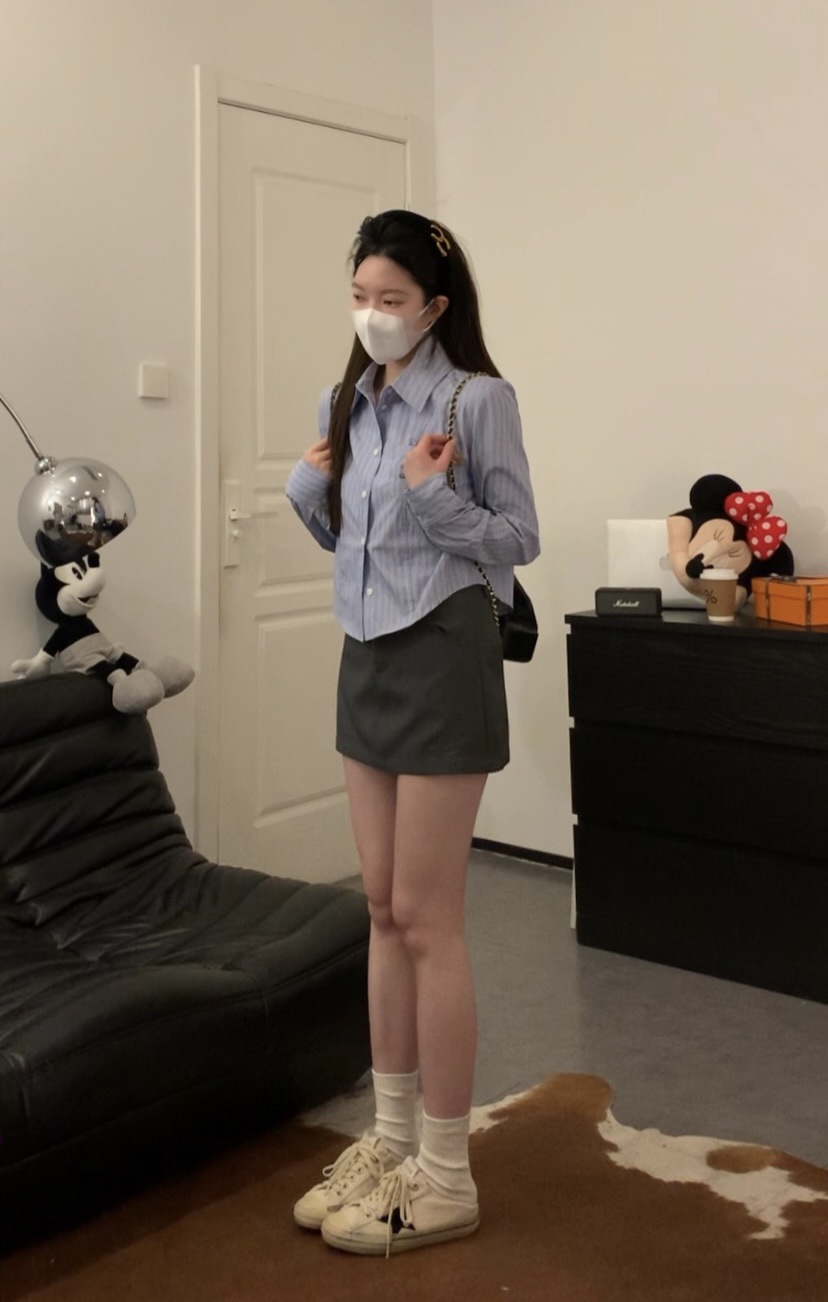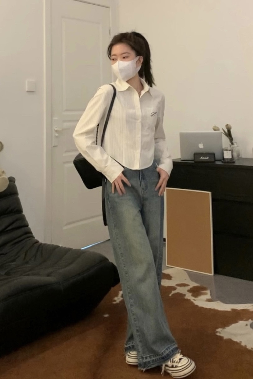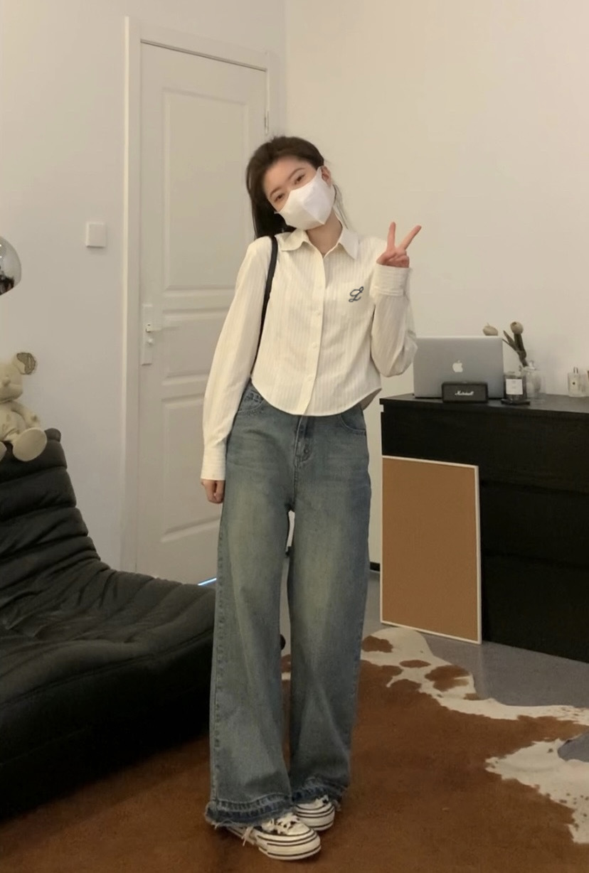 한국 스타일 수 놓은 짧은 파란색 줄무늬 셔츠 여성 셔츠 2024 봄과 가을 새로운 디자인 센스 내베이스 탑스토어 가기