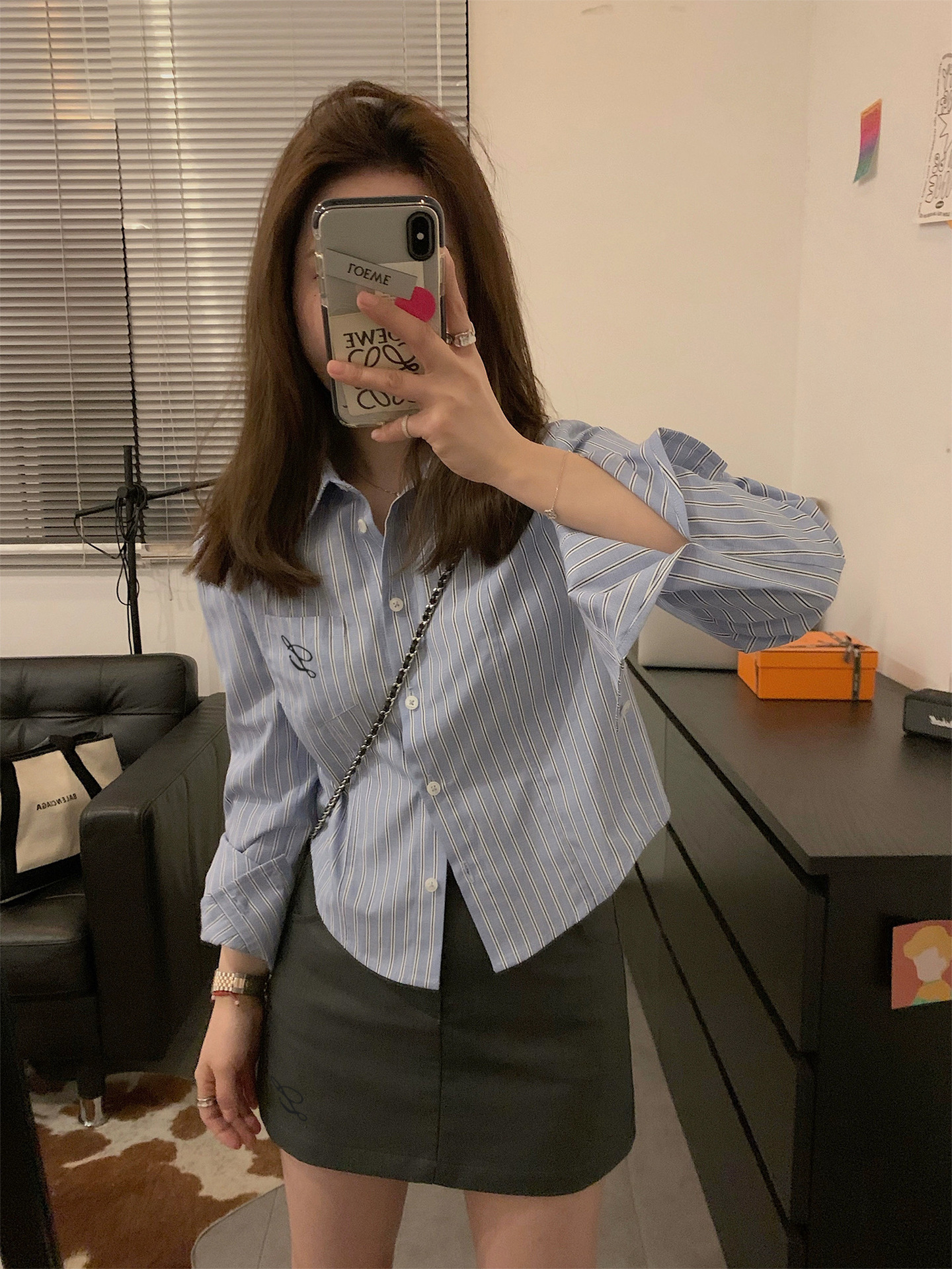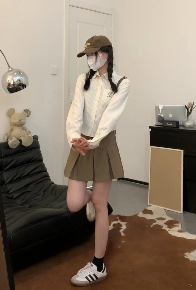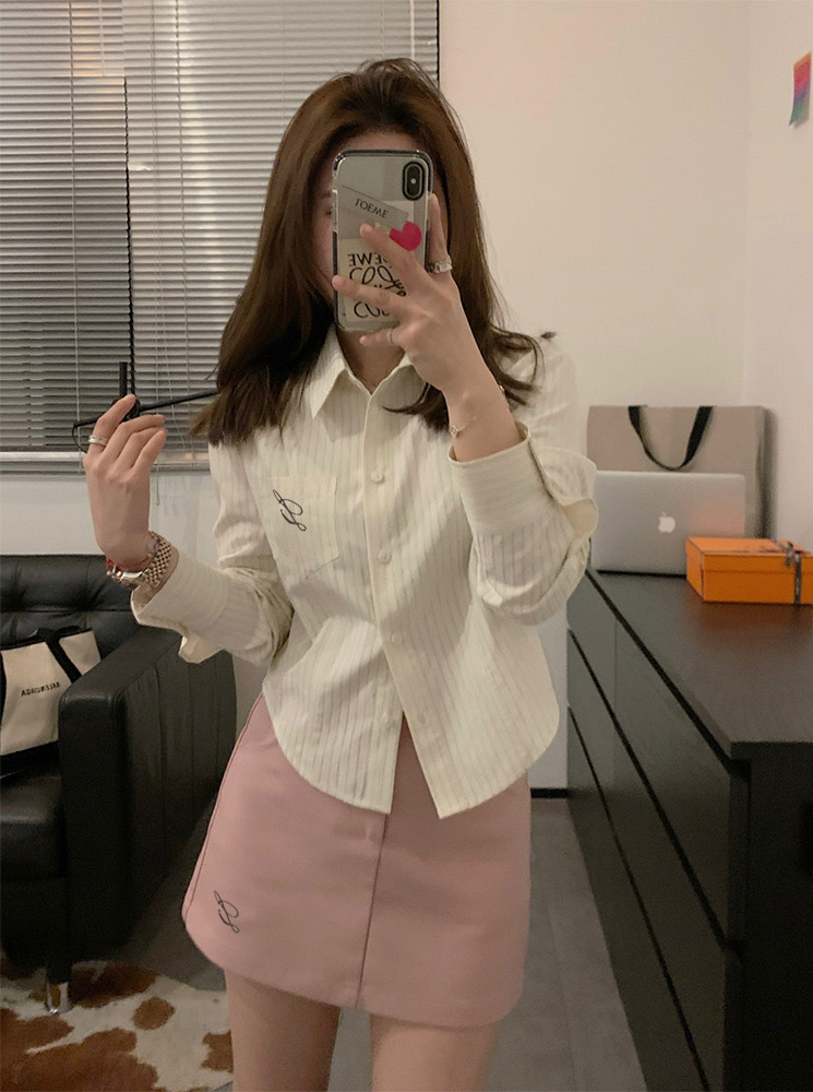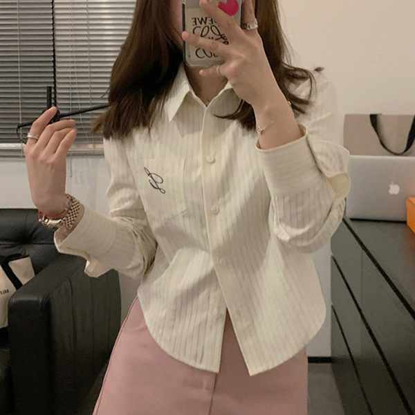 한국 스타일 수 놓은 짧은 파란색 줄무늬 셔츠 여성 셔츠 2024 봄과 가을 새로운 디자인 센스 내베이스 탑
