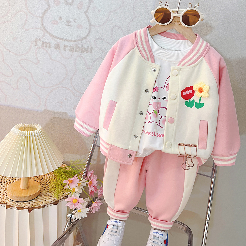 2024 새로운 소녀 봄 세트 서양식 아기 봄과 가을 캐주얼 만화 야구 세트 3 피스 세트